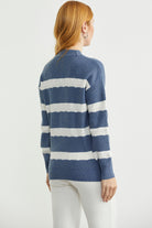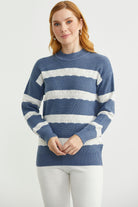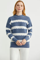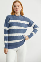 Dik Yaka Çizgili Triko Kazak - Indigo