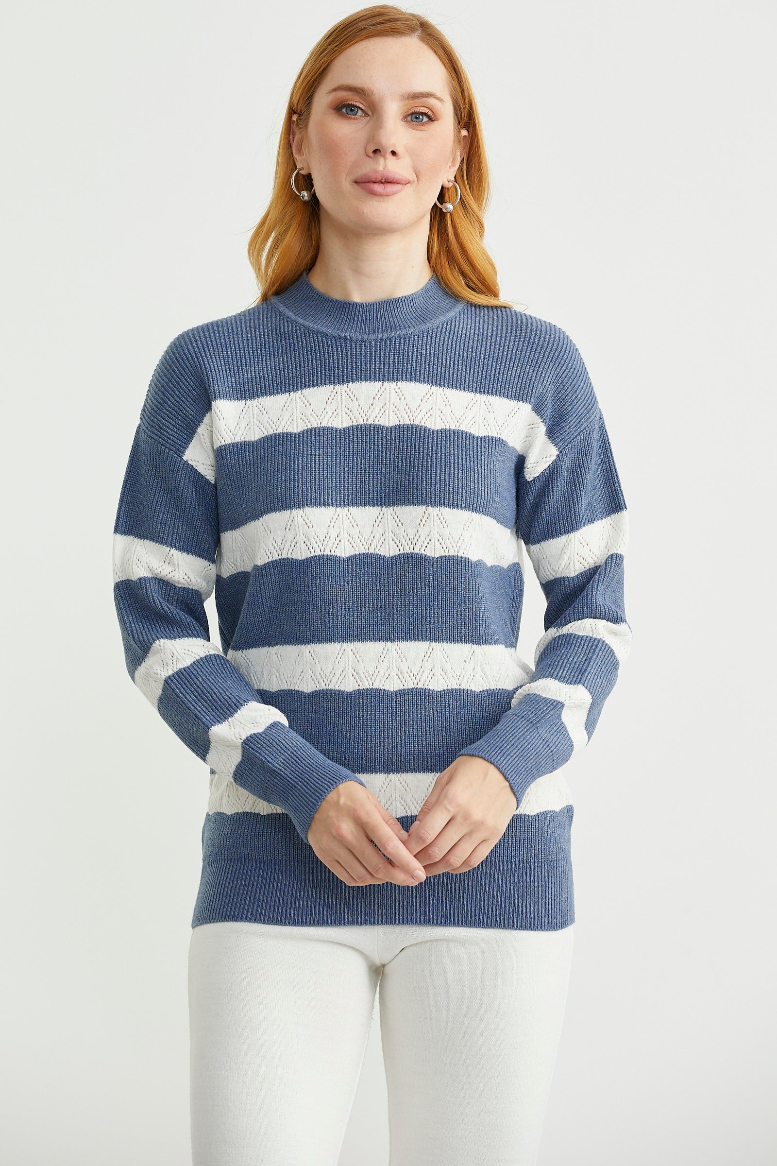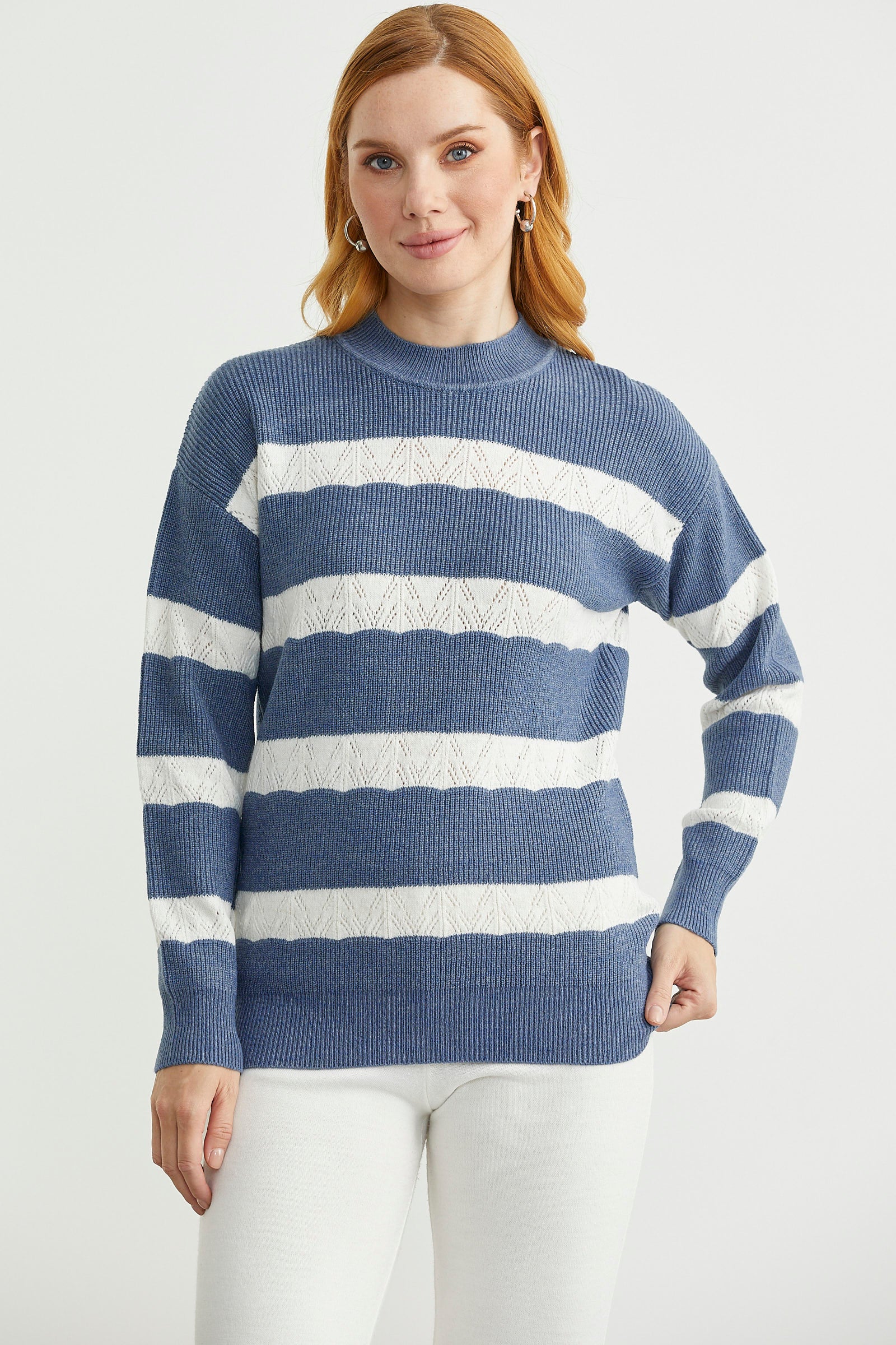 Yüksek yuvarlak yaka triko kazak, kontrast çizgili ve delik desenlidir.