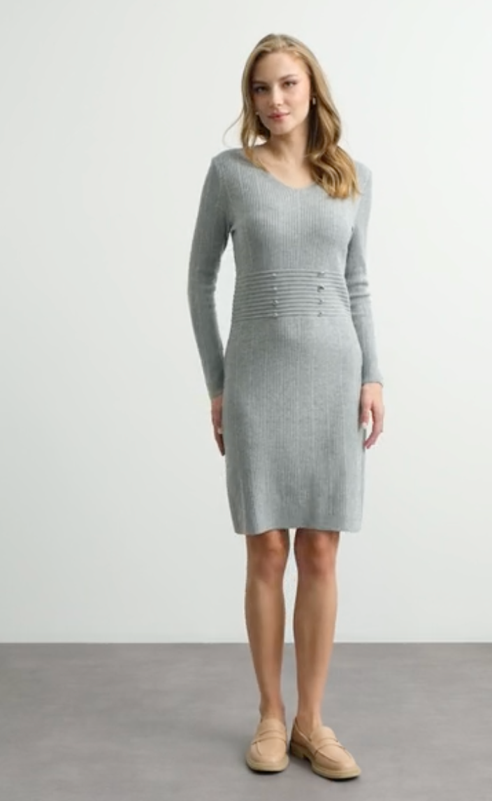 V yaka lastik örme triko elbise. Belde nervür detayına sahip. Diz boyu. Metal düğme ile hareketlendirilmiş.