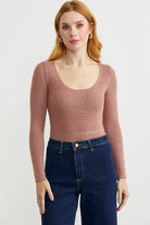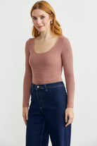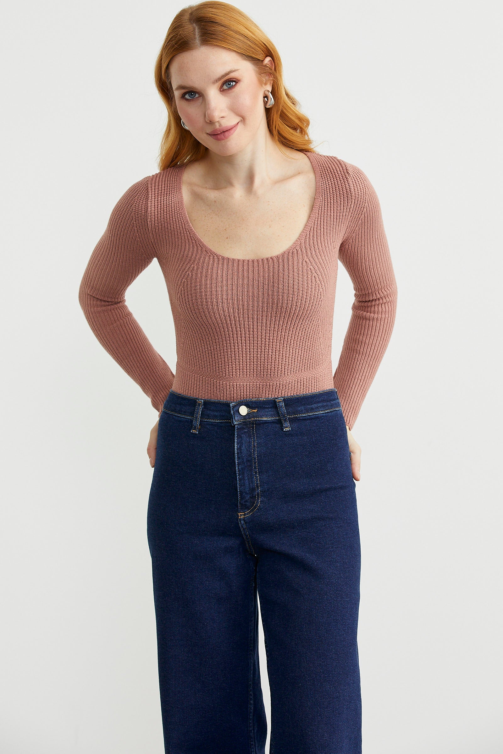 Oval yakalı, uzun kol, vücudu saran body. Alt kısmı çıtçıtlıdır.