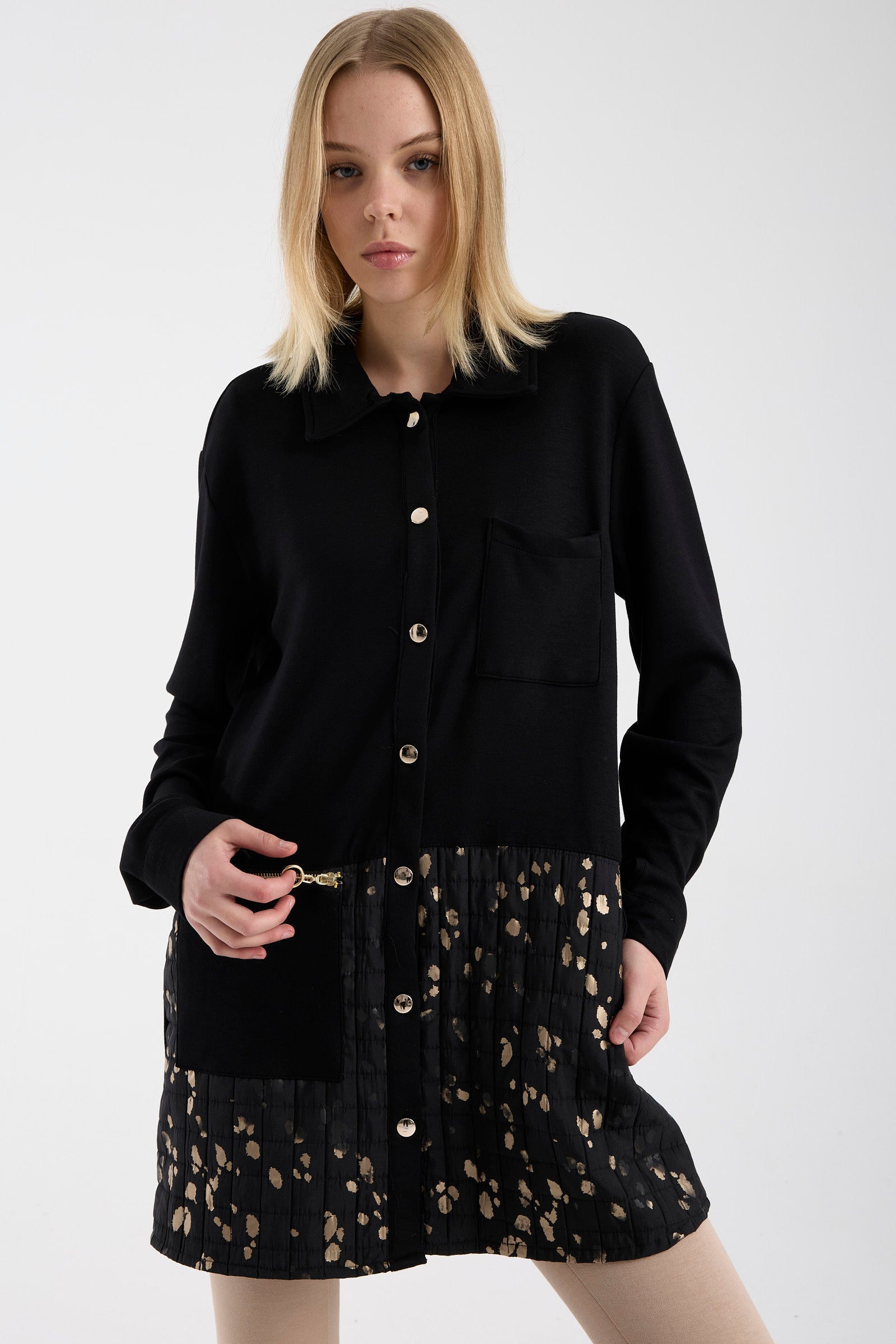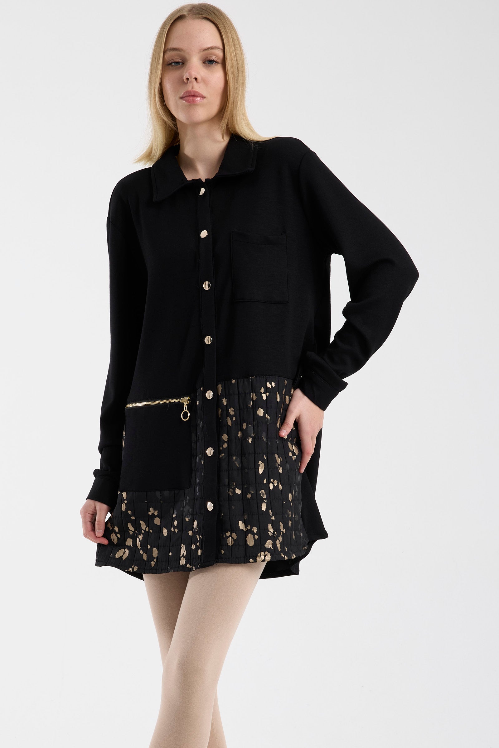 Varak kumaş kombinli, metal çıtçıt kapamalı, cep detaylı, uzun tunik.