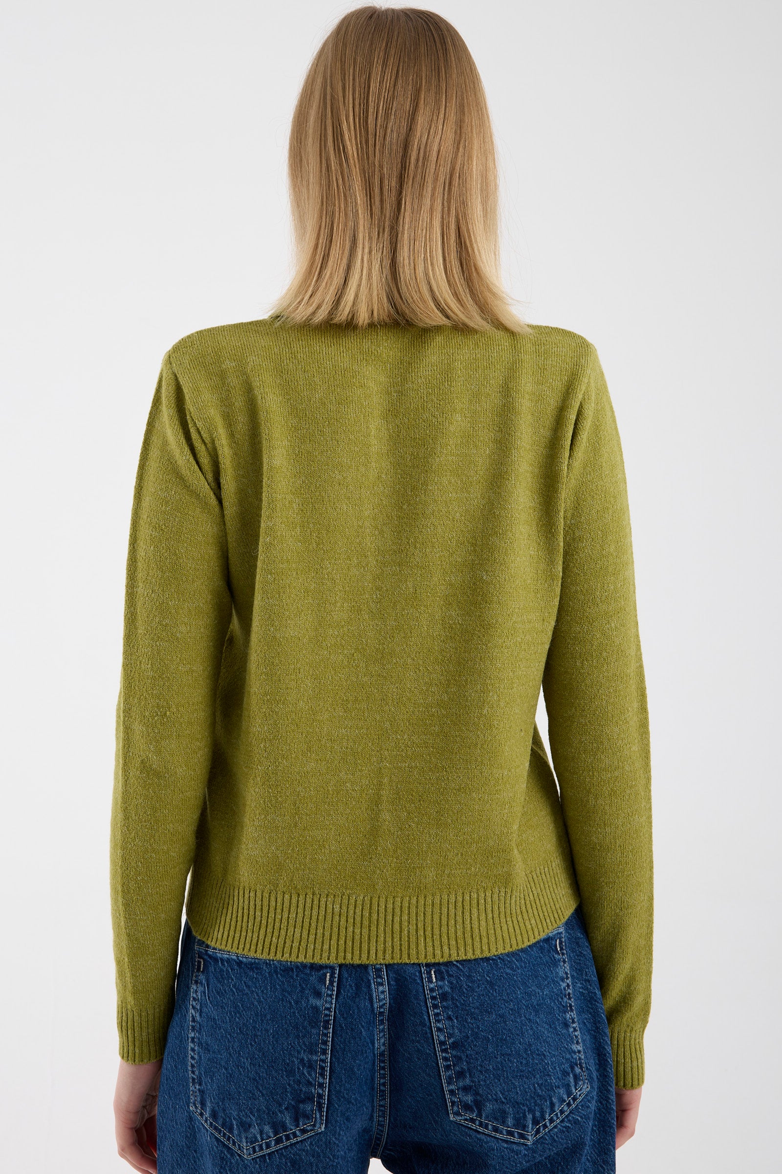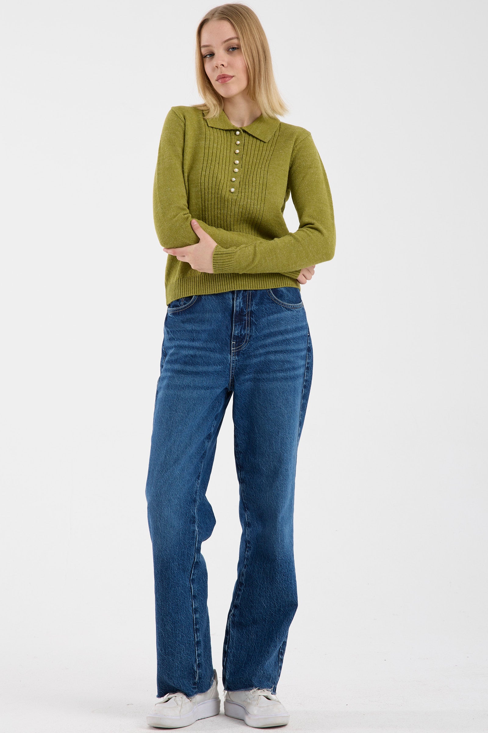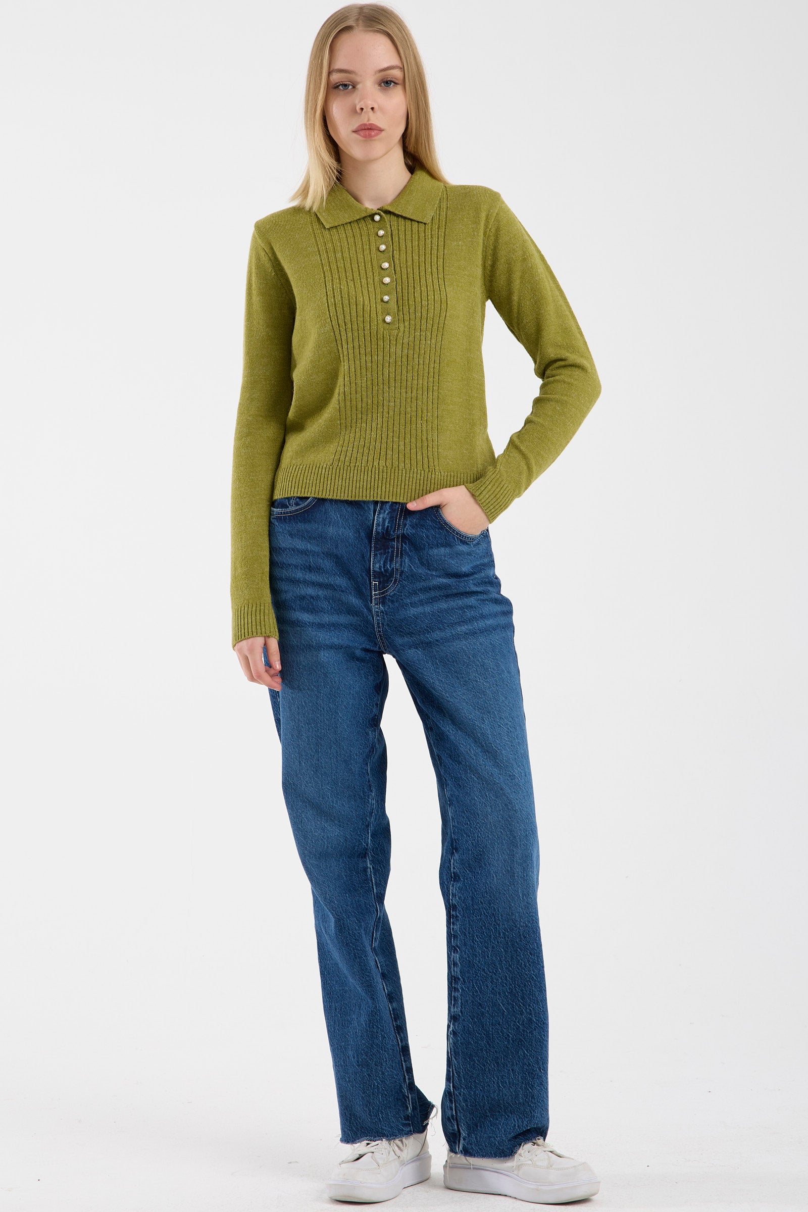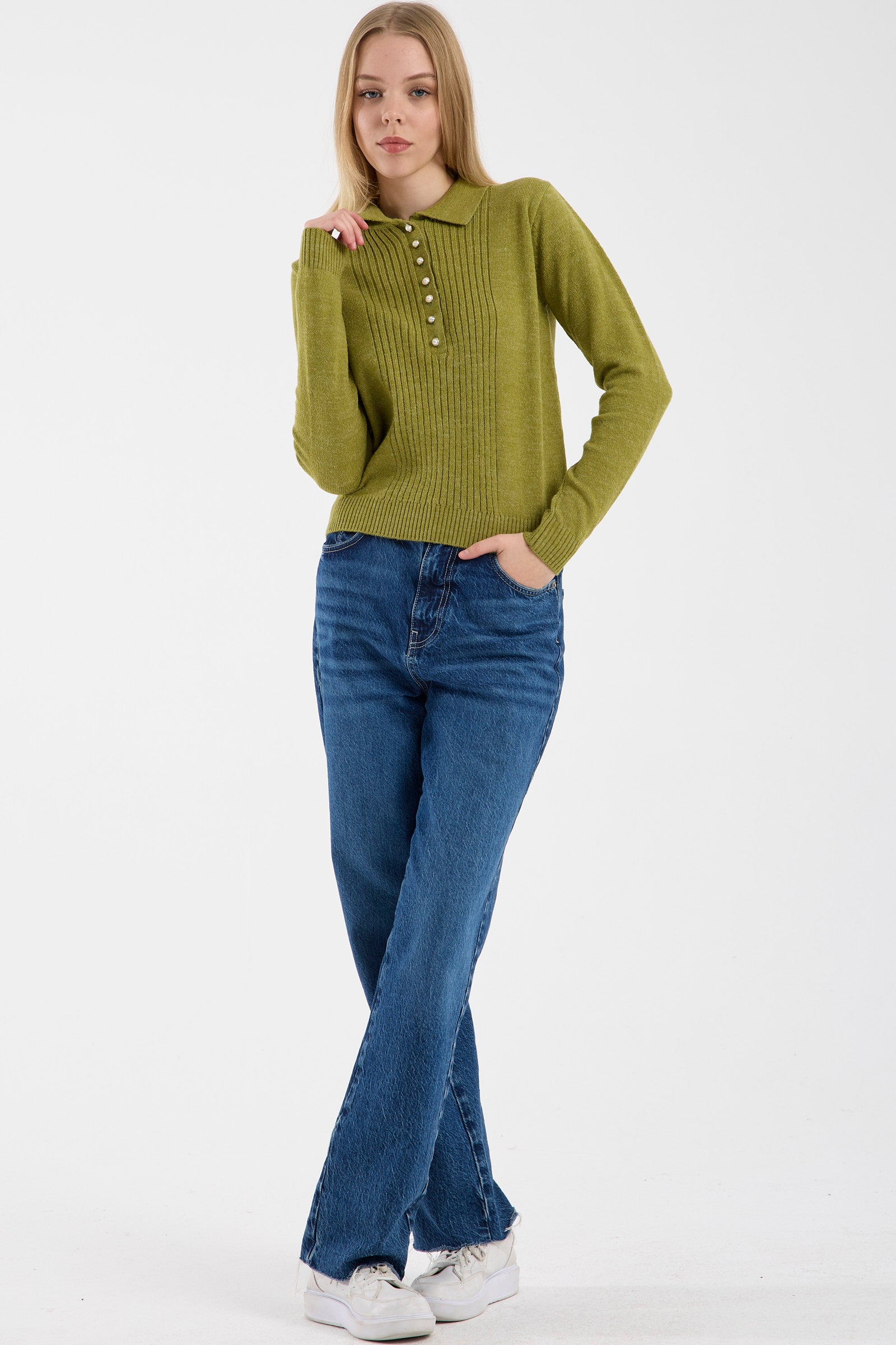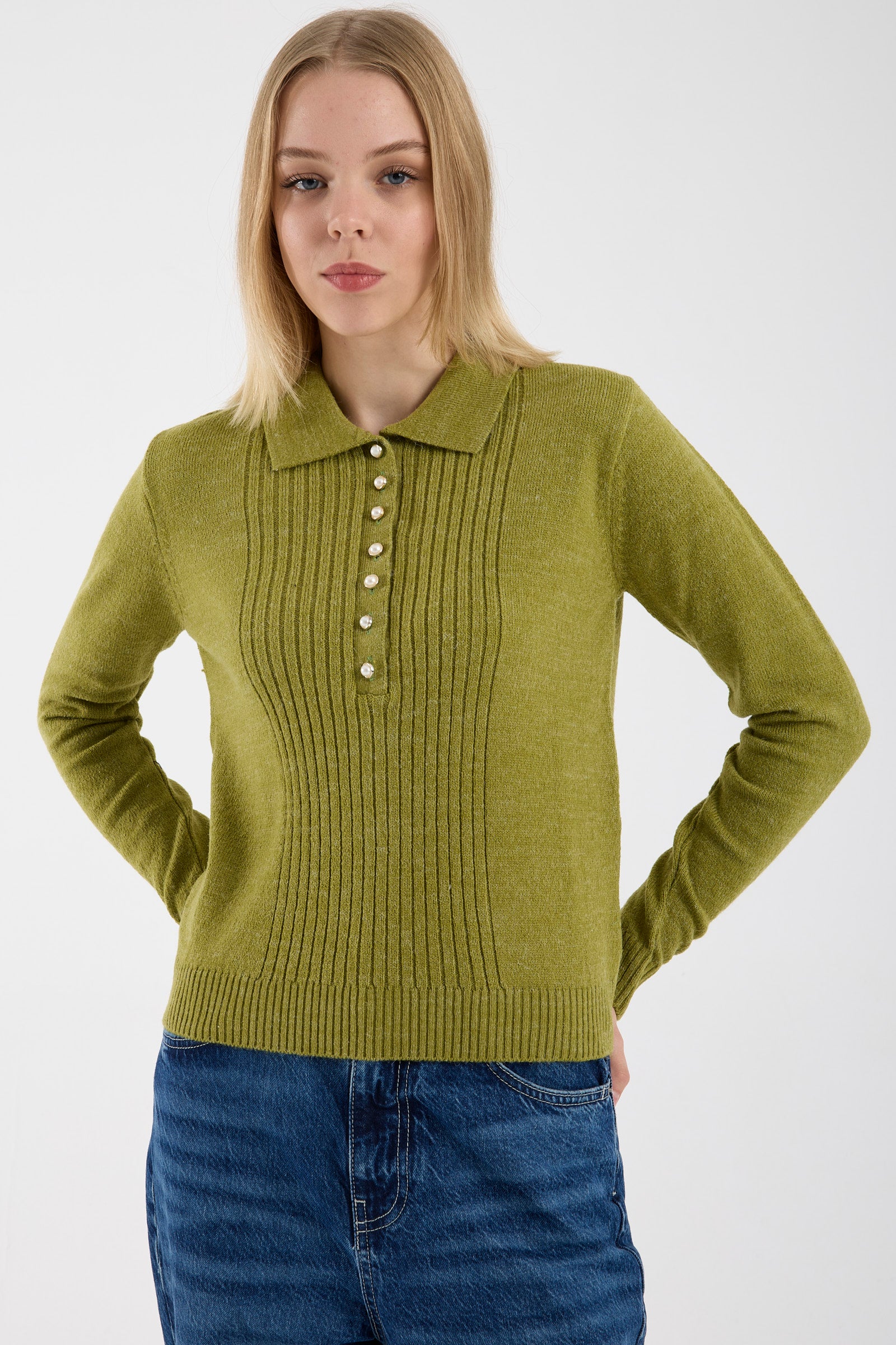 İnci Düğmeli Yakalı Triko Kazak - Yeşil