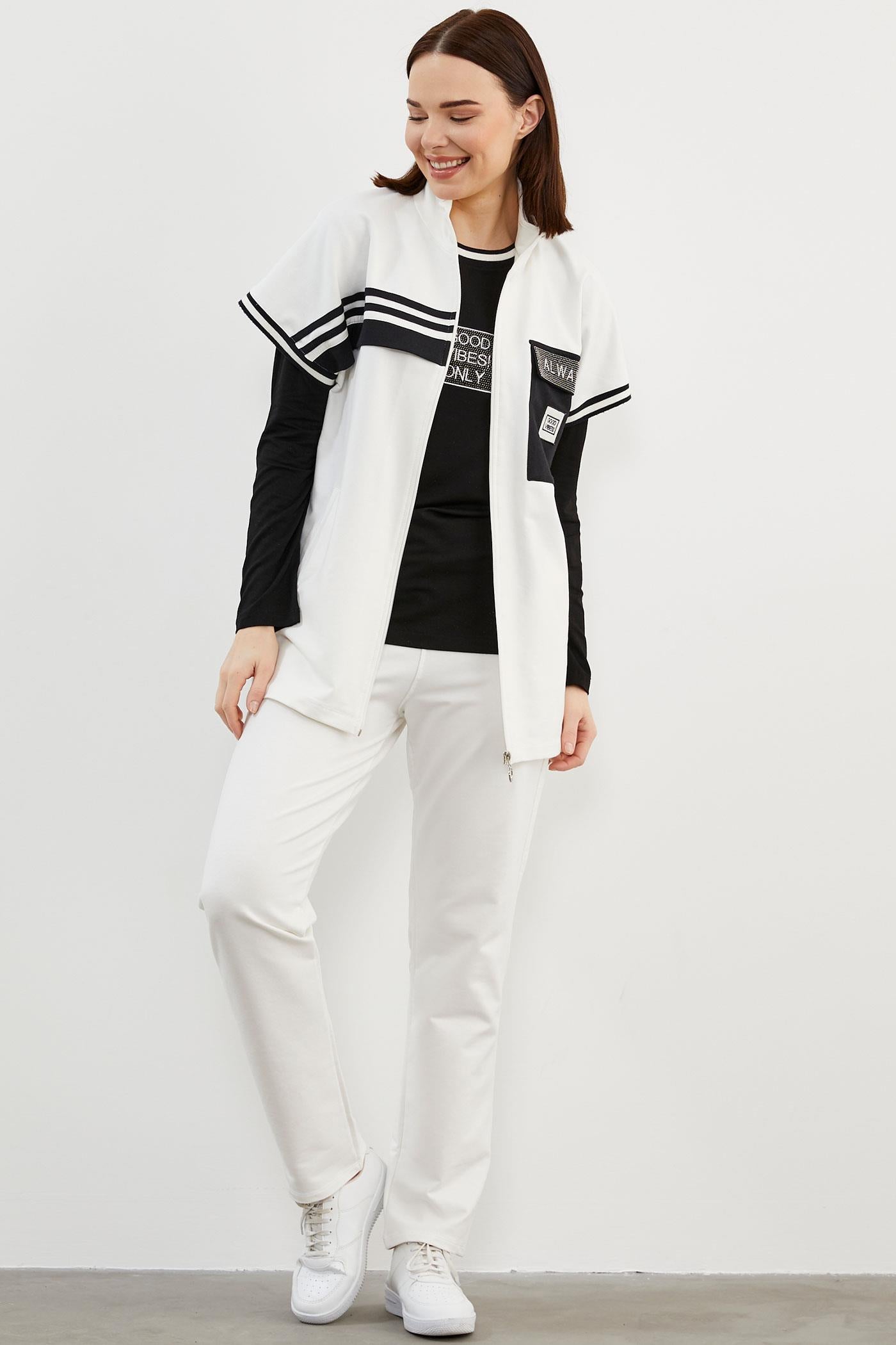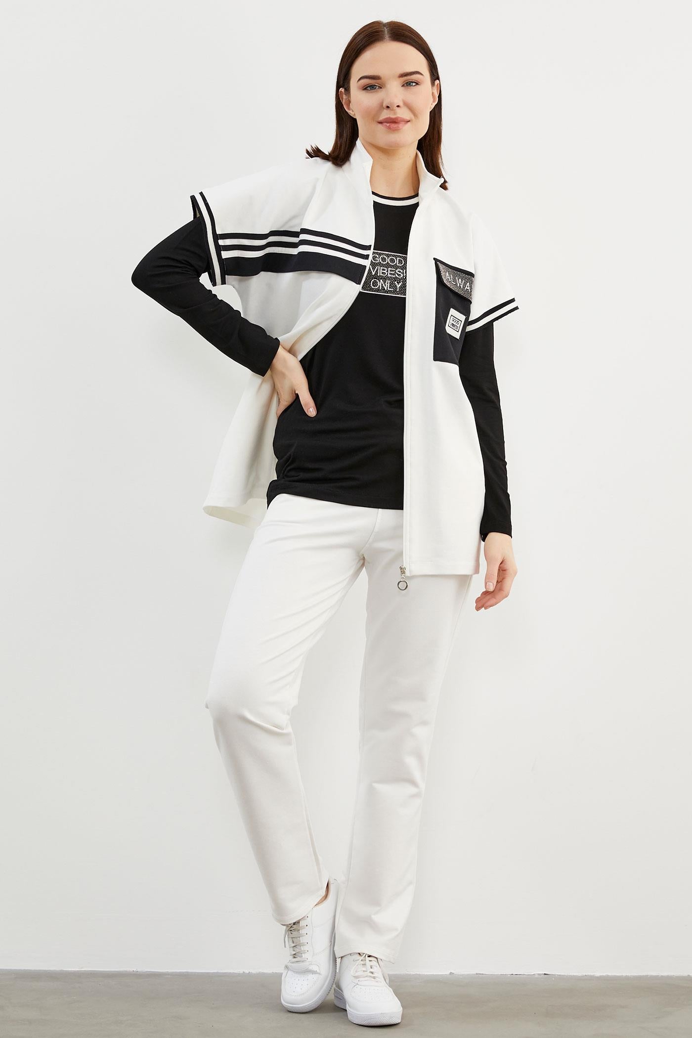 Birlikte giyebileceğin veya diğer favori stillerinle eşleştirebileceğin dik yakalı cepli yelek, uzun kollu taş detaylı sweat ve boru paça eşofman altından oluşan takım ile sportif görünümler yaratın.