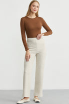 Yumuşak dokulu triko pantolon, rahat ve şık bir görünüm sunuyor. Elastik beli ve yanlardaki saç örgü detayıyla öne çıkıyor.