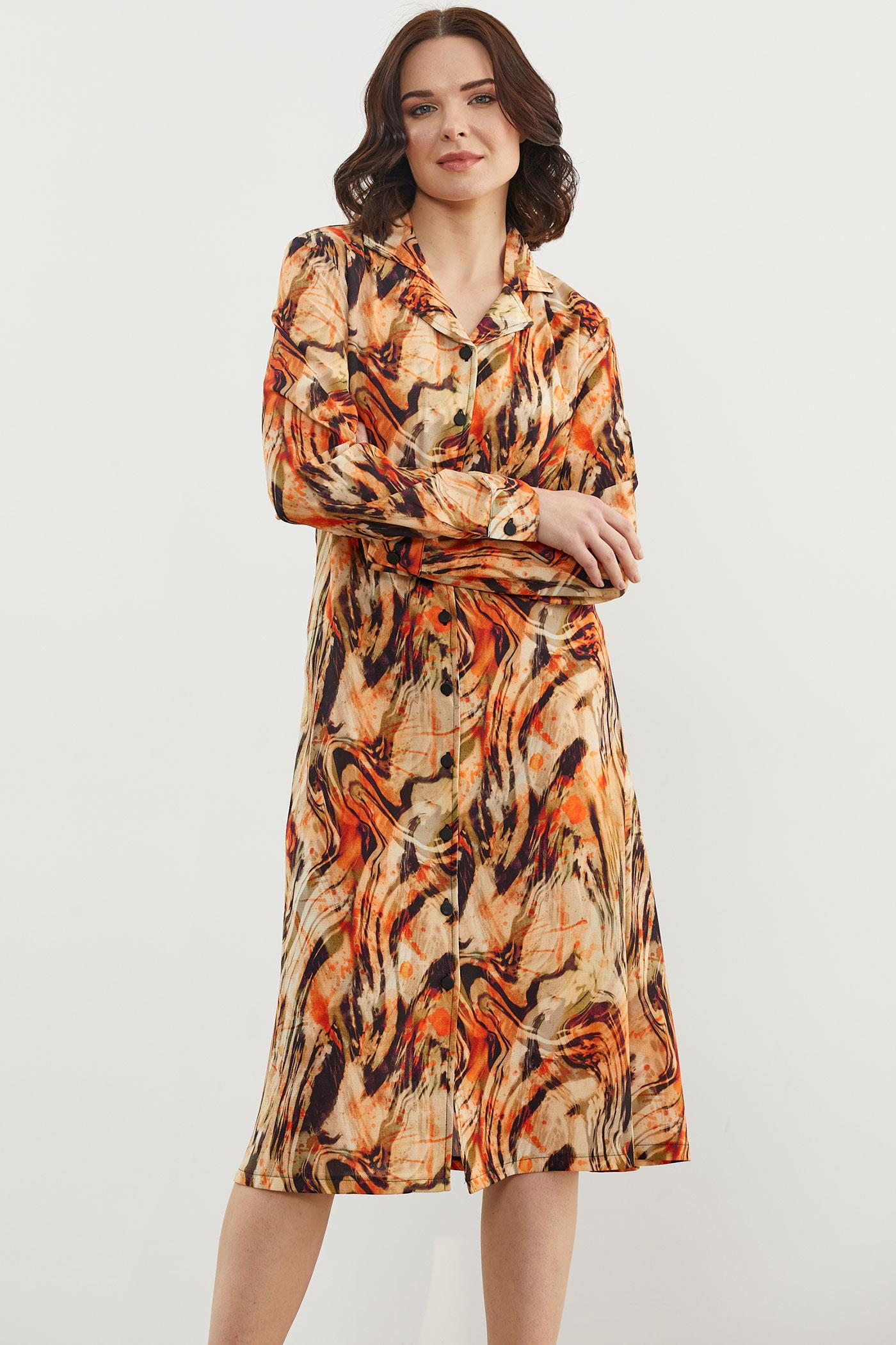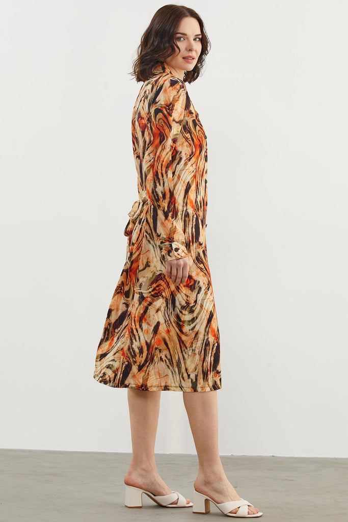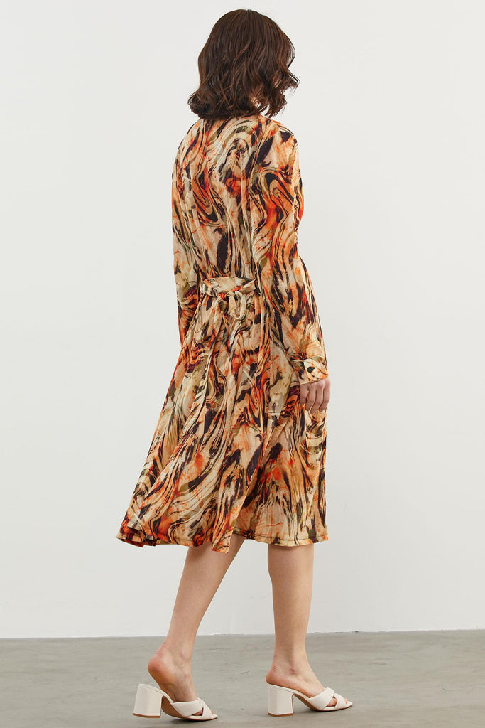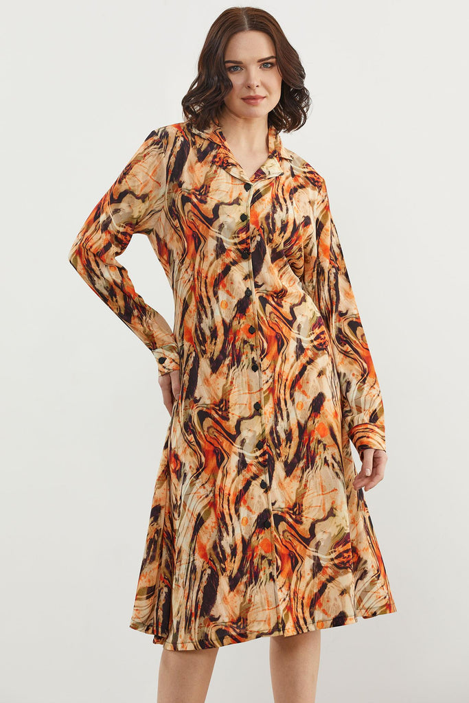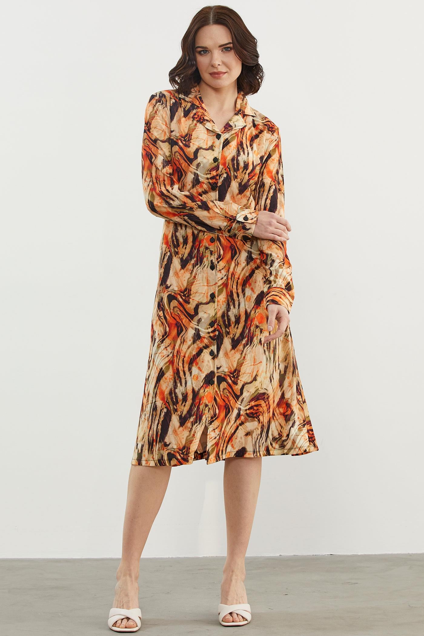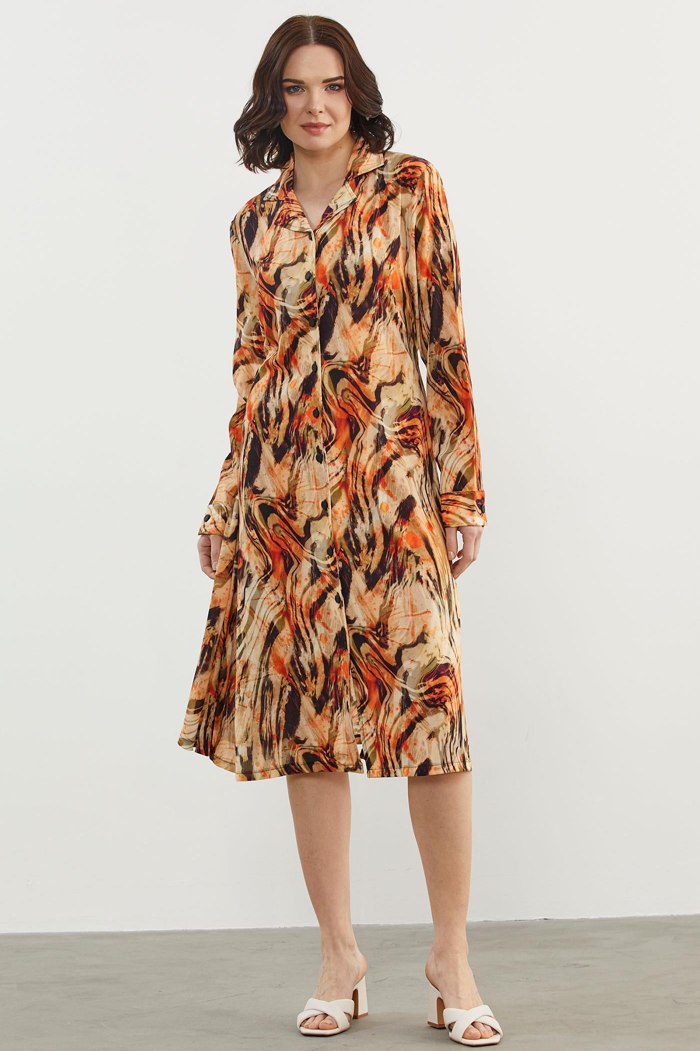 Yaprak Desenli Renkli Gömlek Elbise - Oranj