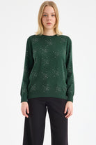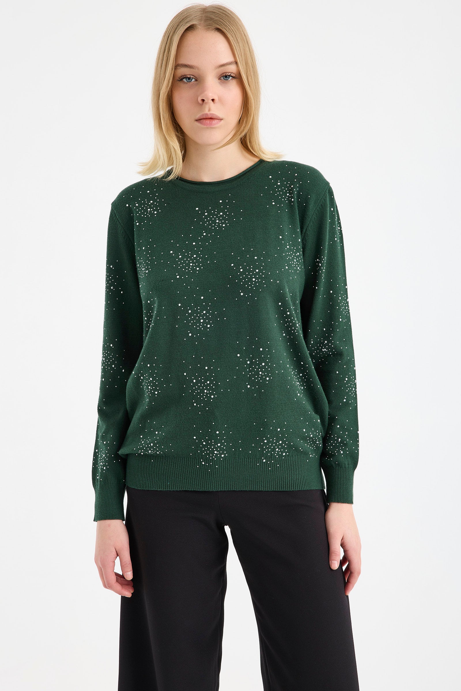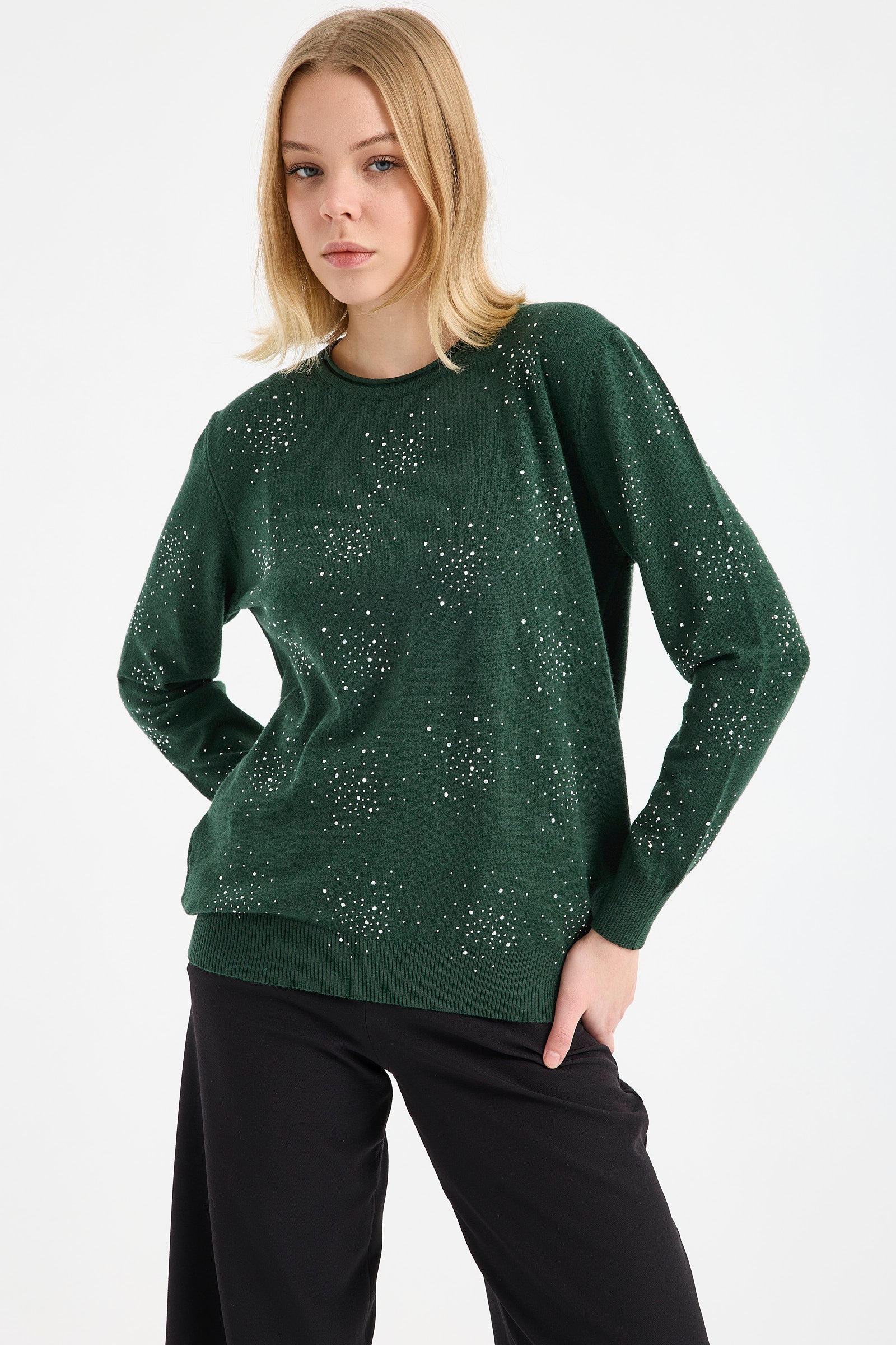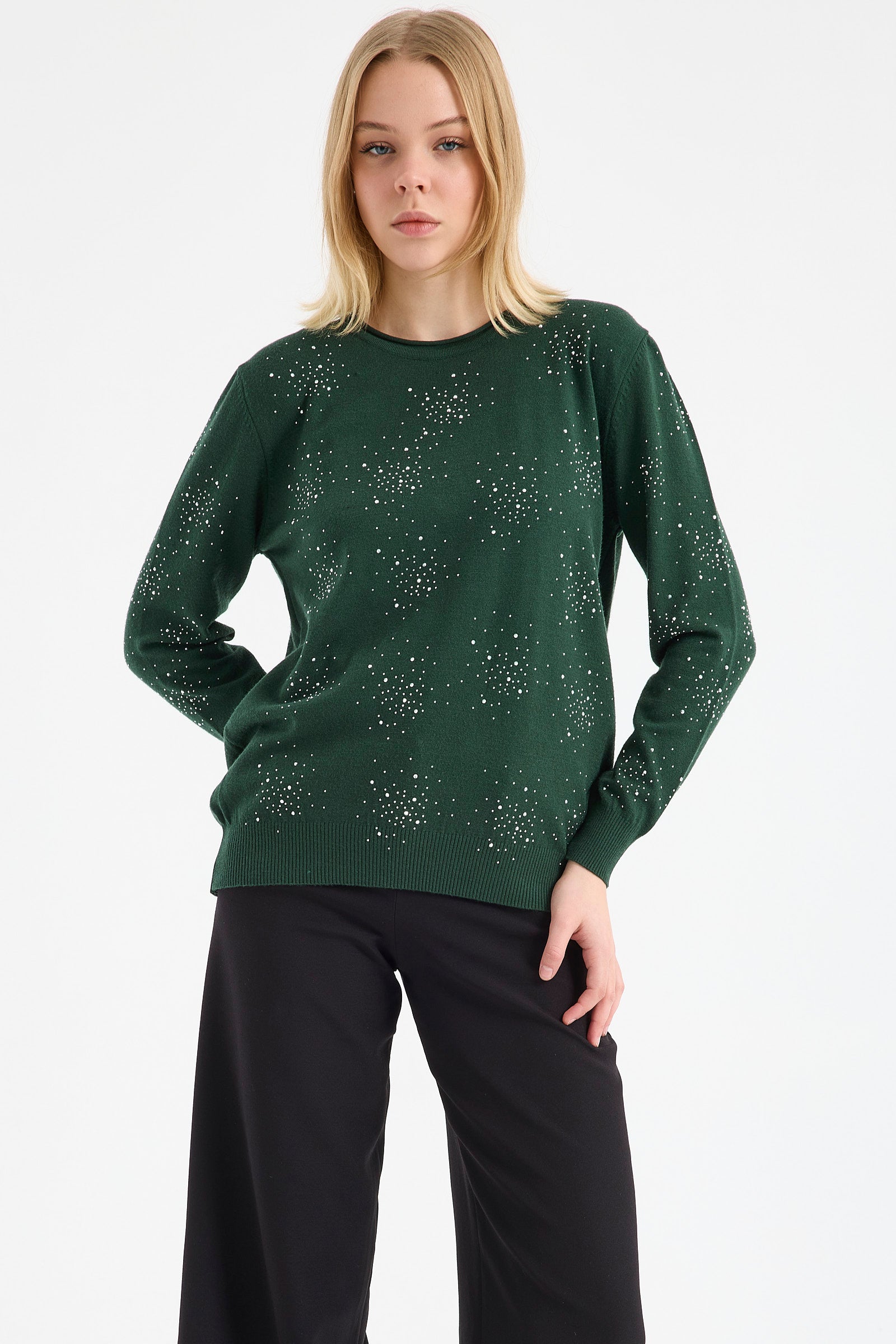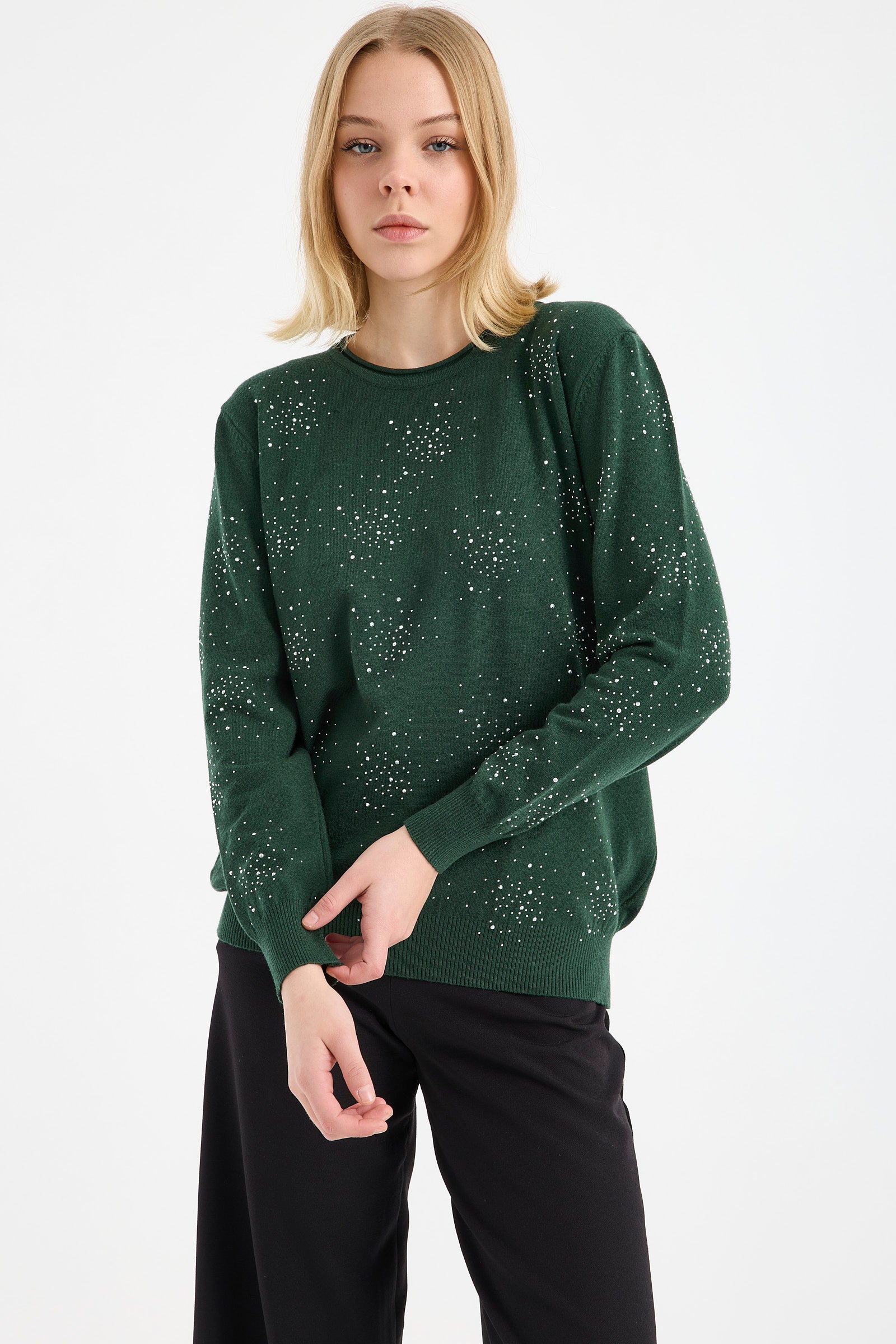 Yuvarlak Yaka Taşlı Triko Kazak - Zümrüt