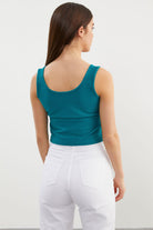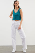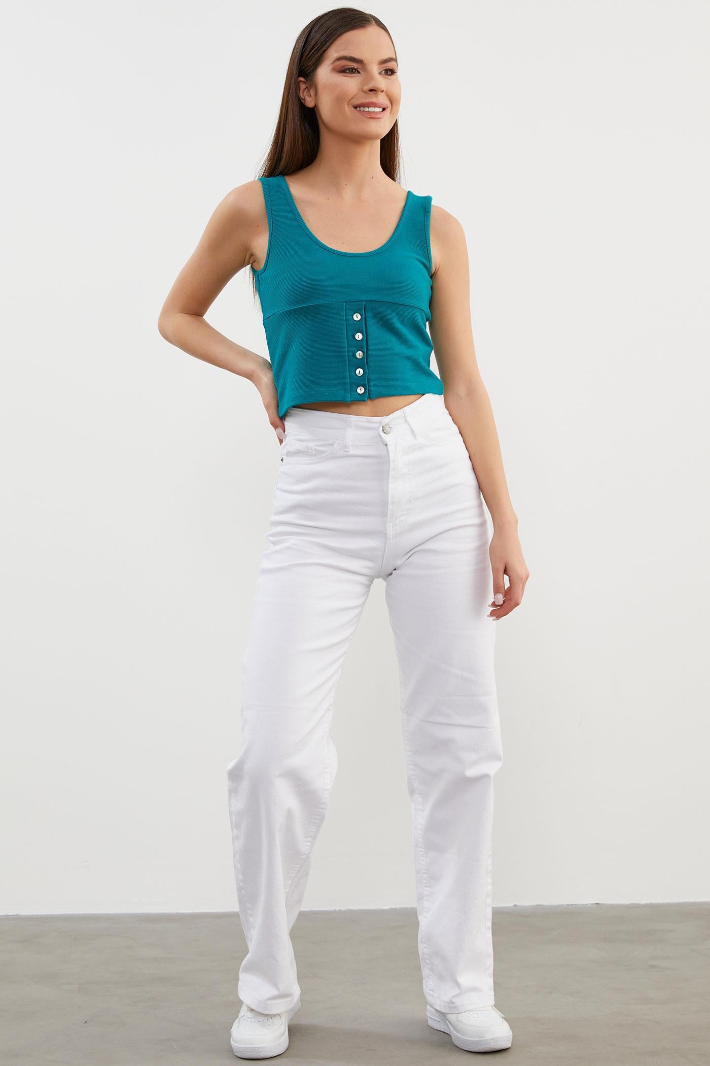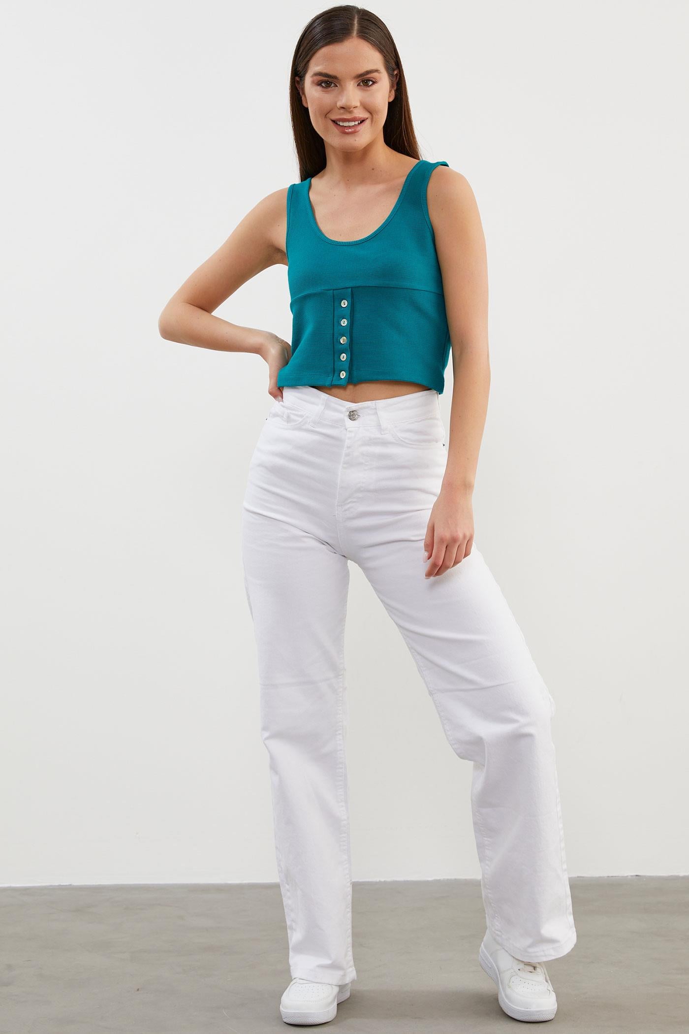 Askılı Düğme Detaylı Ribana Crop Tişört - Petrol