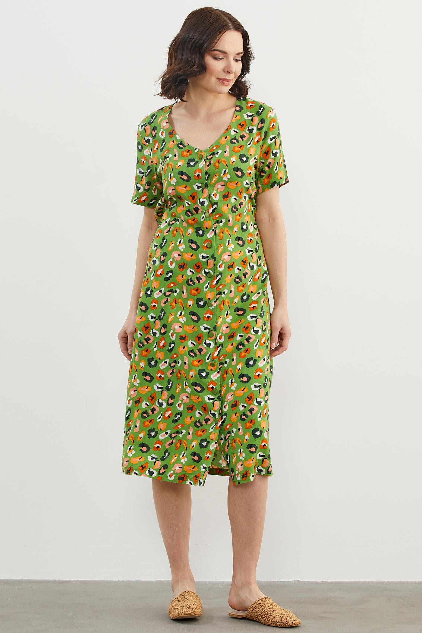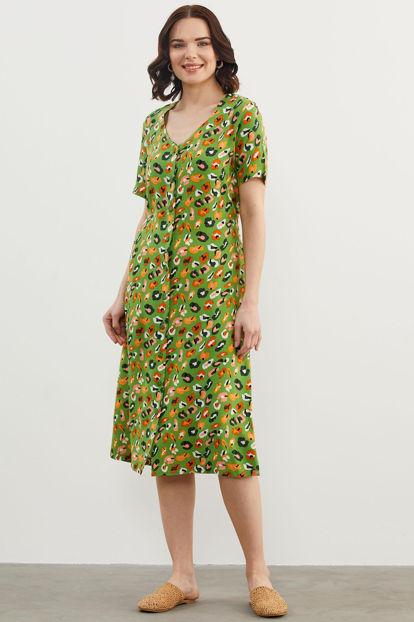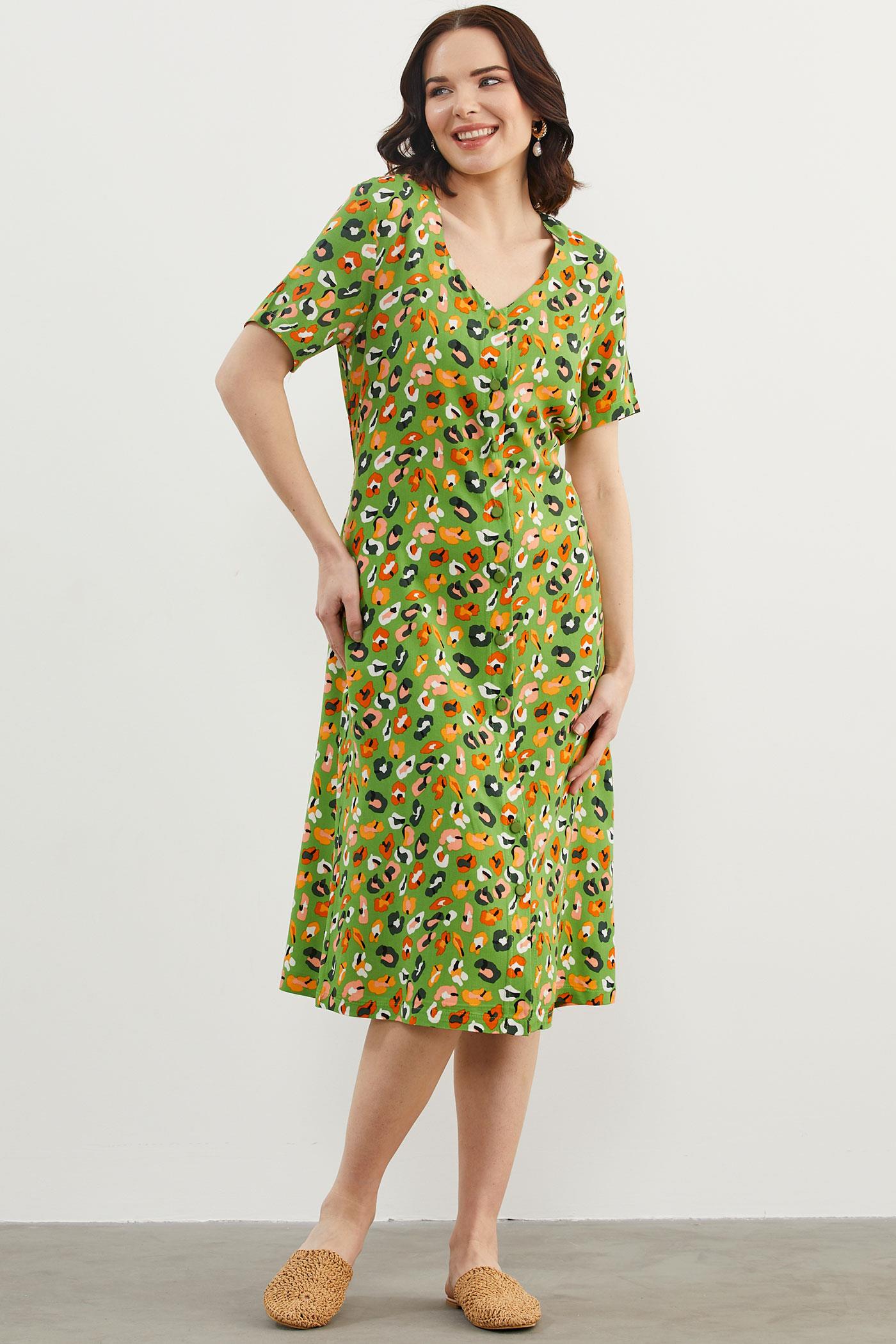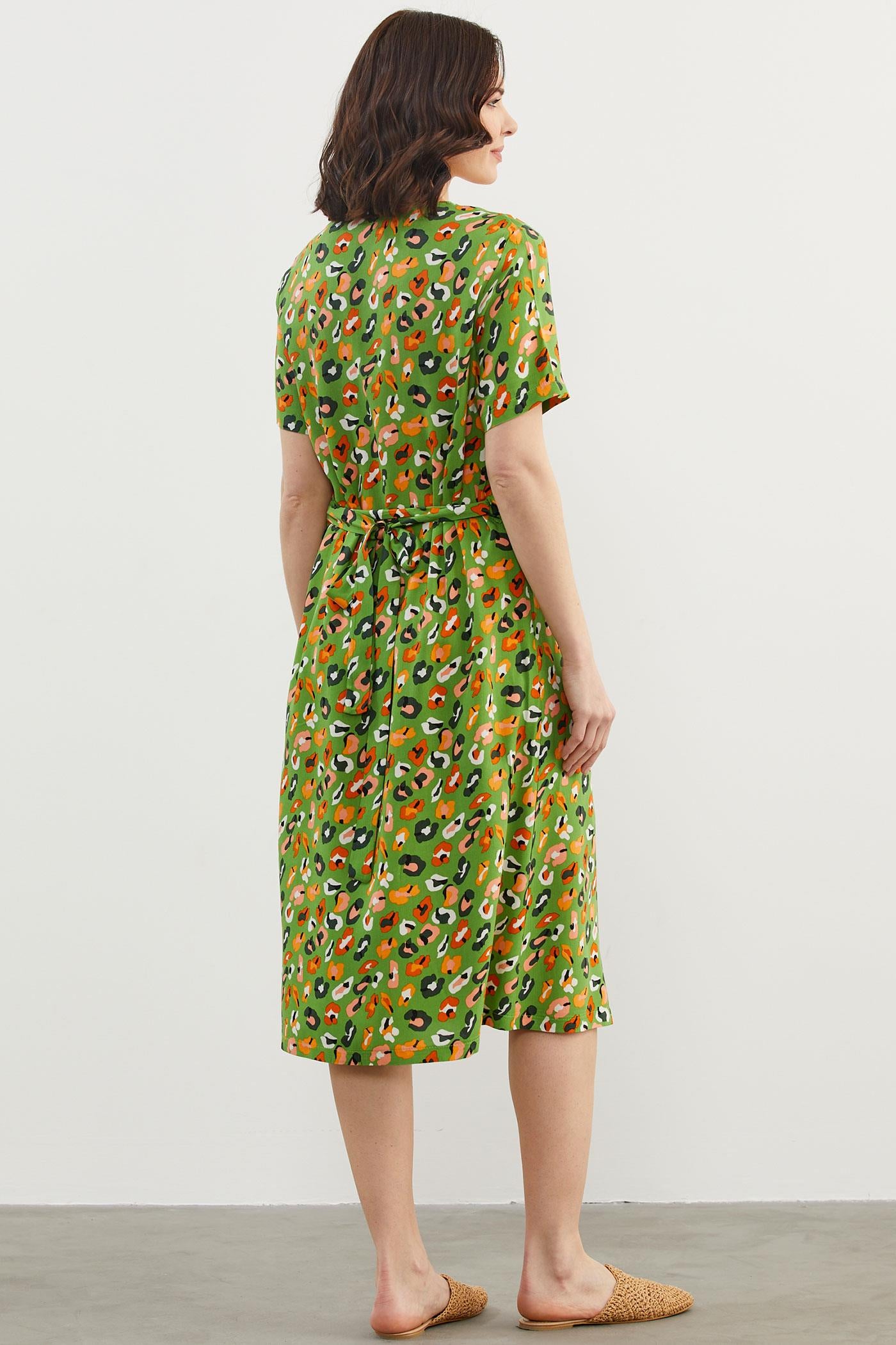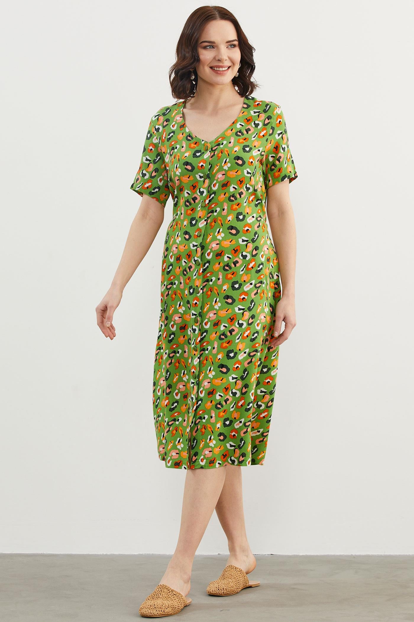 Kısa kollu, v yaka elbise desenli formuyla hareket kazanırken, midi boyu ile zarif bir görünüm sunuyor.
