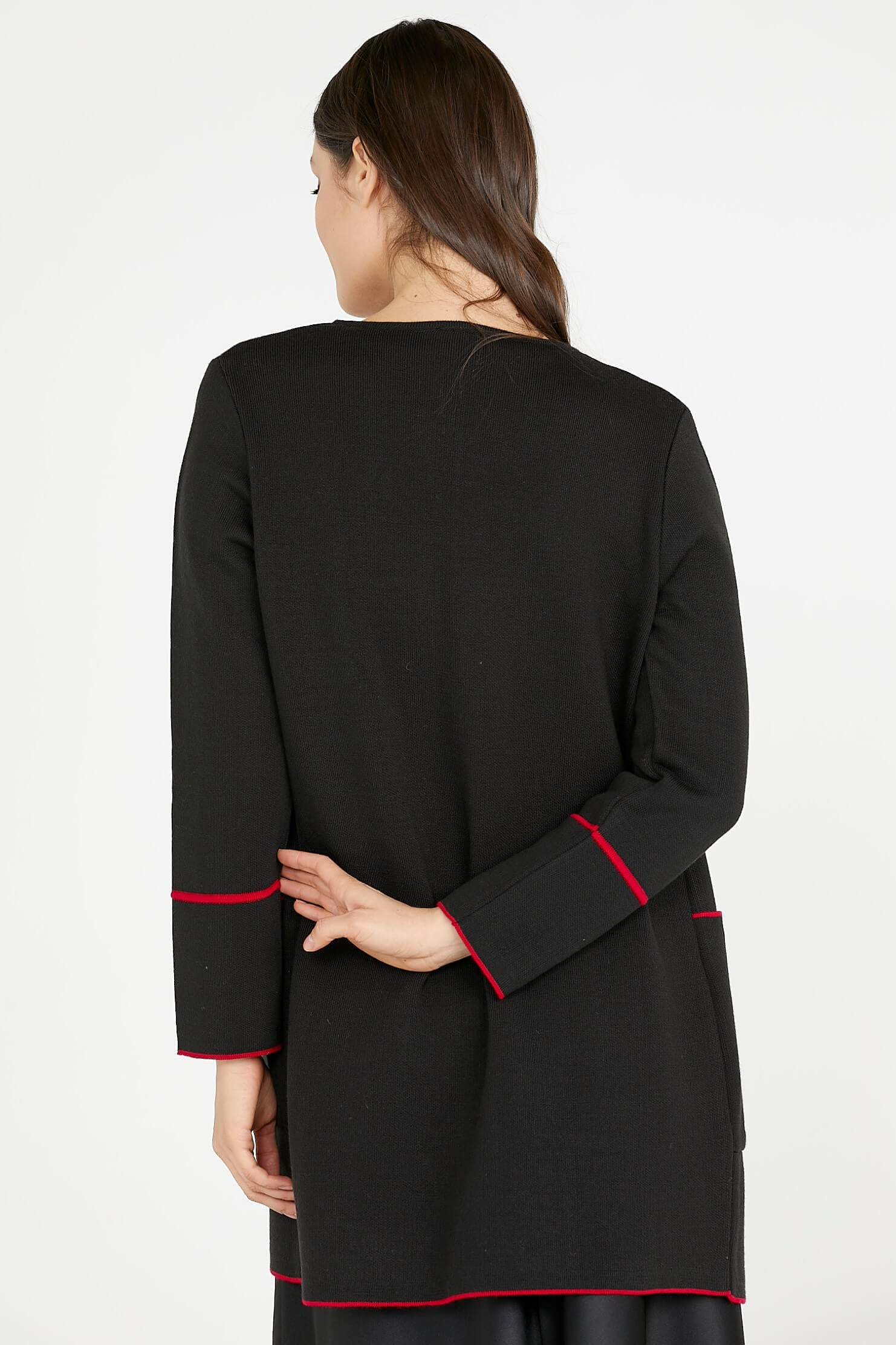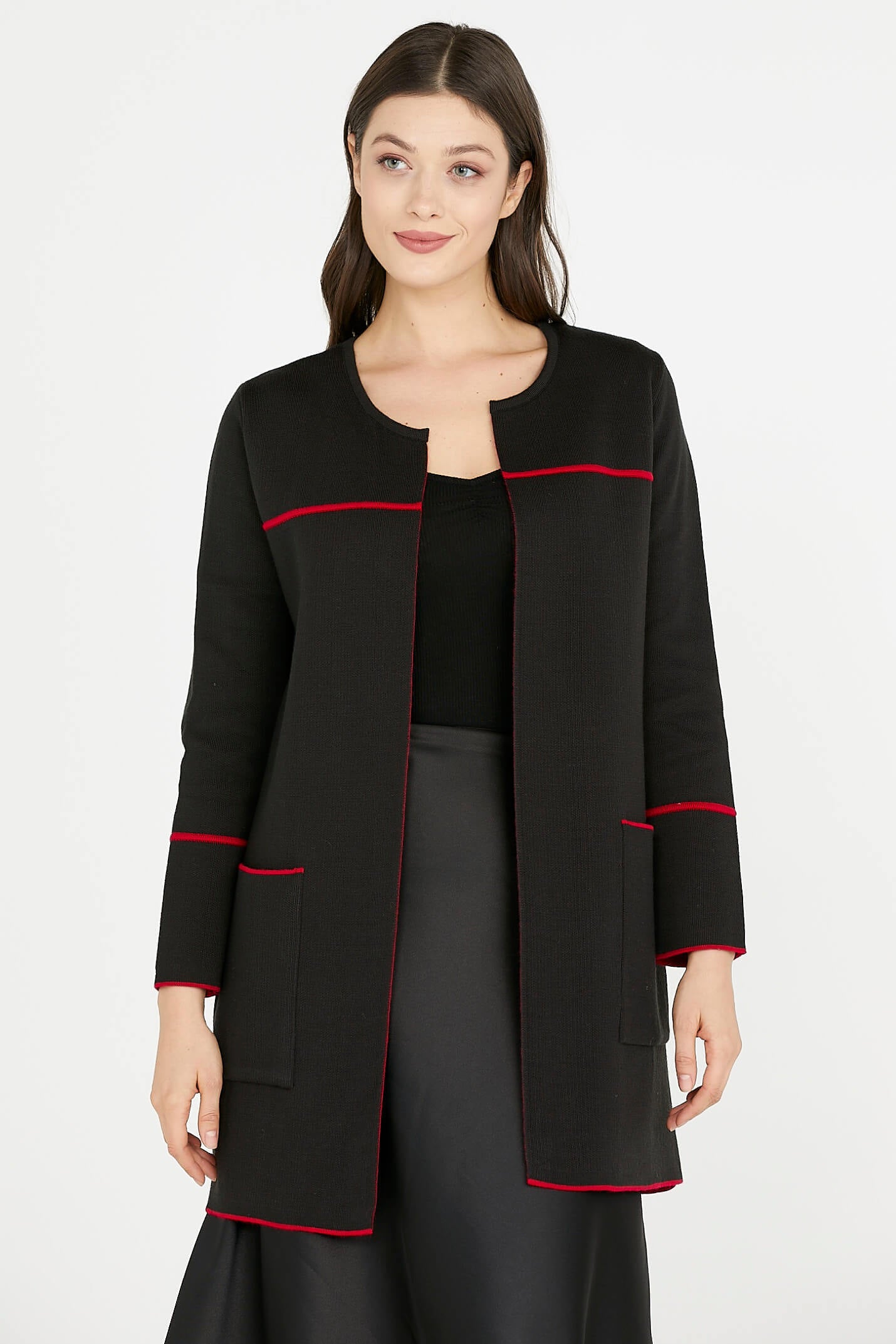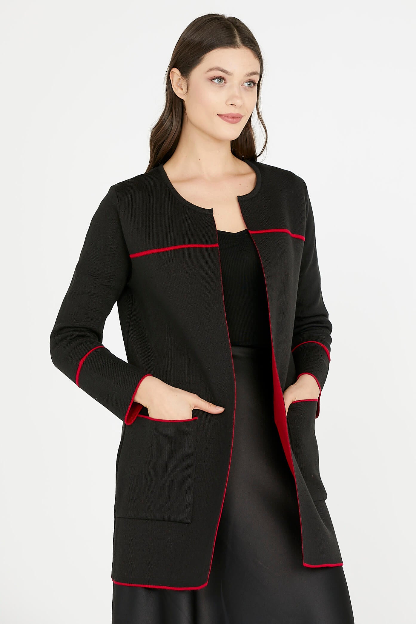 Triko ceket, dokusuyla zengin ve sıcak bir stile gönderme yapıyor. Sıfır yakalı ve uzun kollu bu tasarım, yama ceplerle işlevsellik kazanıyor. Triko ceket, lüks zevklerin bir yansıması olarak kendini gösteriyor ve tüm pantolon, etek modelleriyle uyum sağlıyor.