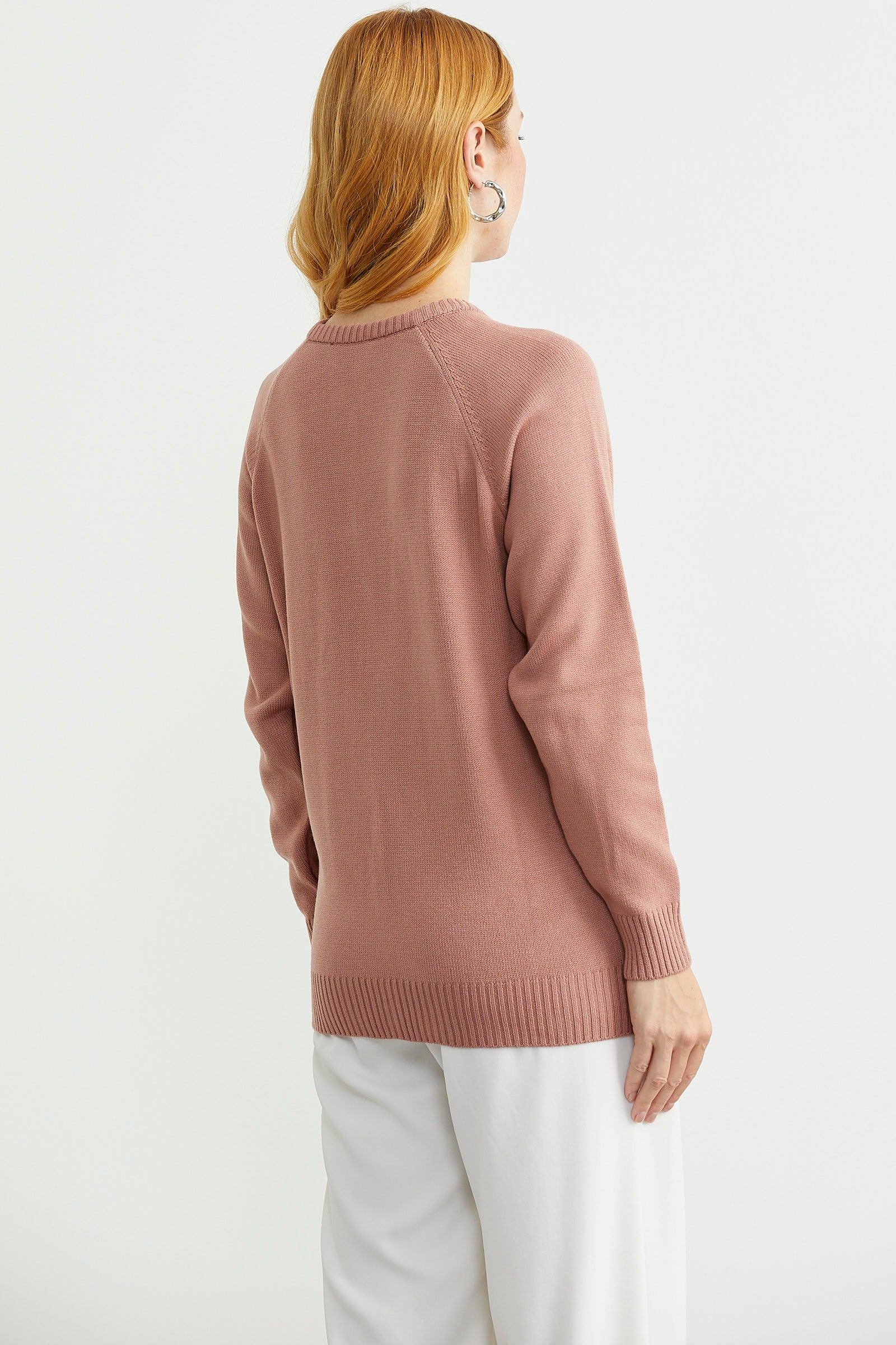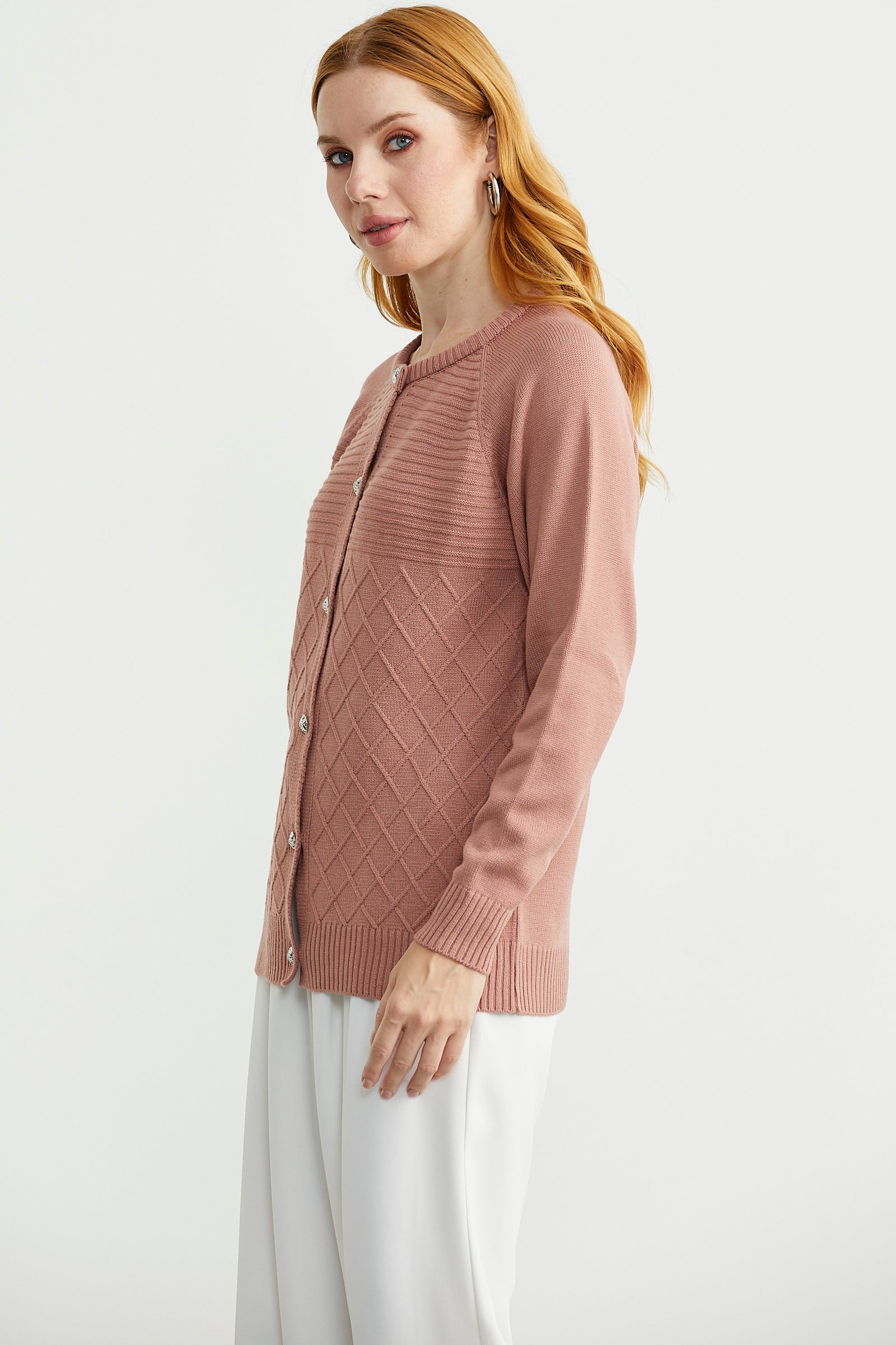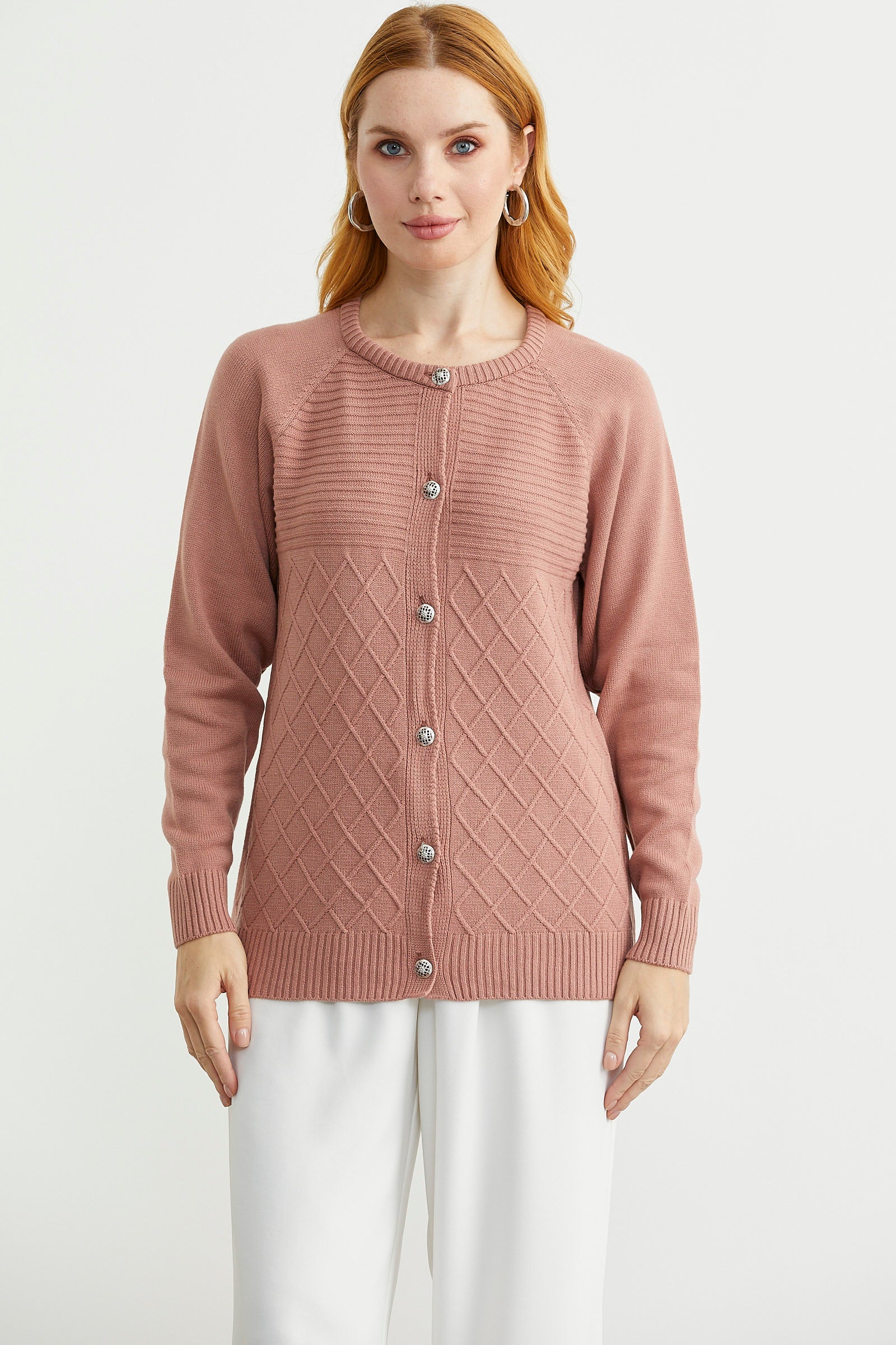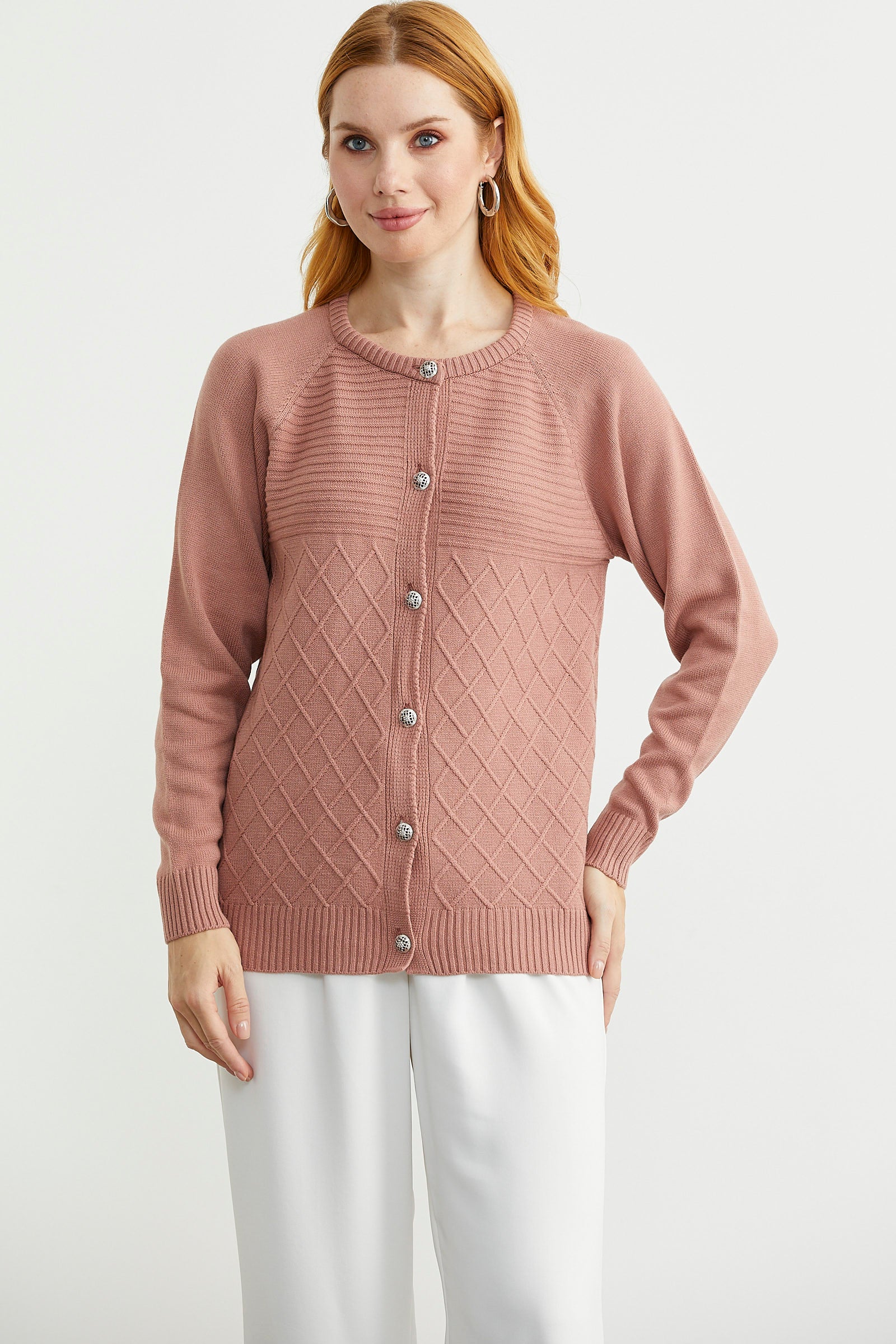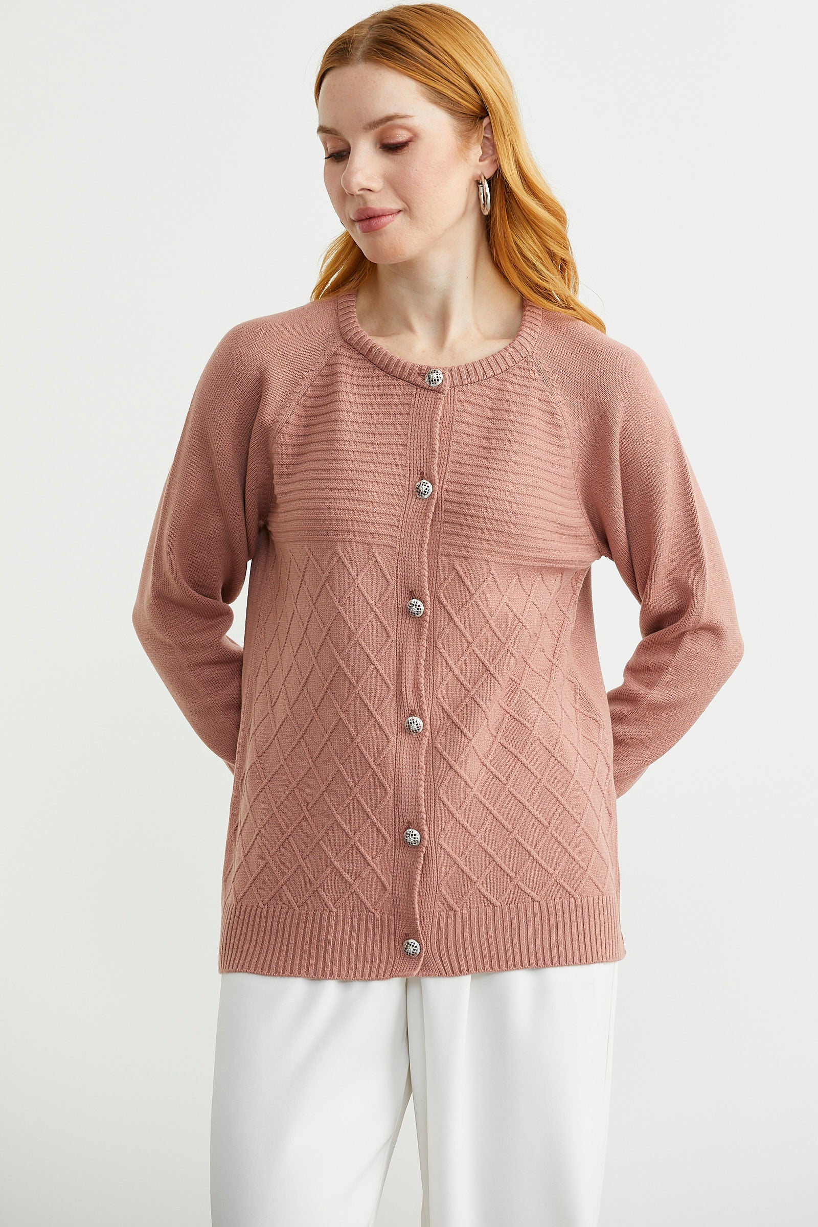 Yuvarlak yaka, metal düğme kapamalı, rahat kalıp triko hırka, Reglan kol ve motif detaylı.