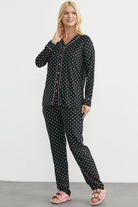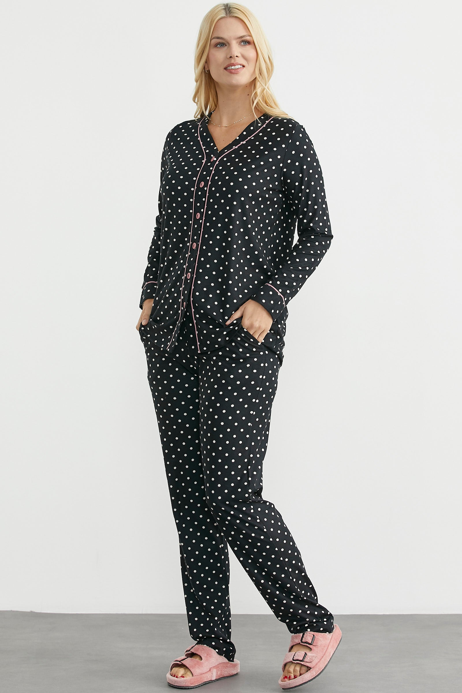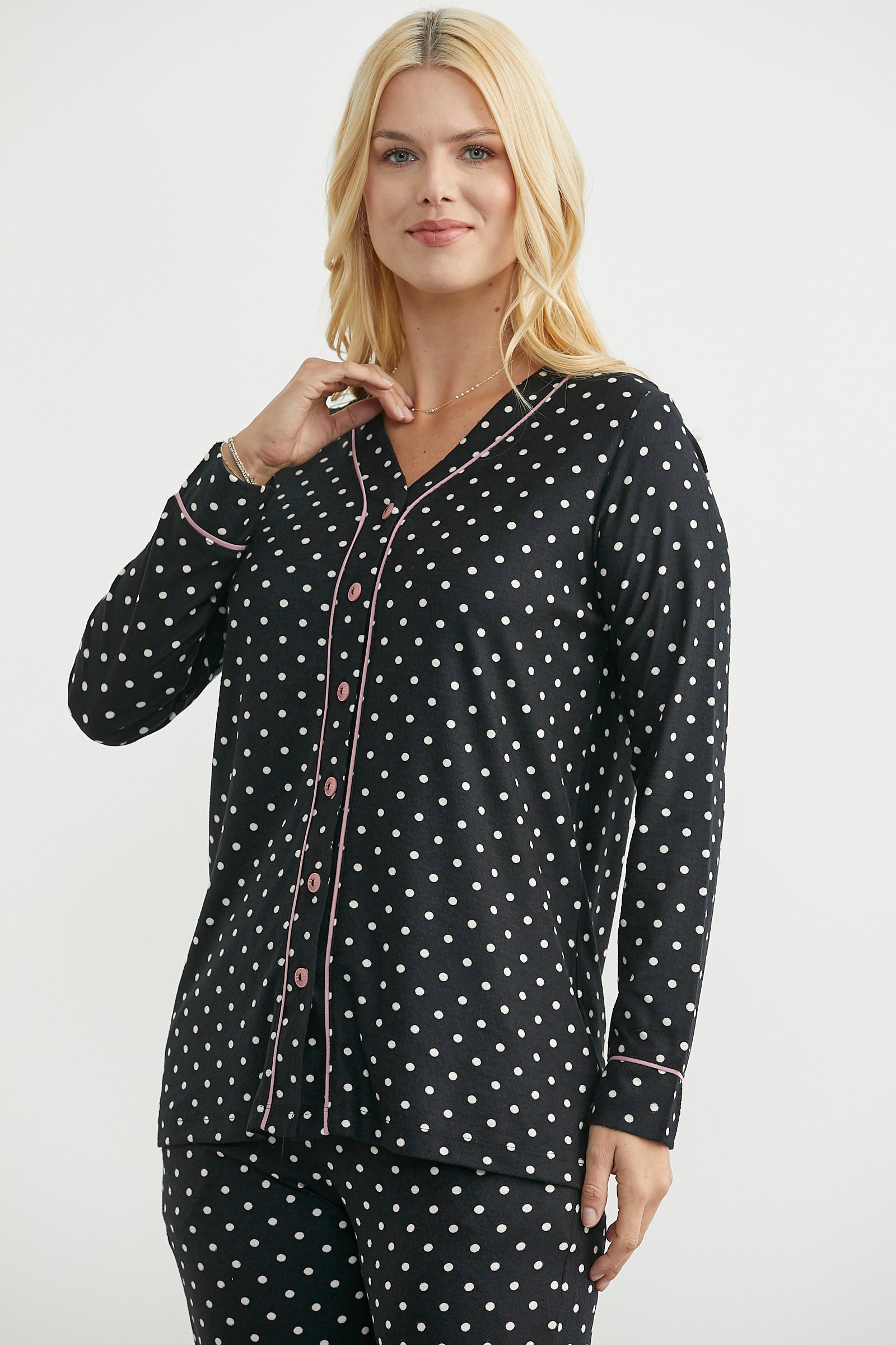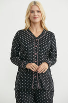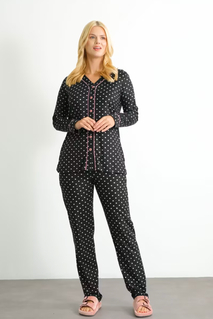 Renk biyeli, düğme kapamalı, puantiye desen pijama takım. Rahat kalıptır.