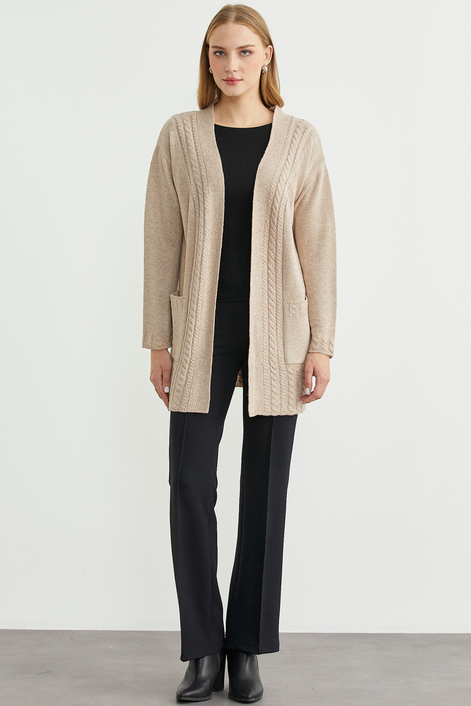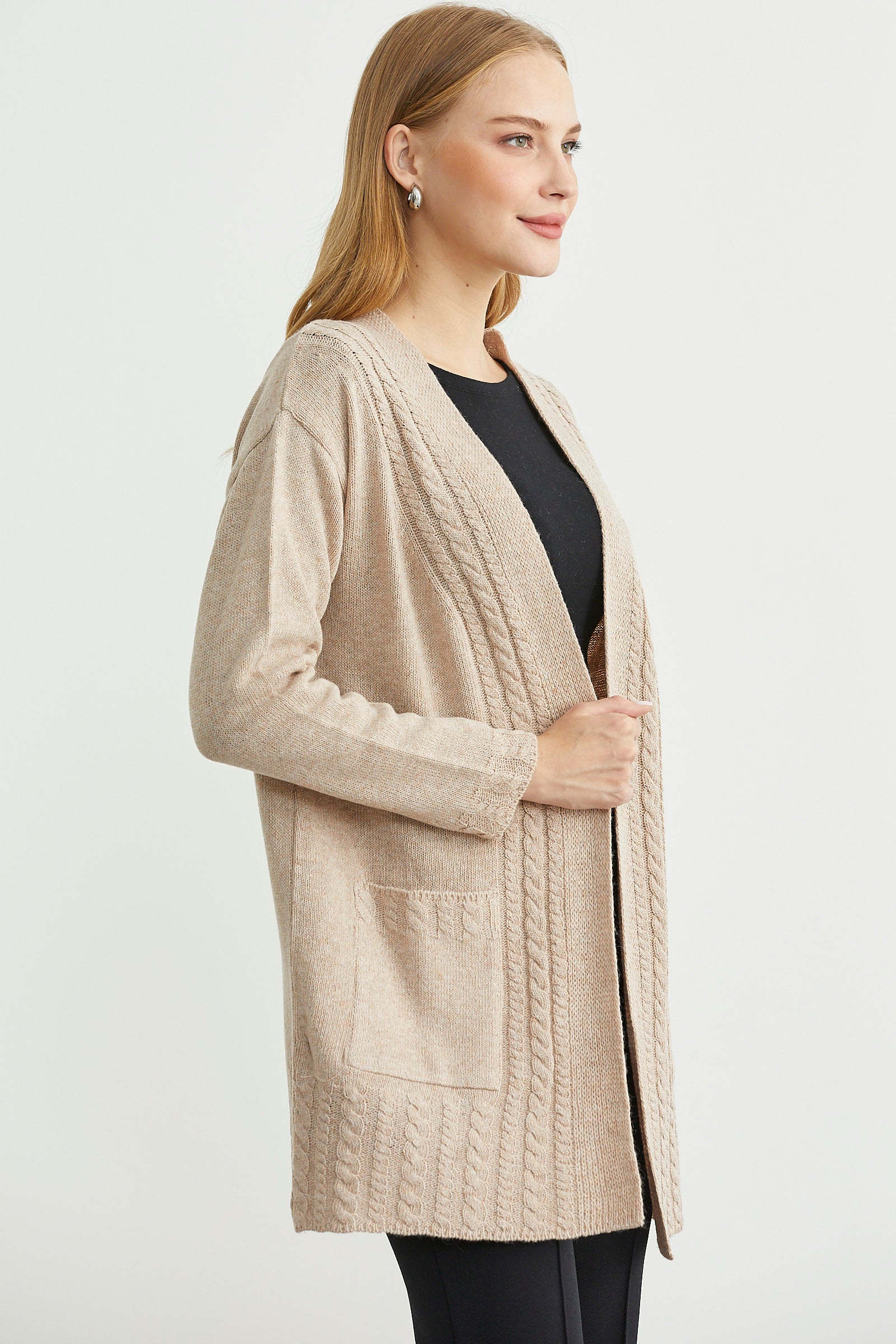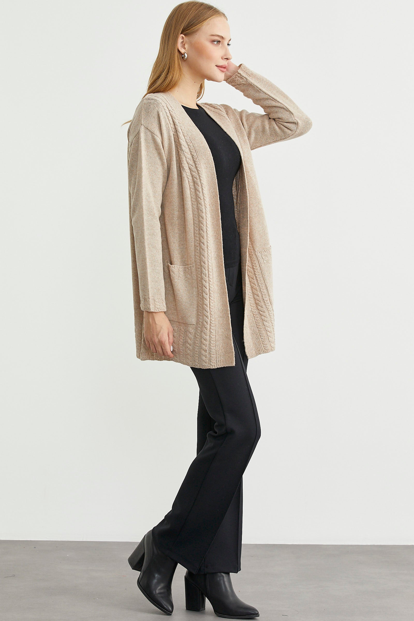 Uzun tunik boy, cepli triko hırka. Saç örgü desenle hareketlendirilmiş. Günlük kullanım için uygundur.