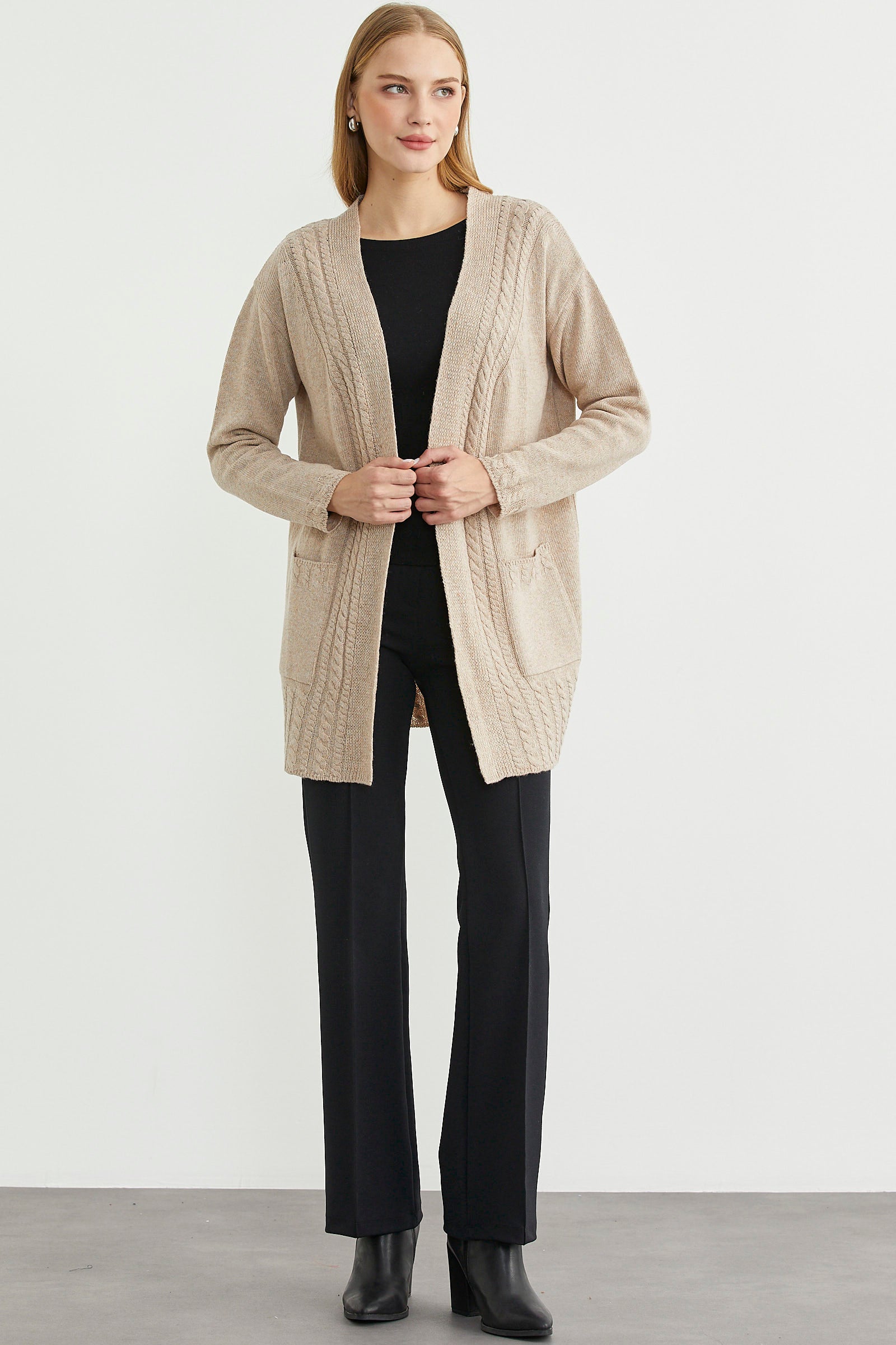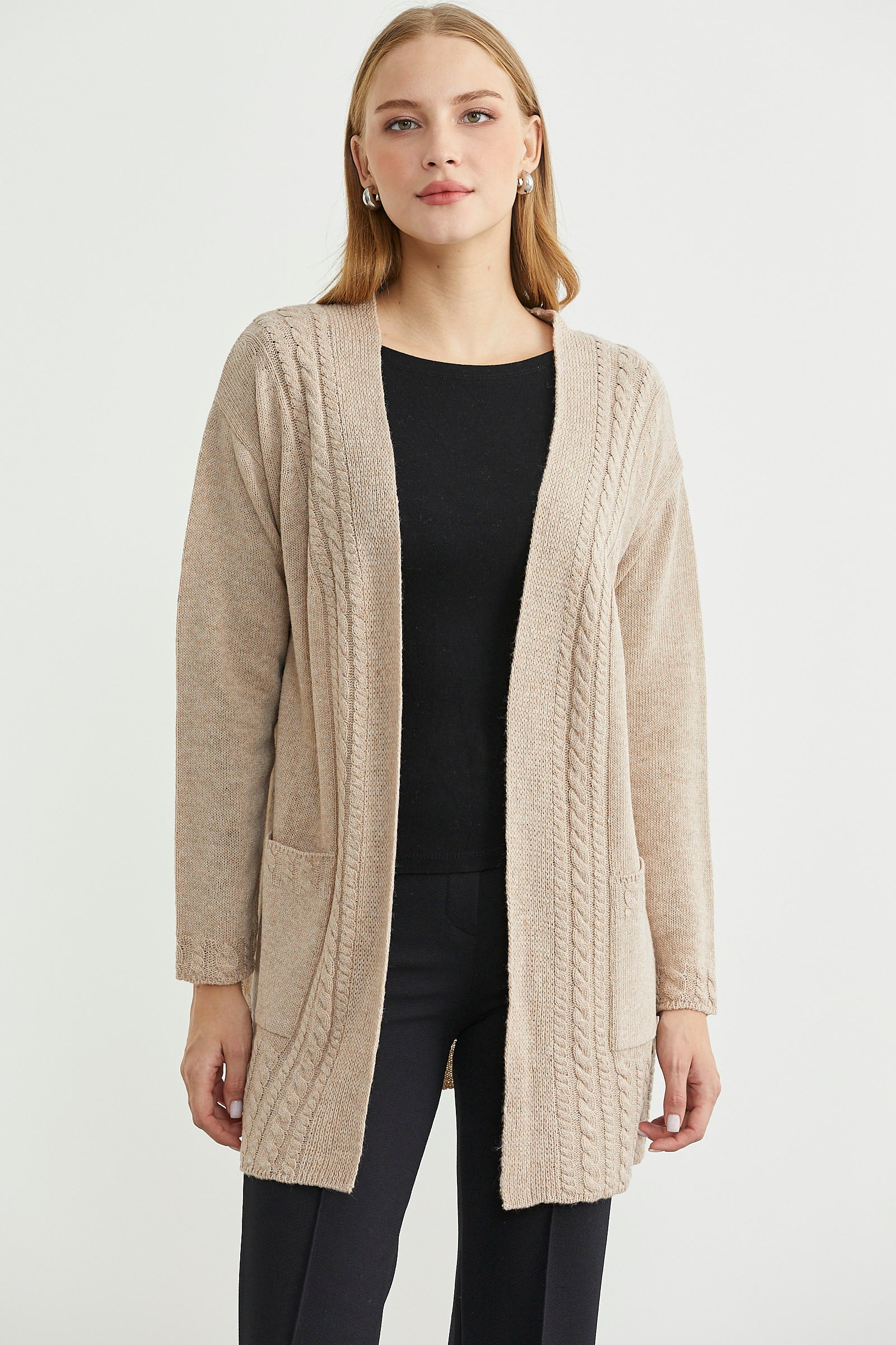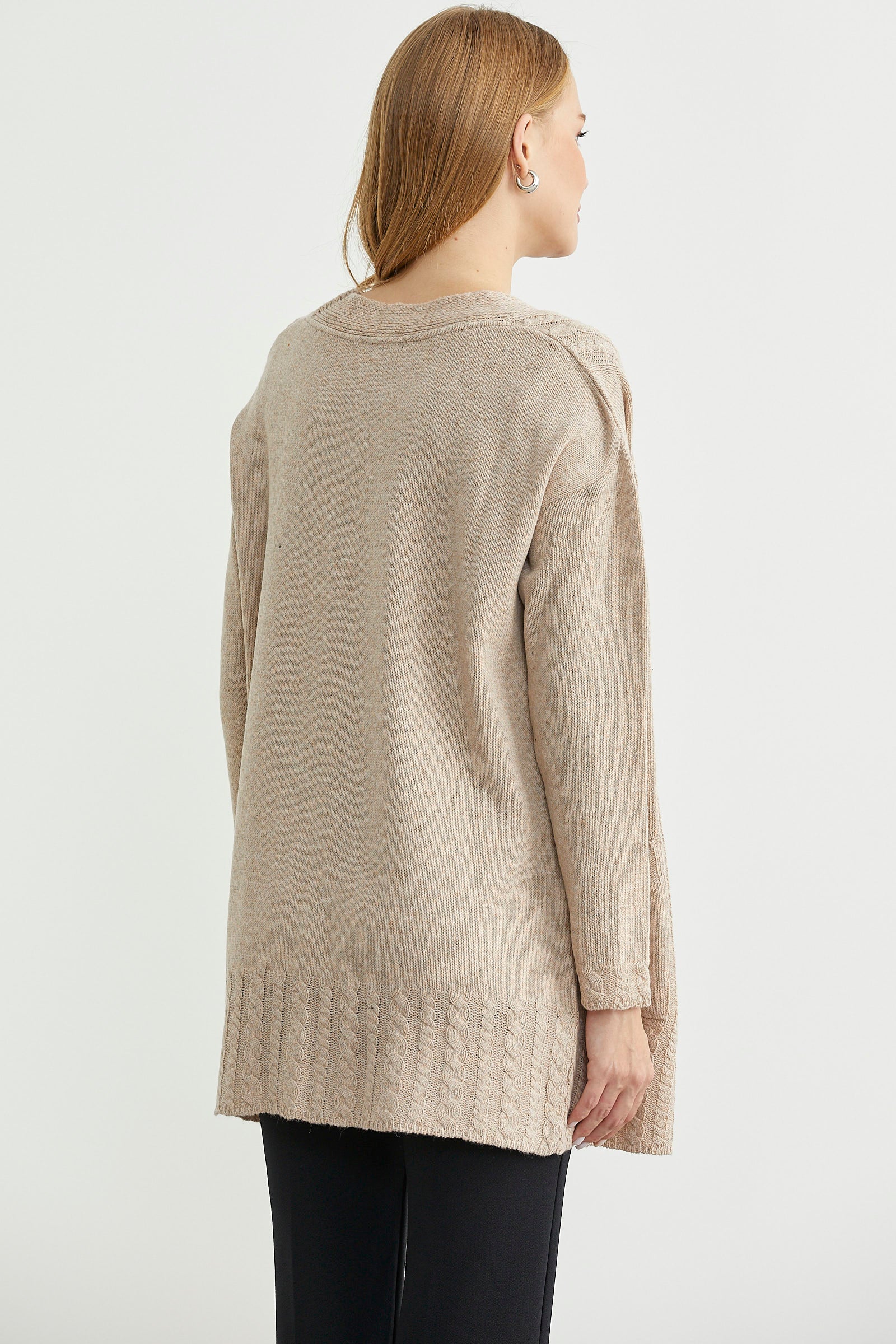 Uzun tunik boy, cepli triko hırka. Saç örgü desenle hareketlendirilmiş. Günlük kullanım için uygundur.