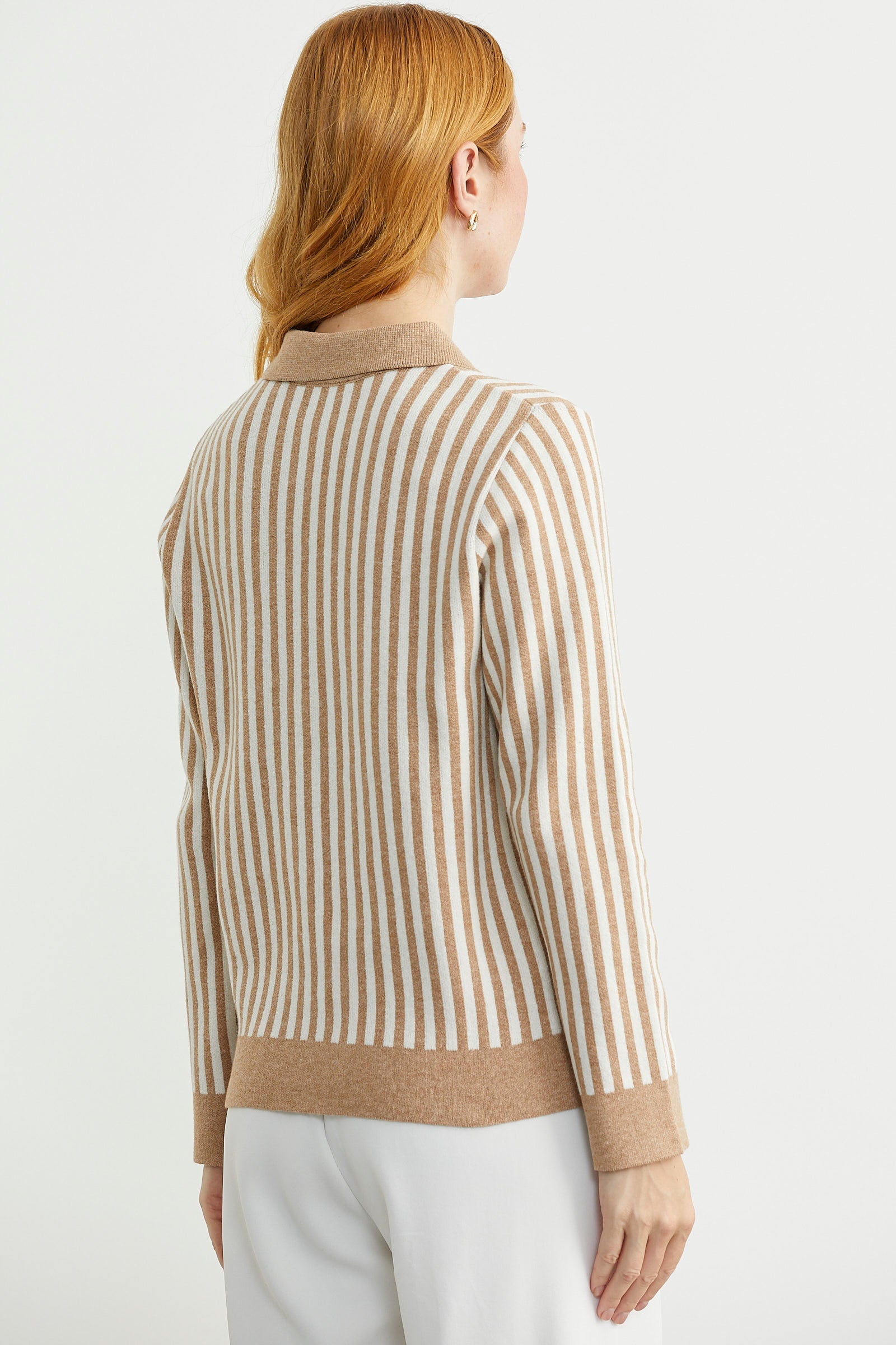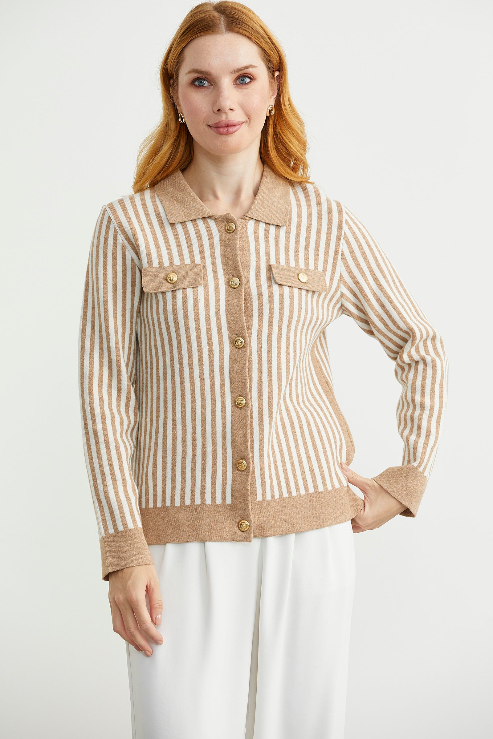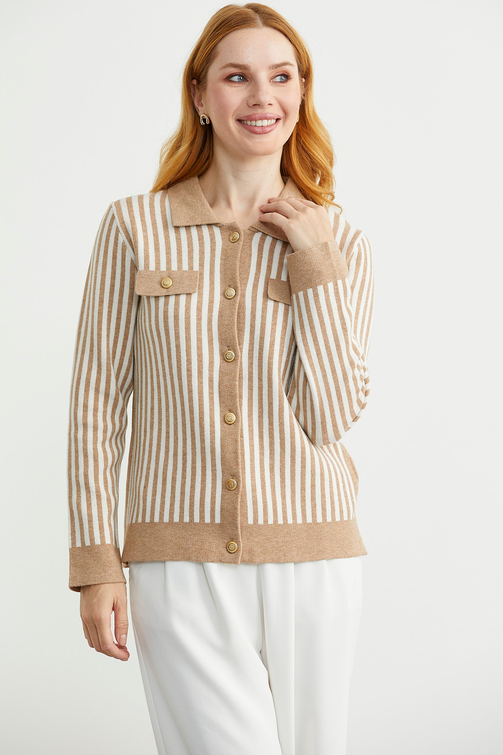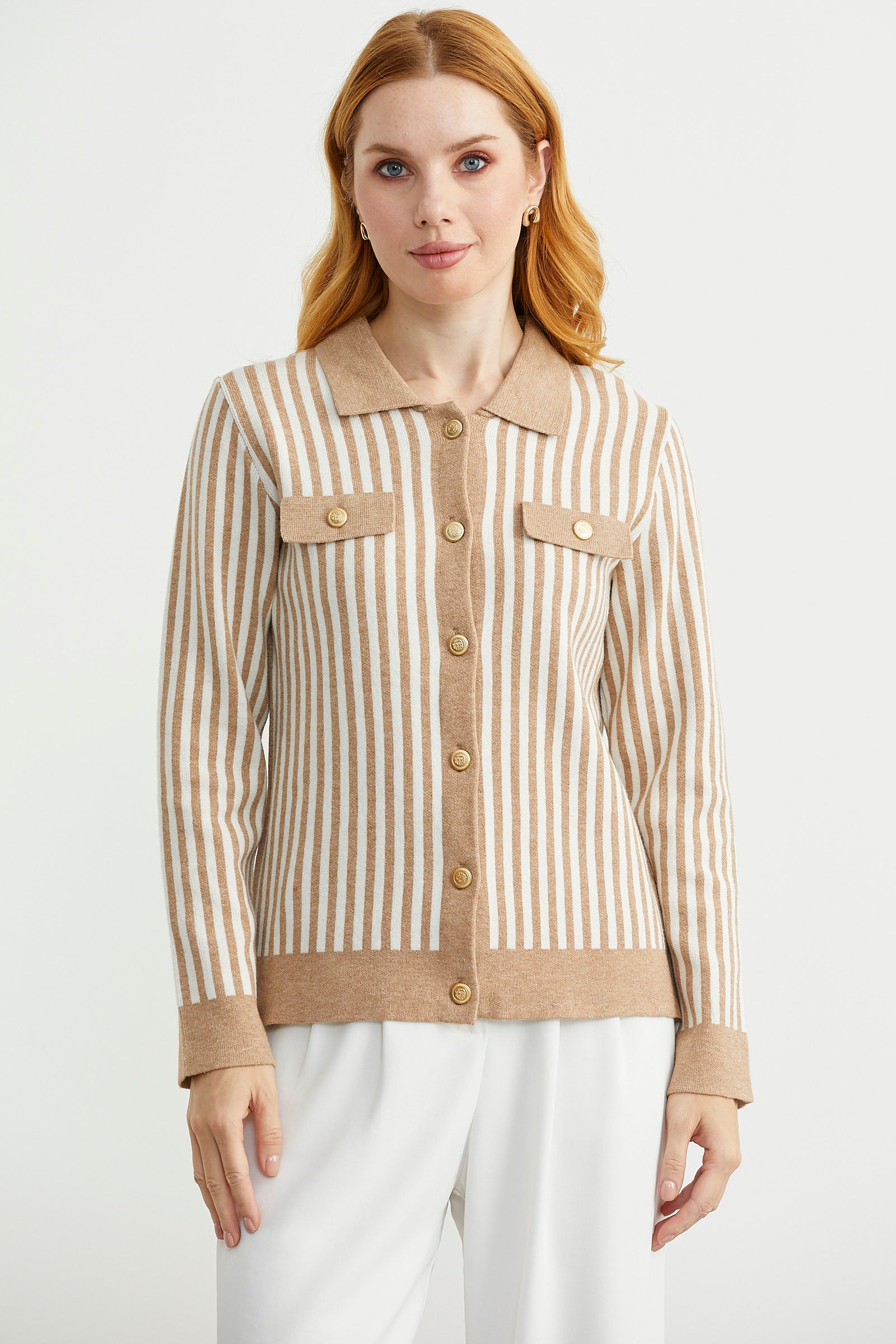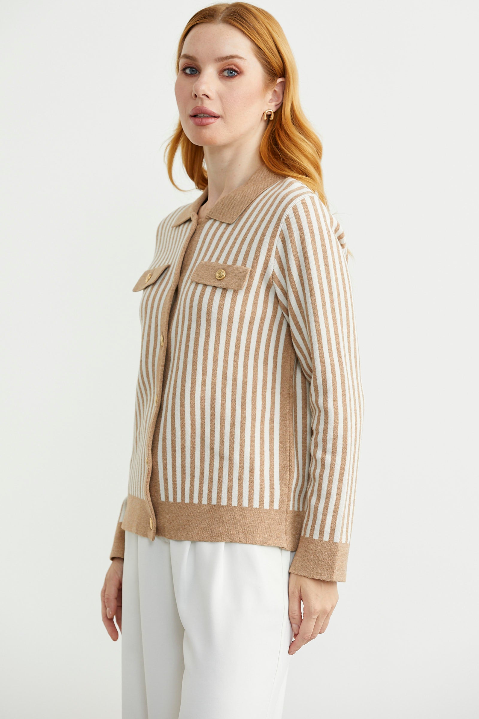 Polo yaka, metal düğme detaylı, çizgi kombinli triko hırka. Dekoratif cep detayı var.