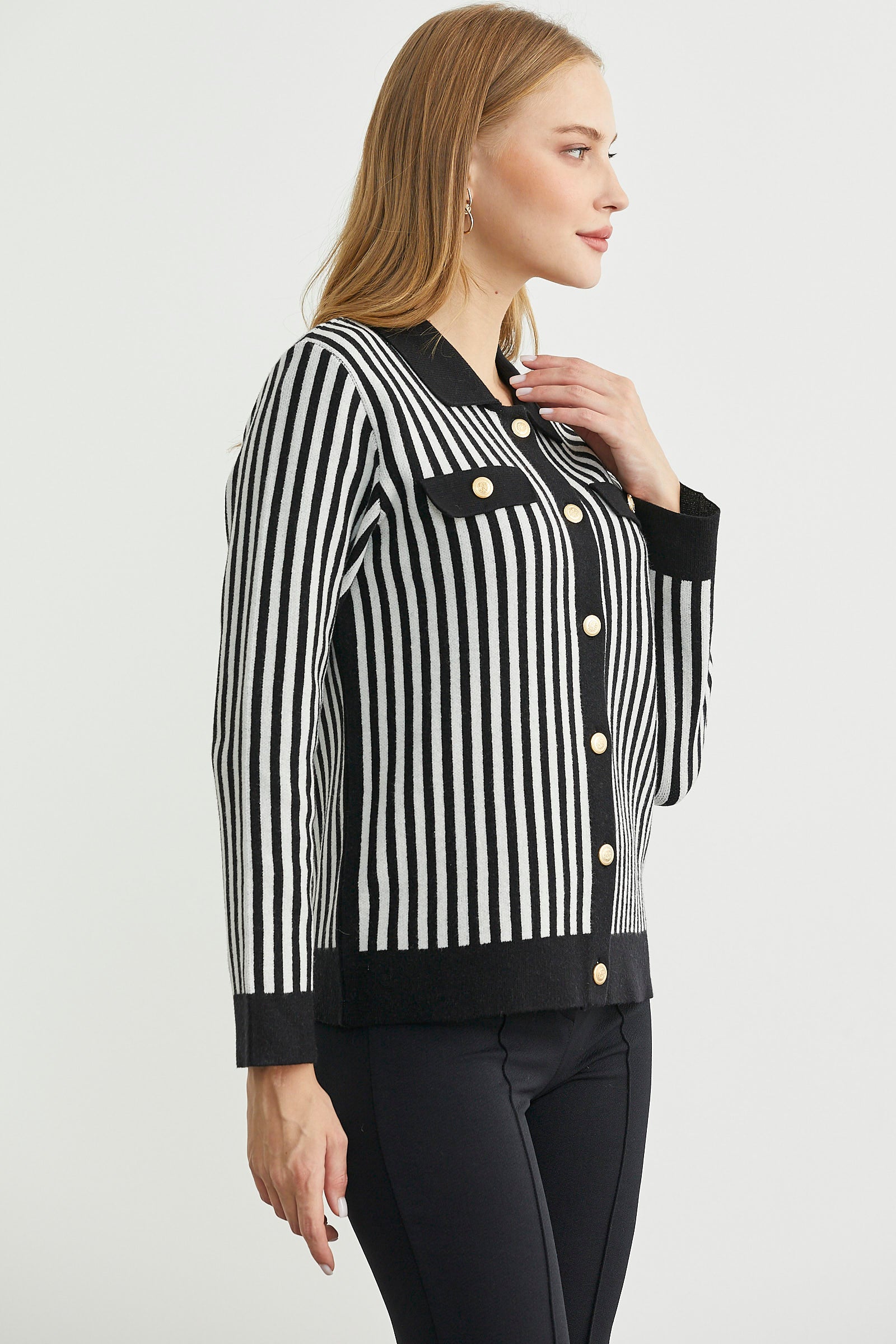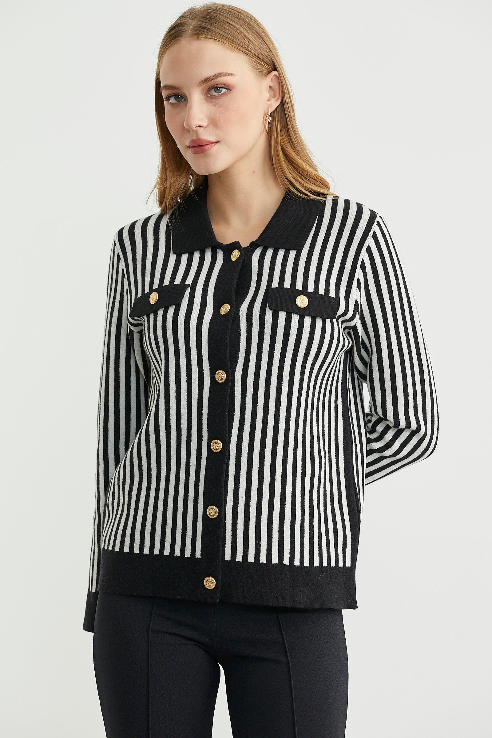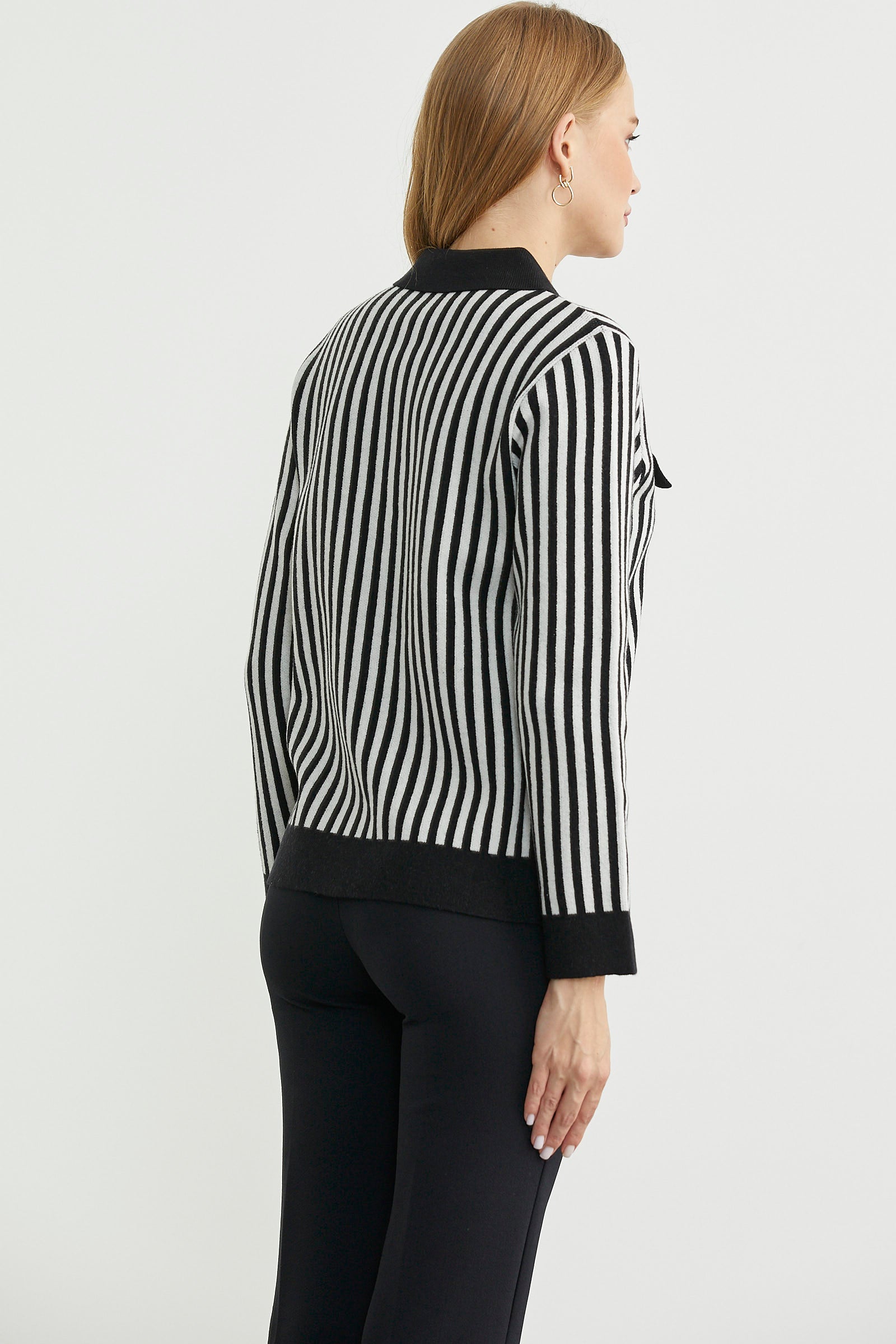 Polo yaka, metal düğme detaylı, çizgi kombinli triko hırka. Dekoratif cep detayı var.