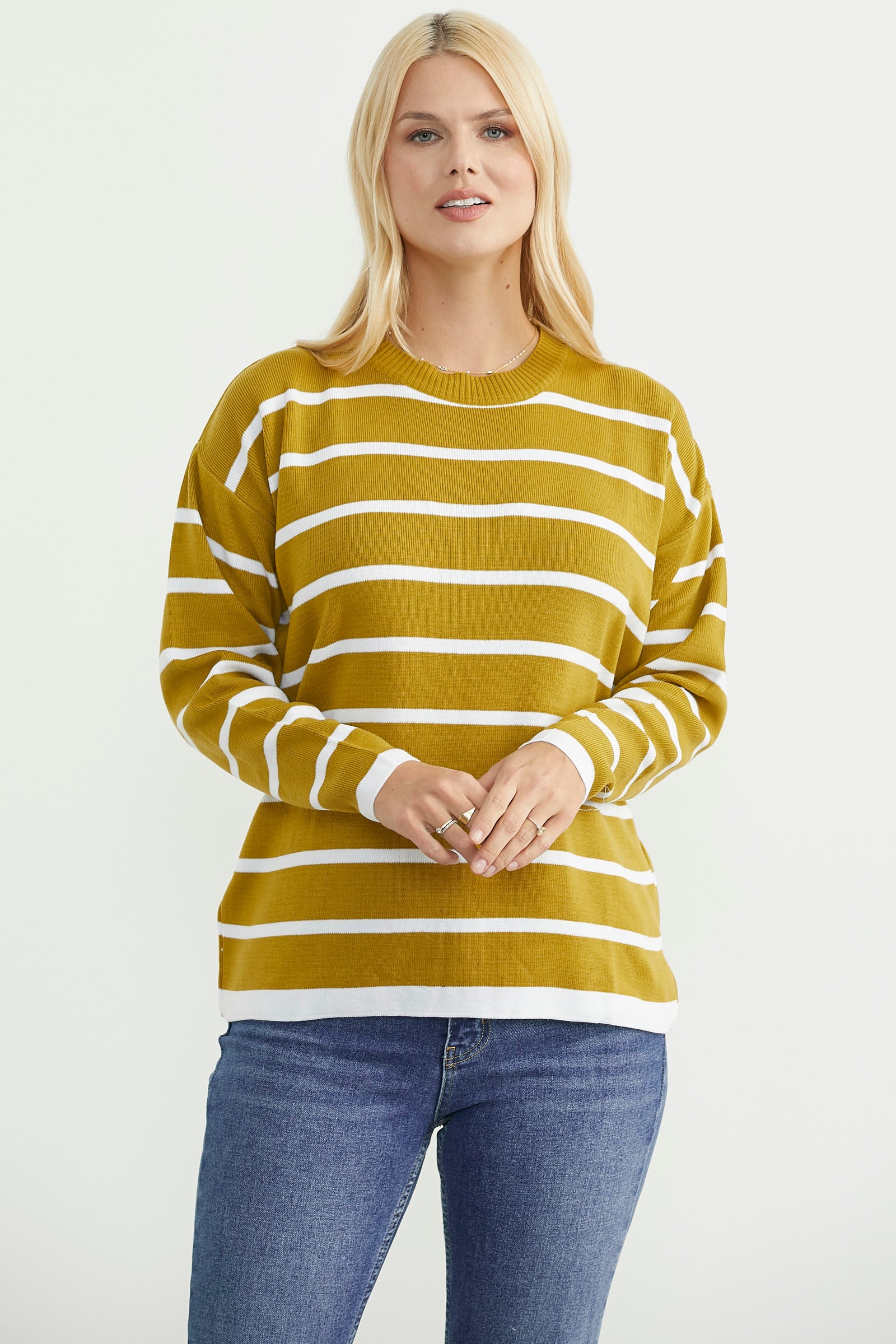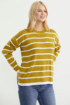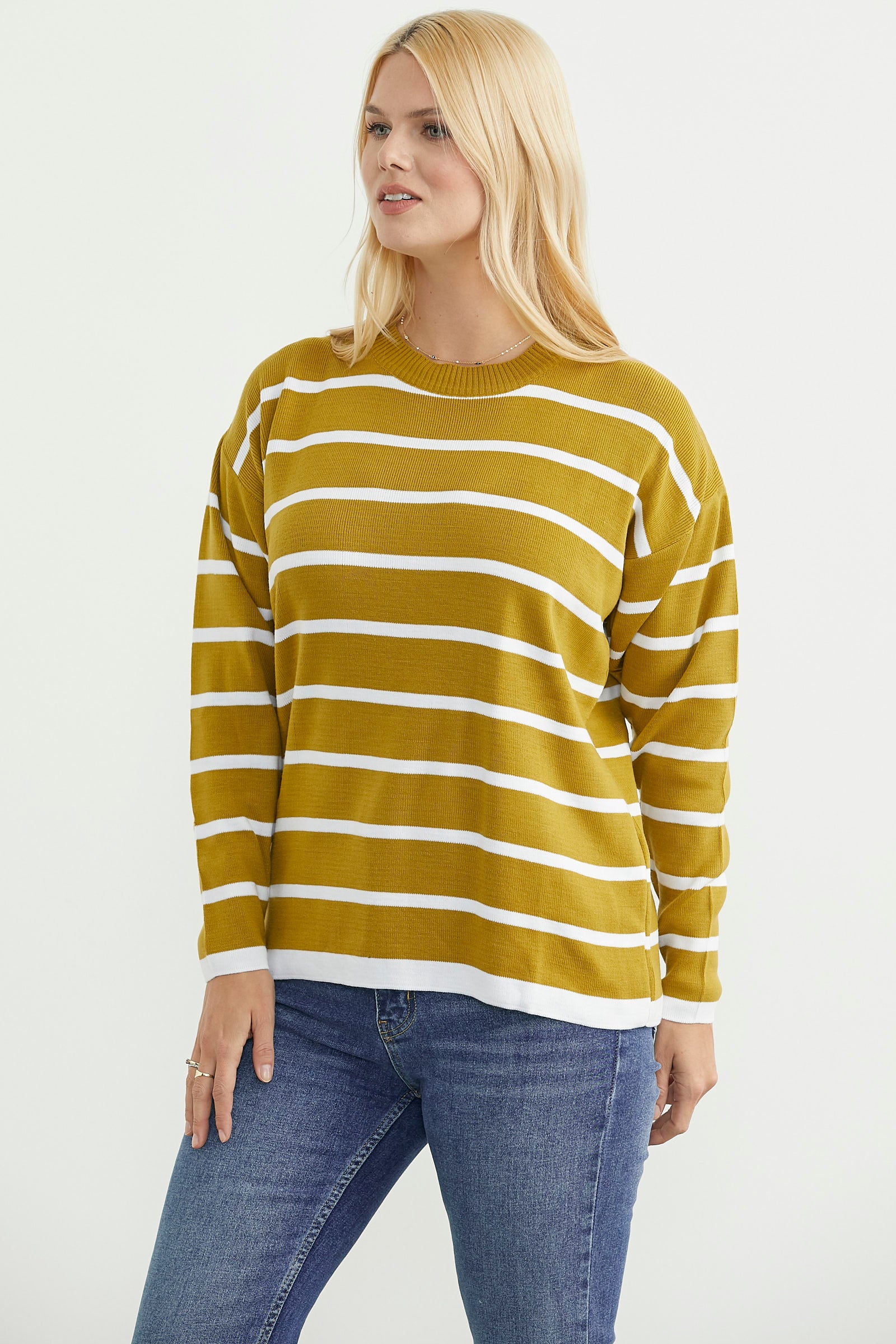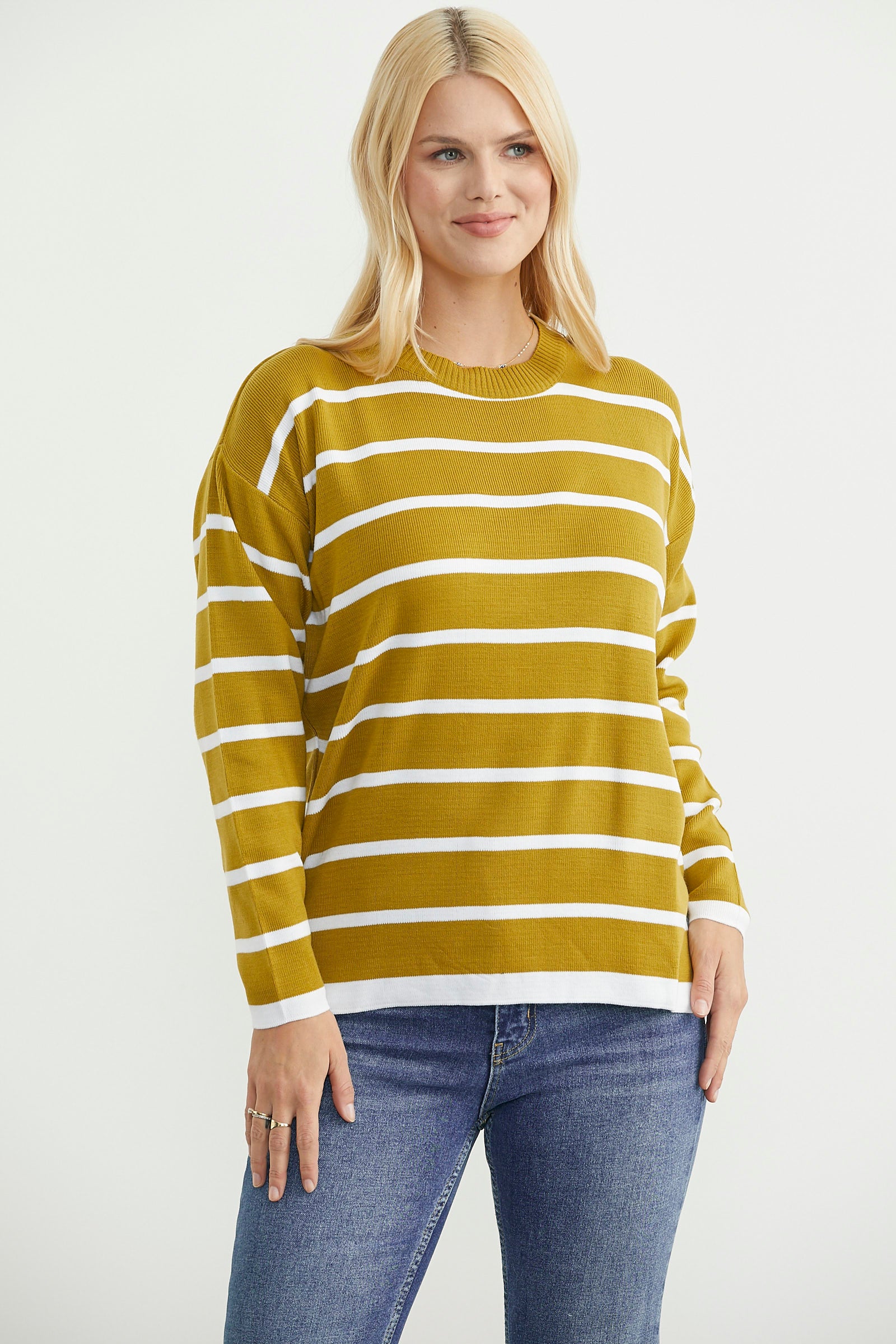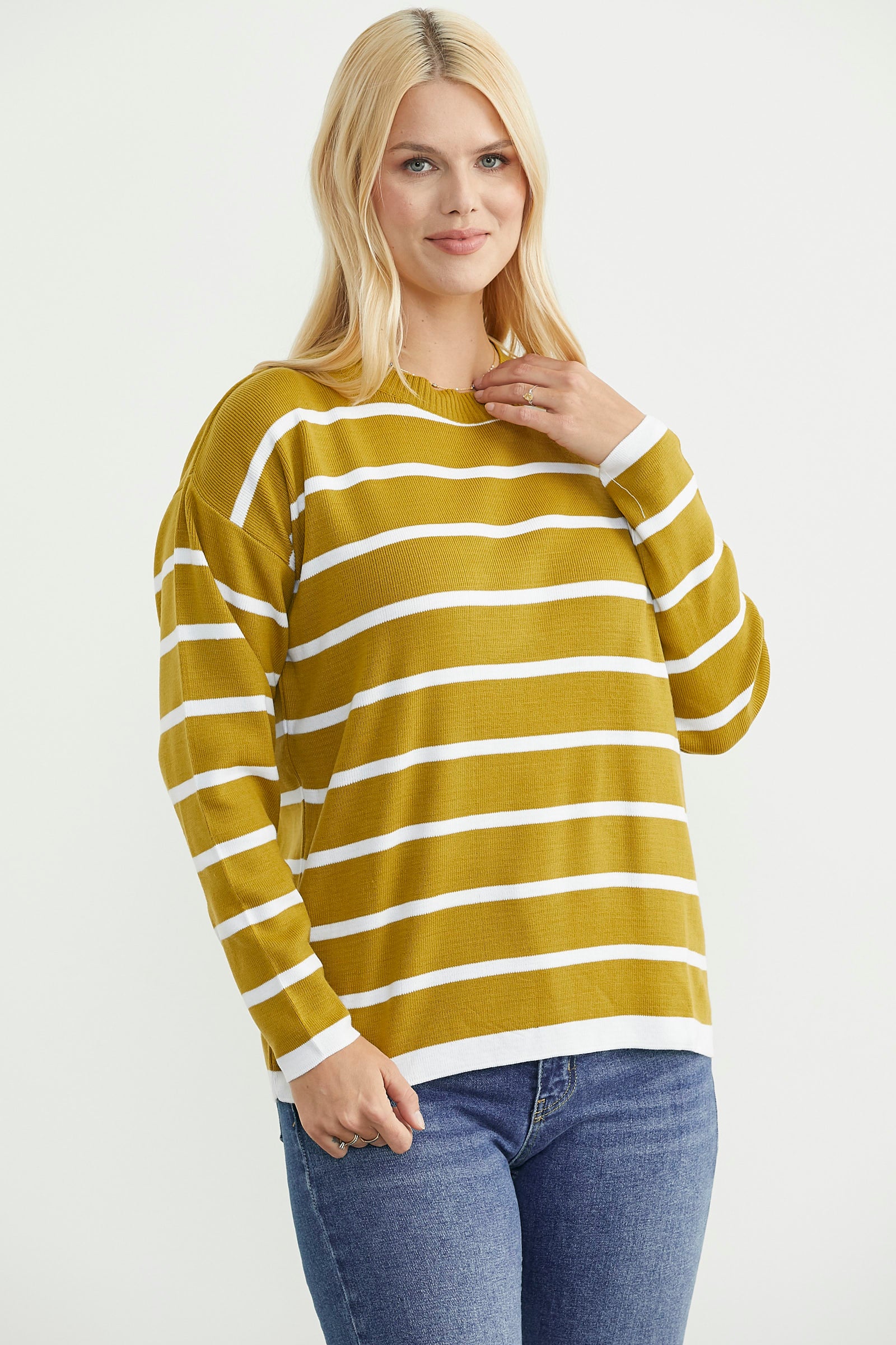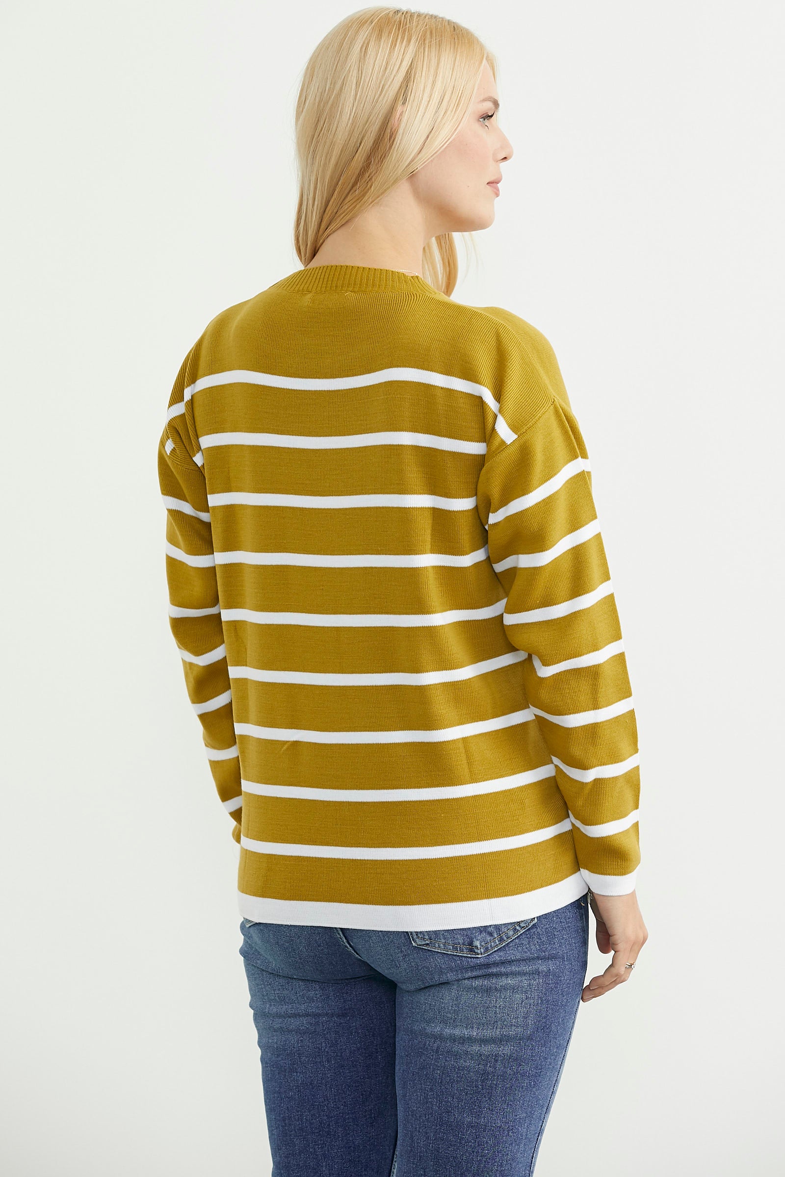 Çizgili Oversize Basic Triko Kazak - Zeytin Yeşil