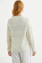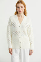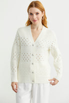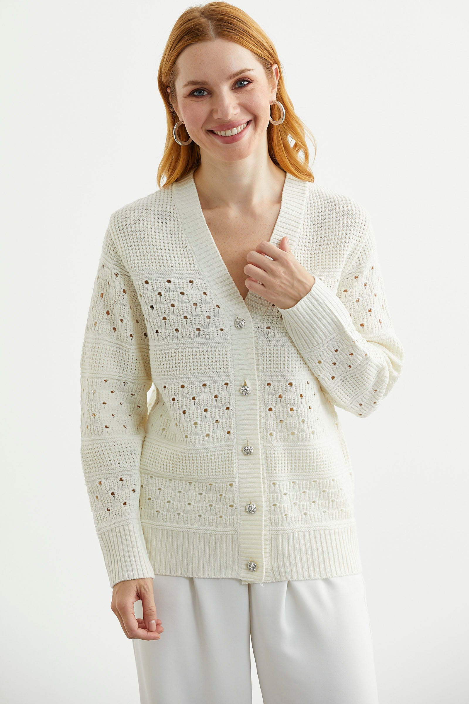 Delik Motifli Yünlü Triko Hırka - Kemik