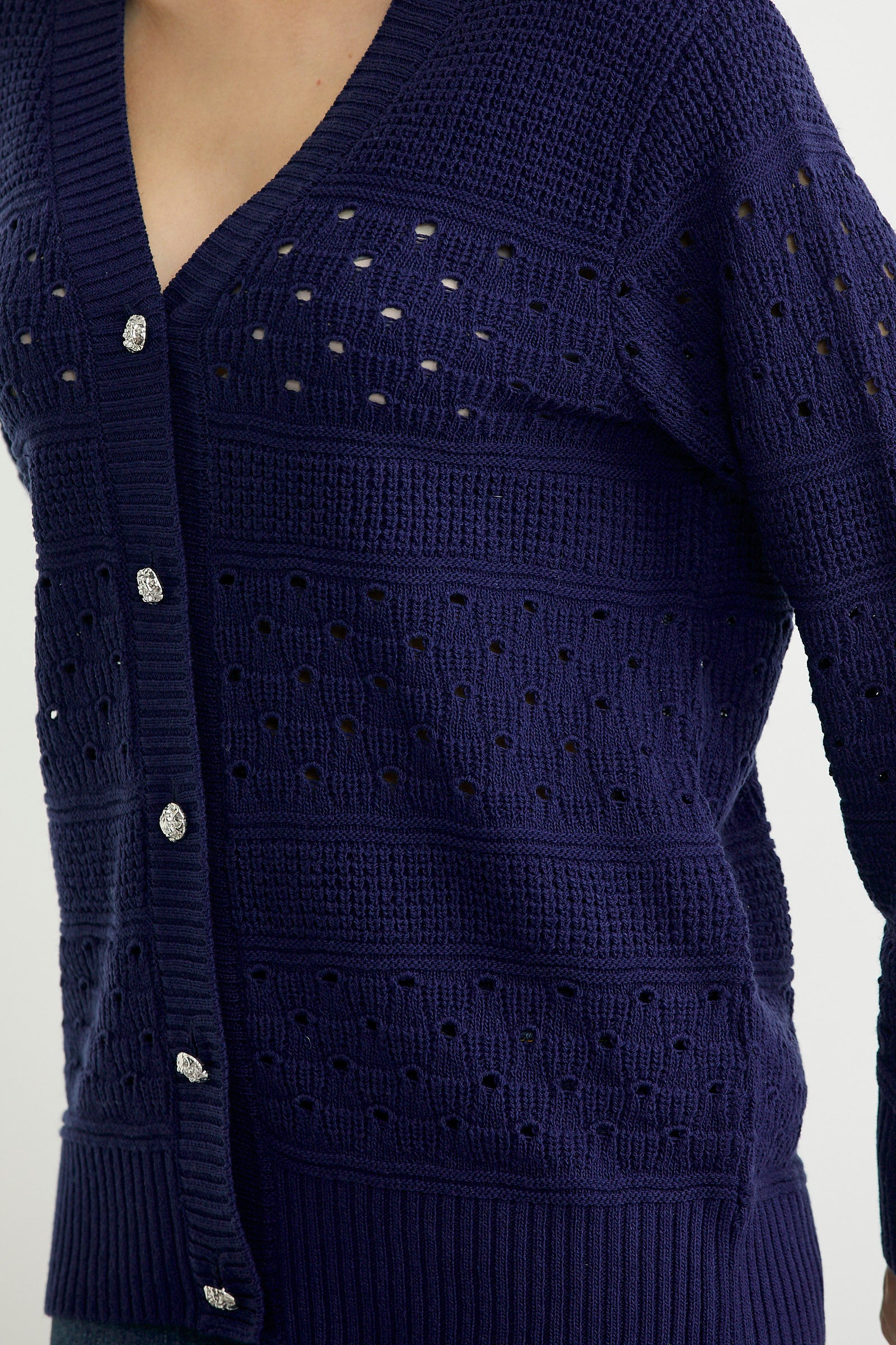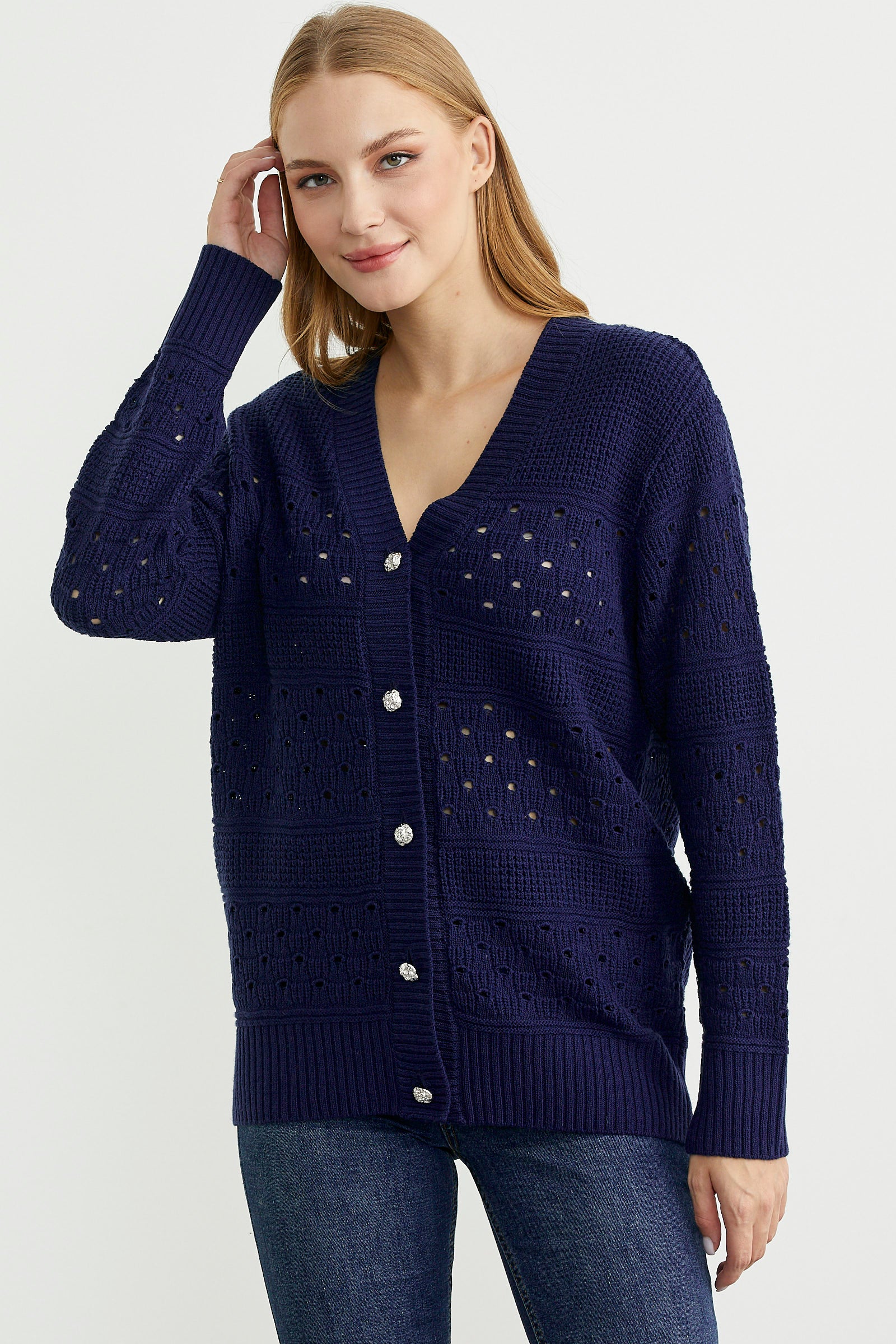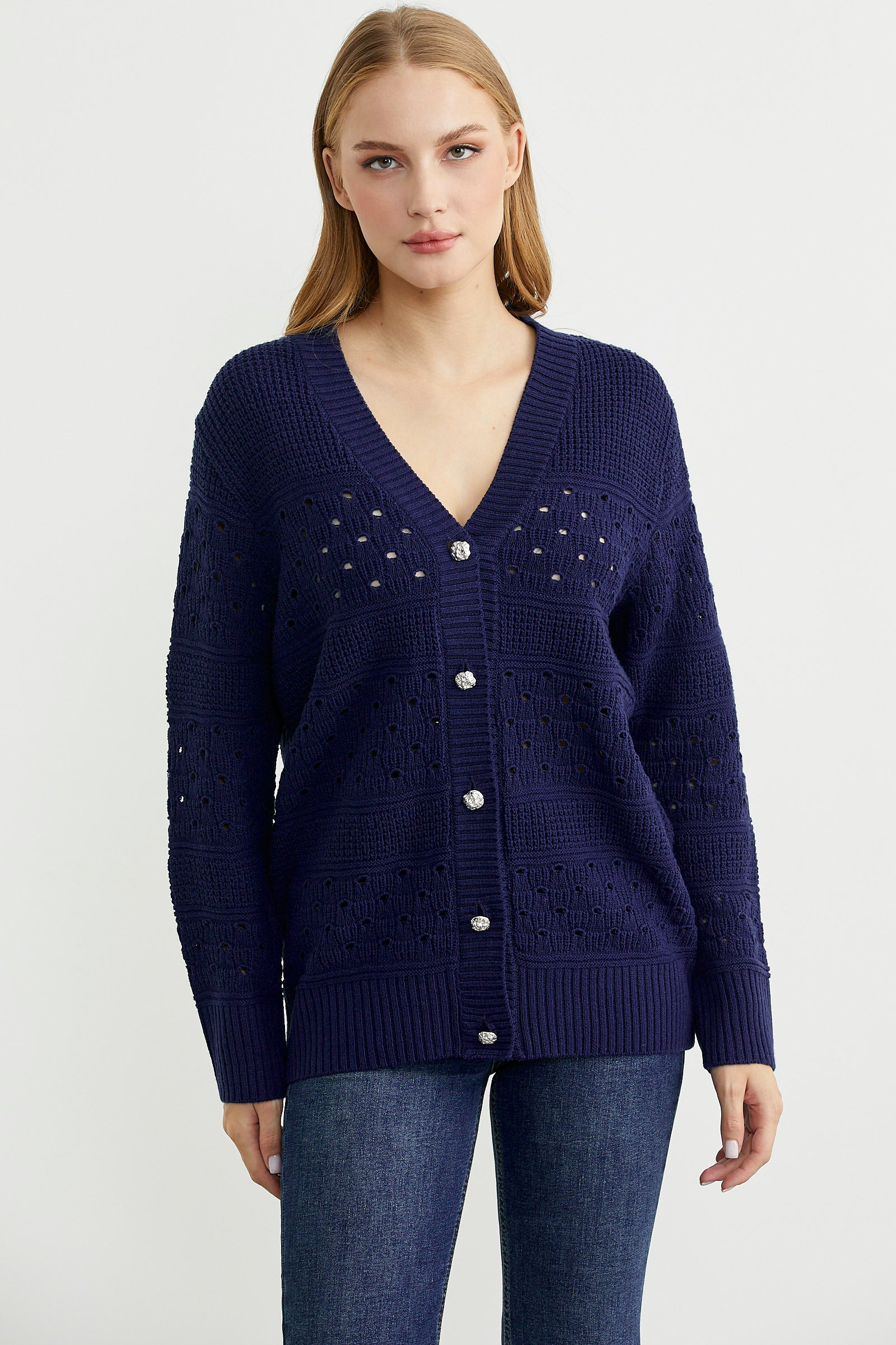 Delik Motifli Yünlü Triko Hırka - Lacivert
