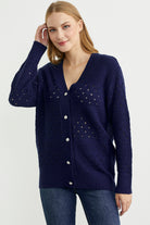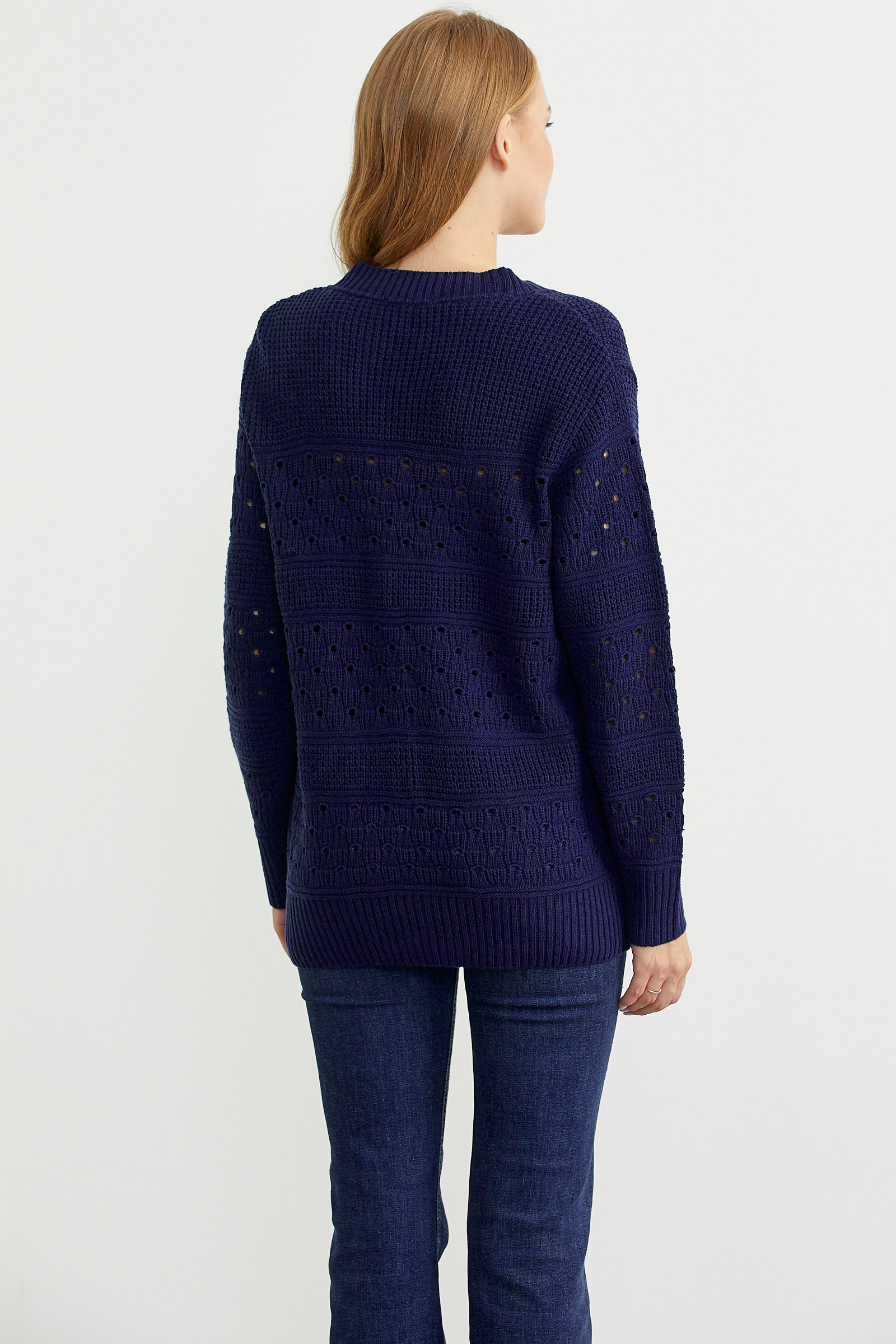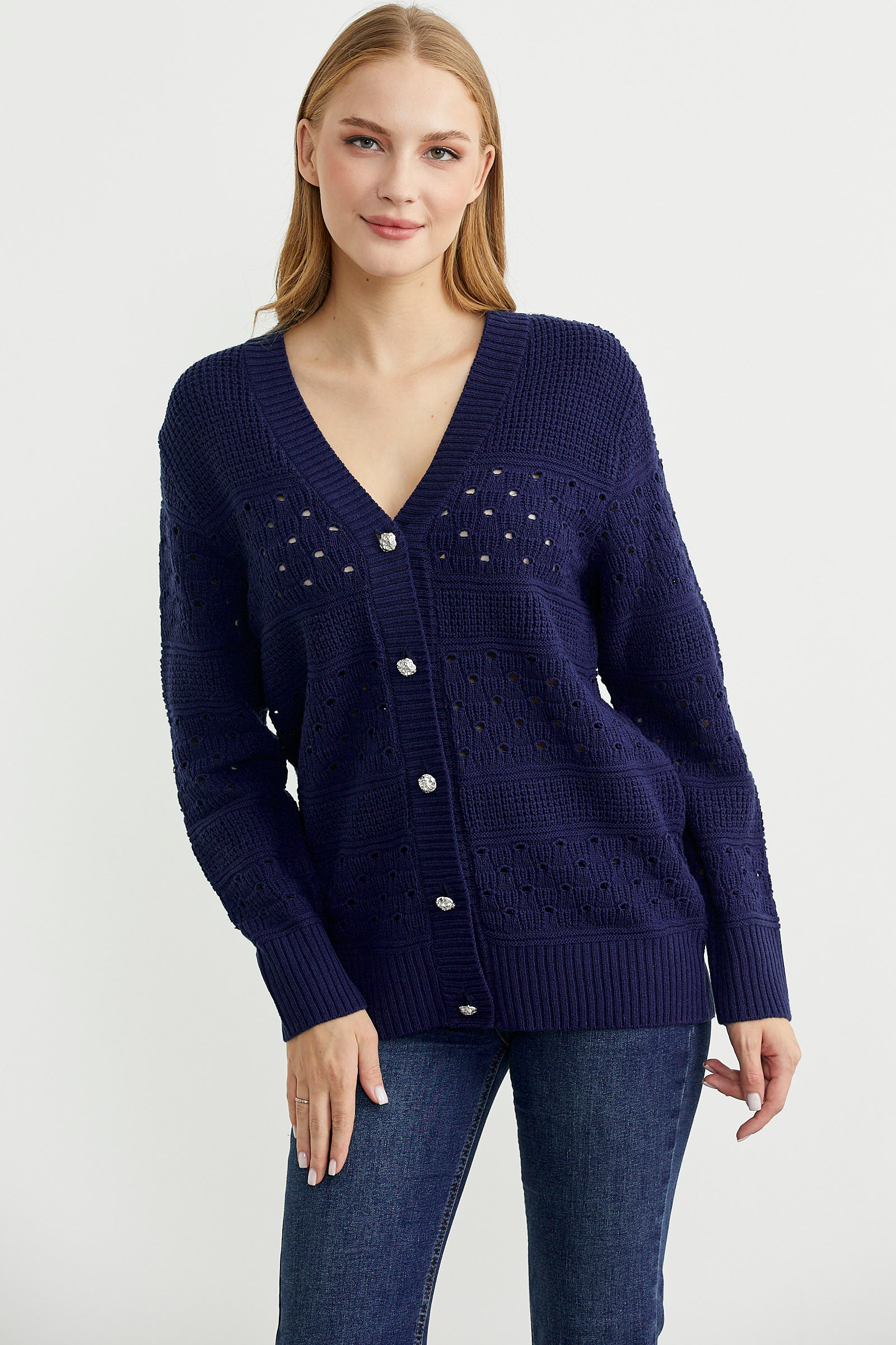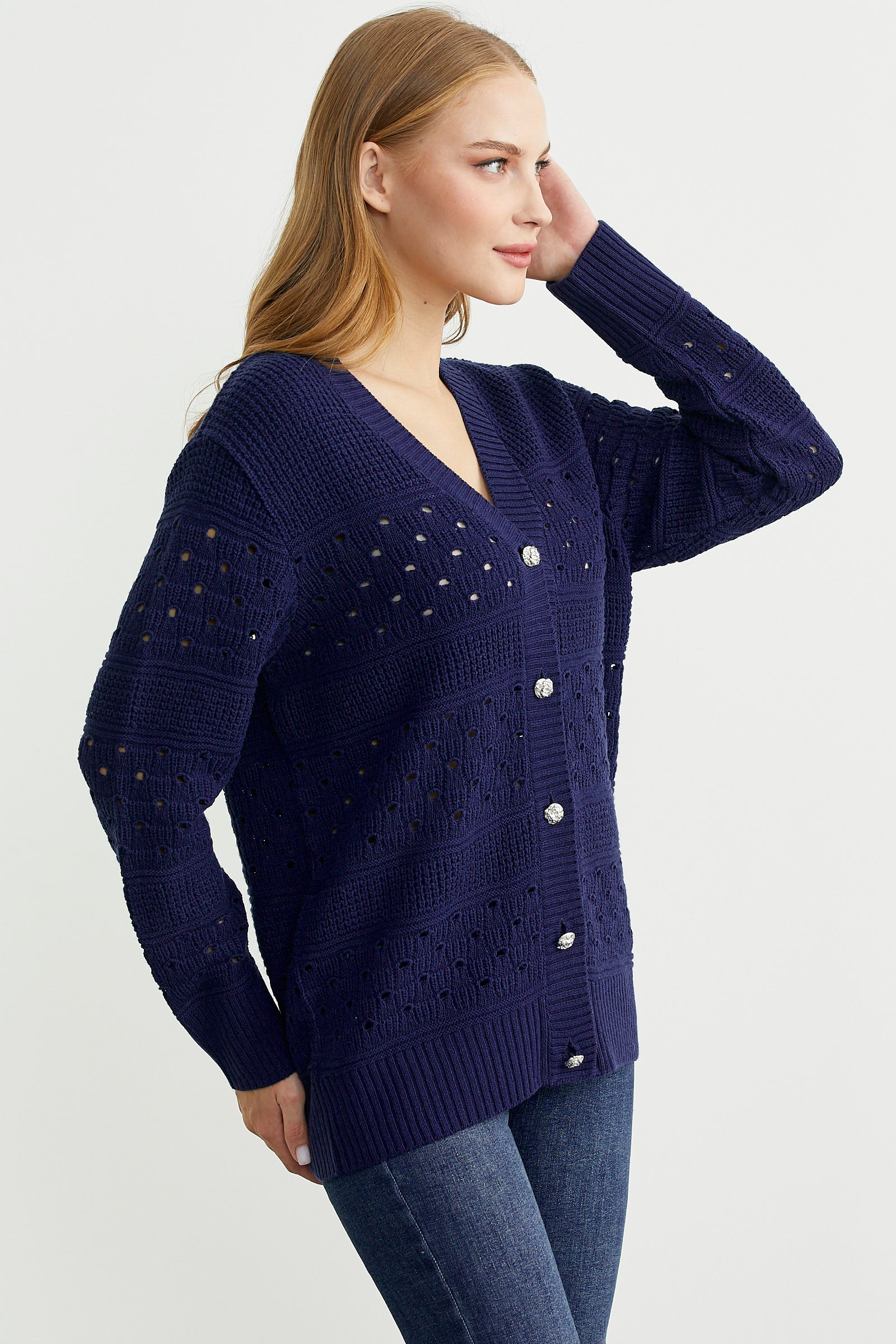 Delik Motifli Yünlü Triko Hırka - Lacivert