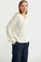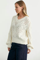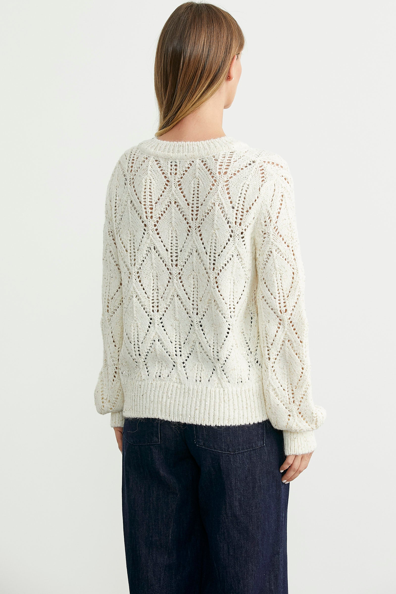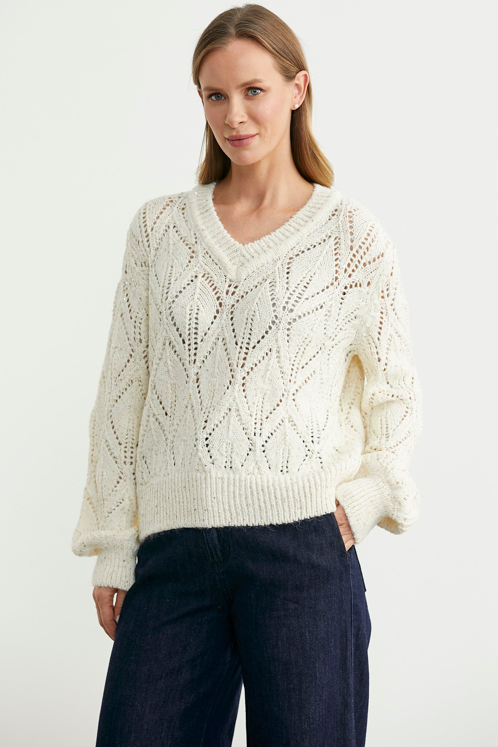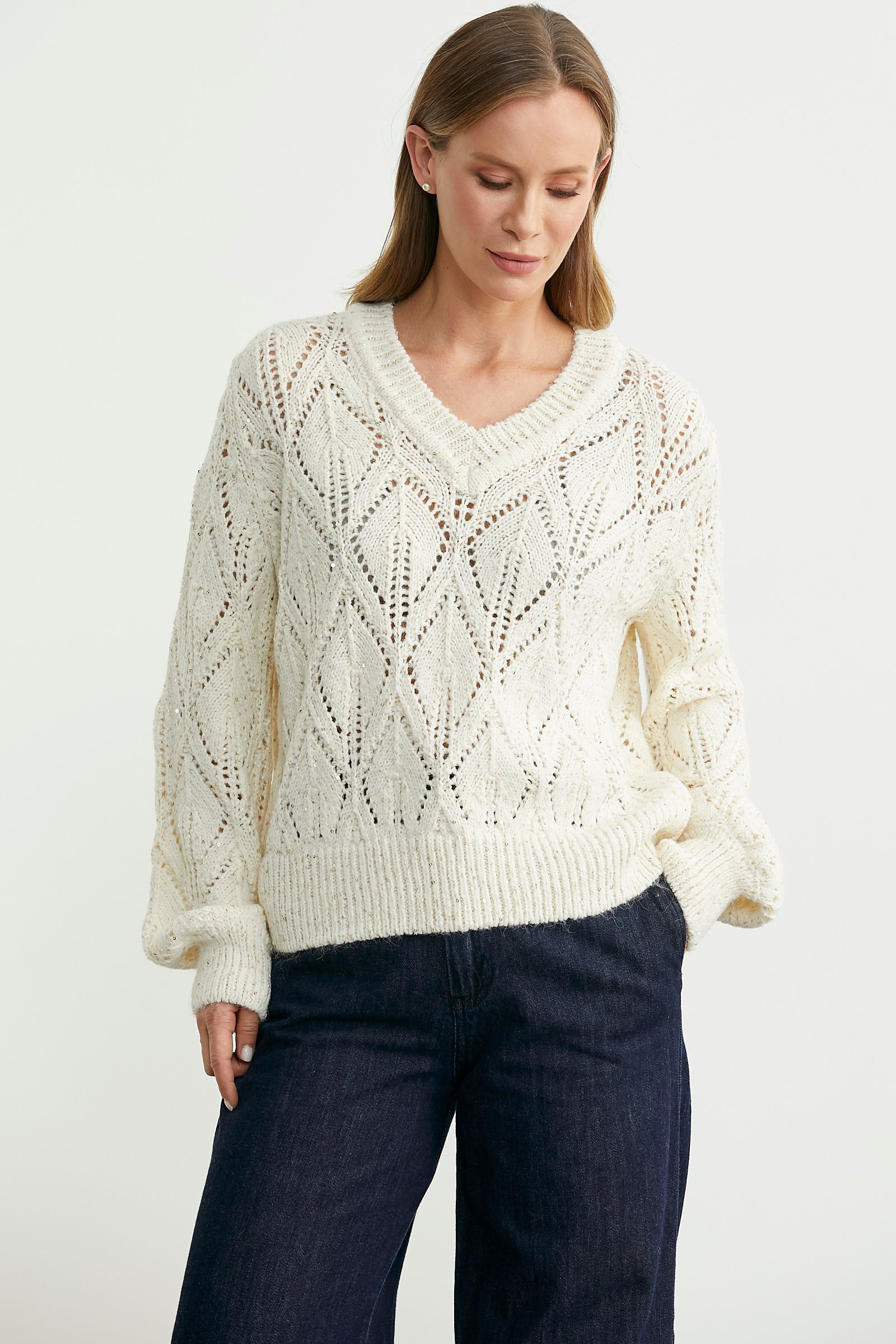 V yakalı, delik desenli triko kazak. Payet detaylarıyla sıklaştırılmıştır. Uzun kol, rahat kalıptır.