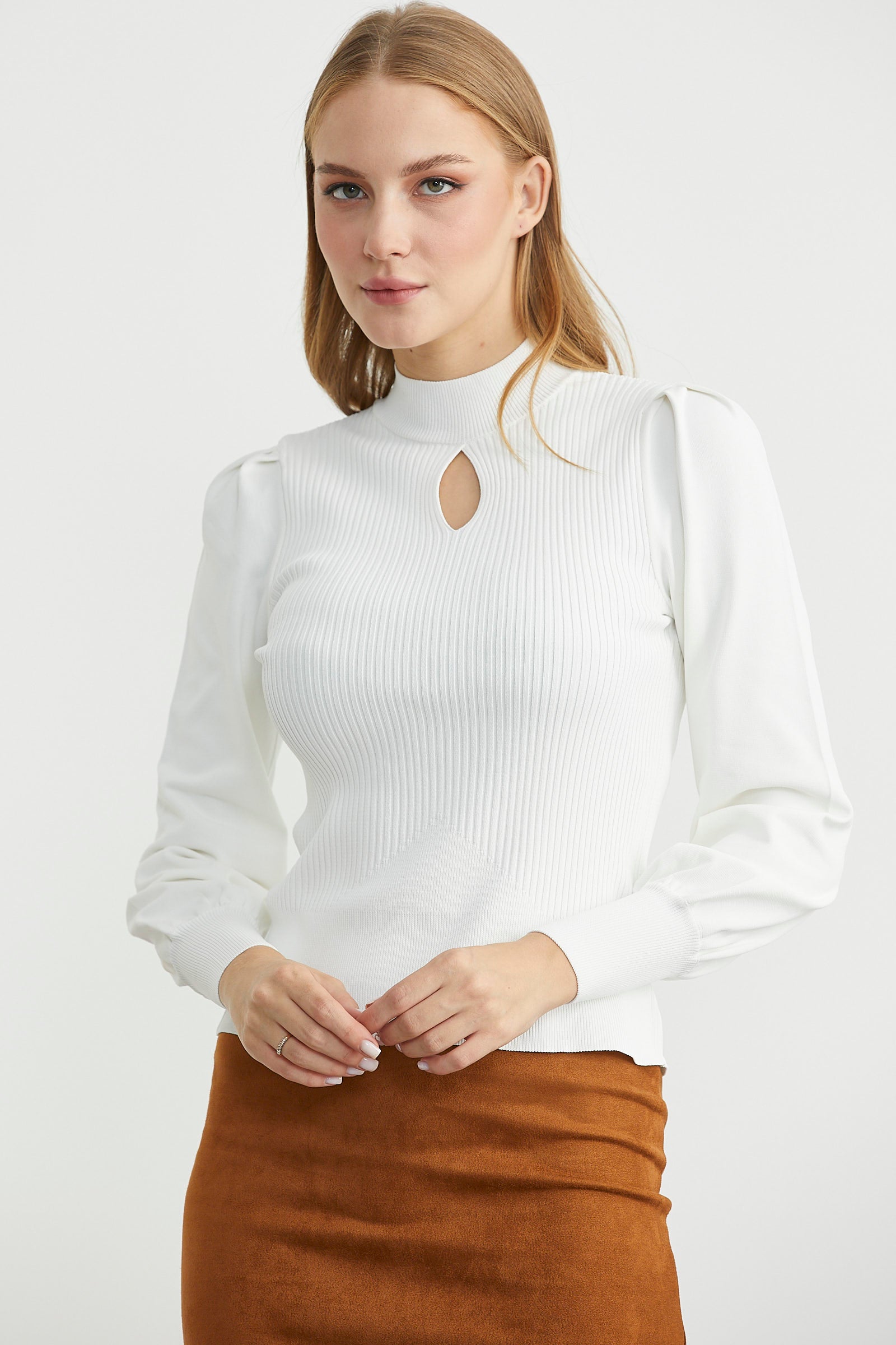 Dik Yaka Balon Kol Triko Kazak - Kemik