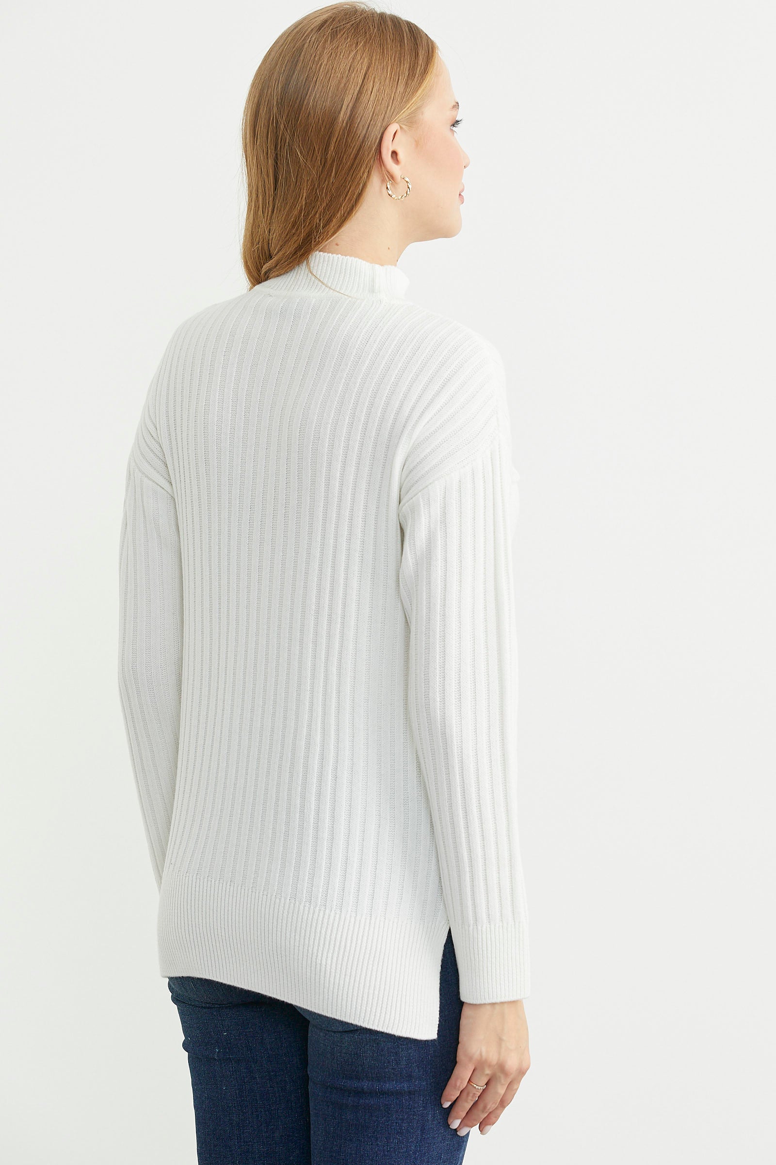 Lastik örgülü, dik yaka, önü cep detaylı triko kazak. Rahat kalıp.