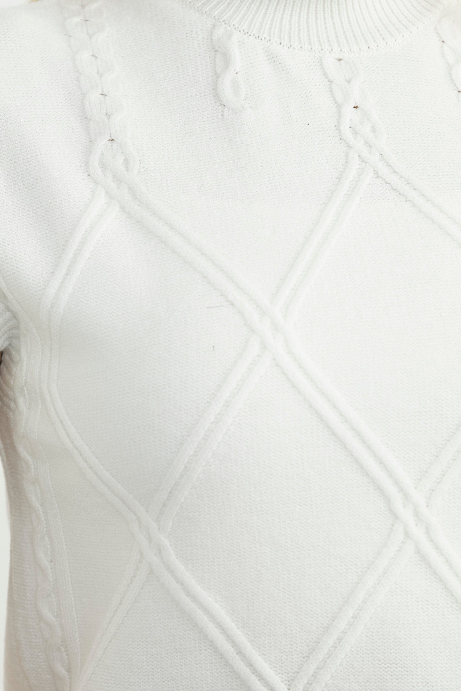 Dik sosis yaka, düşük kol, baklava desenli süveter. Kol ağızları ve etek ucu lastik örgülü. Rahat kalıp.