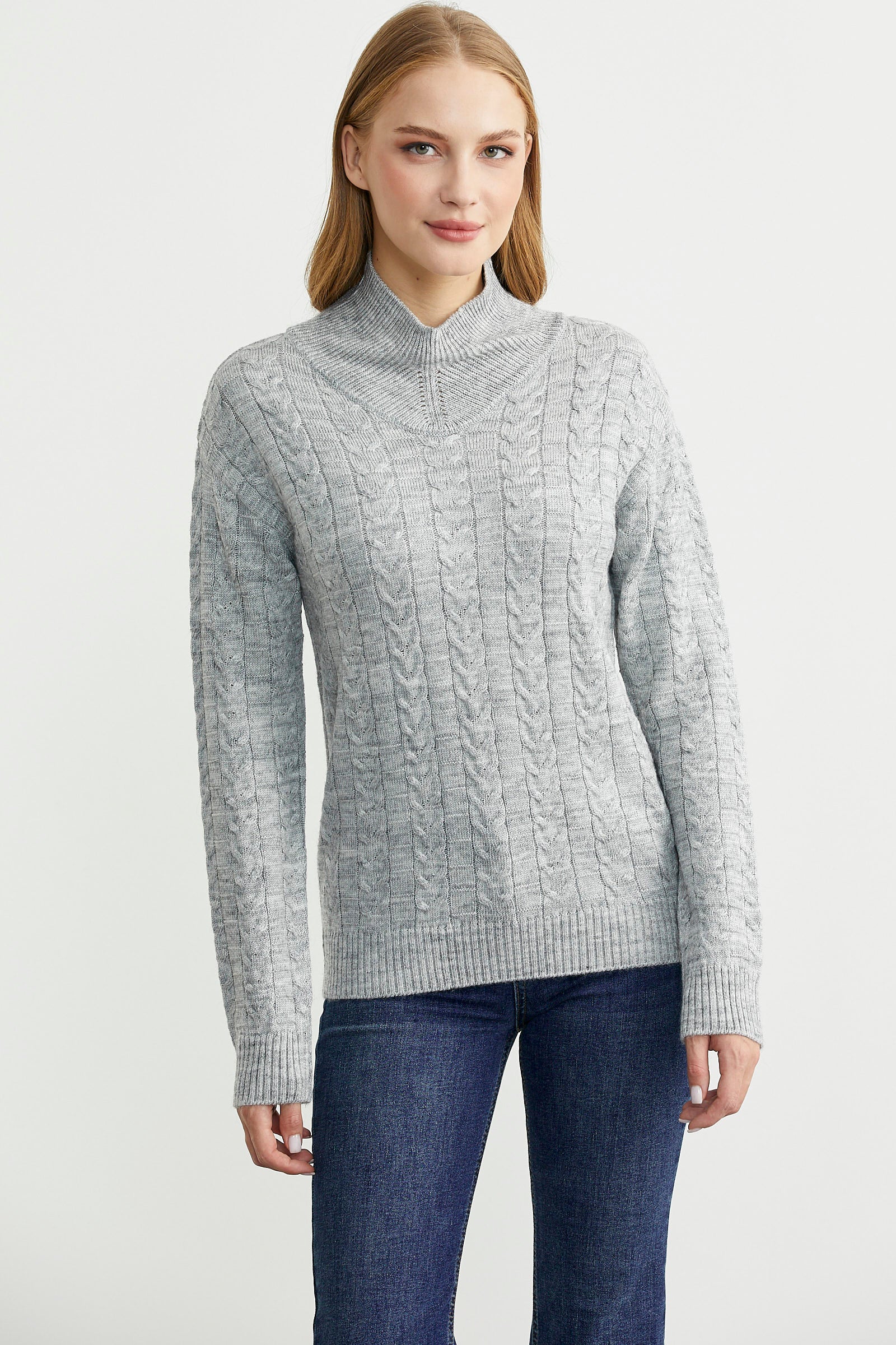 Verev dik yakalı, saç örgü desenli triko kazak. Etek ucu ve kol manşetleri düz bitişlidir.