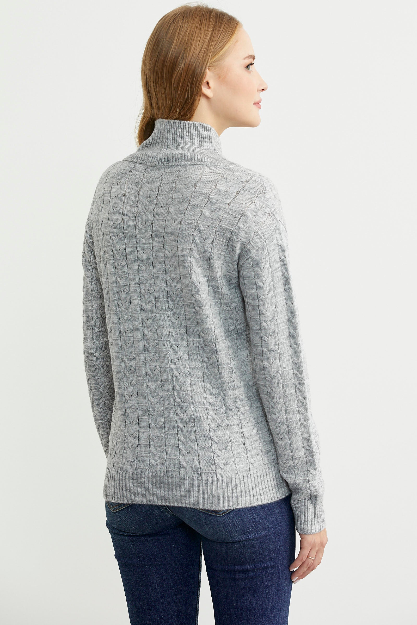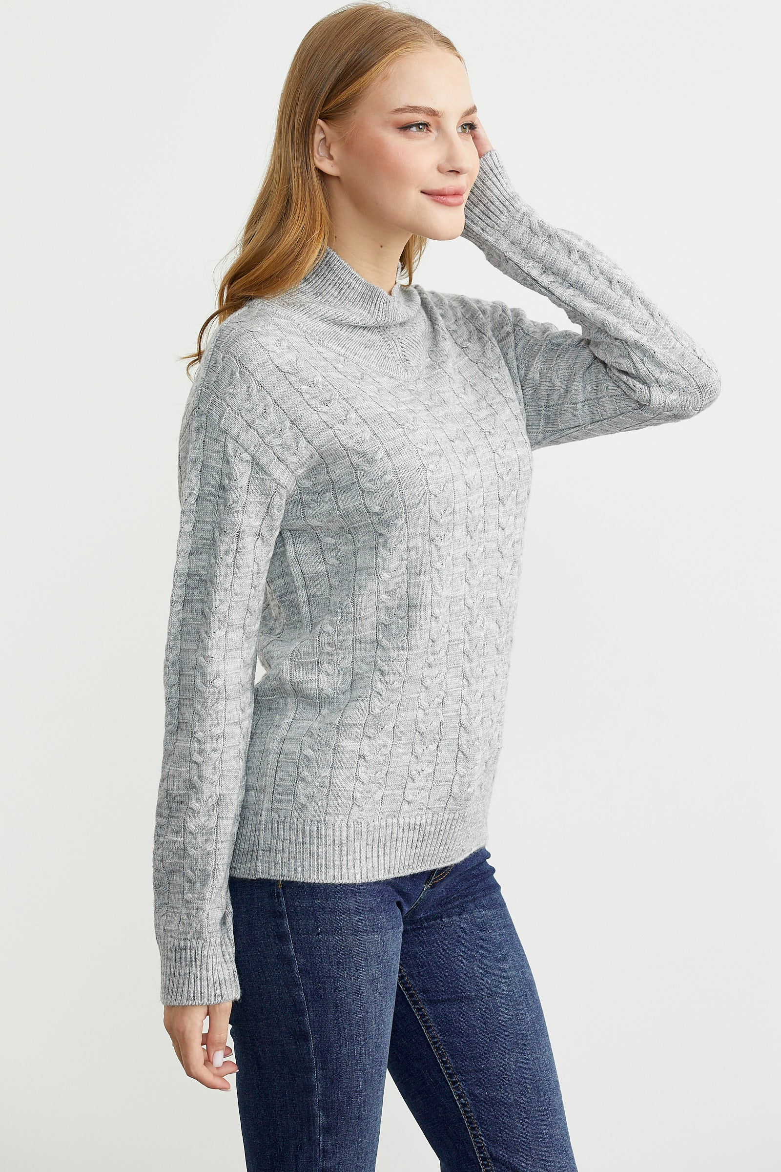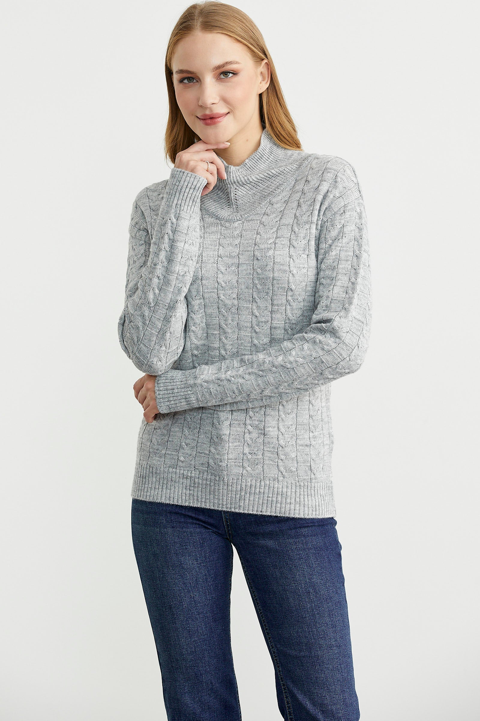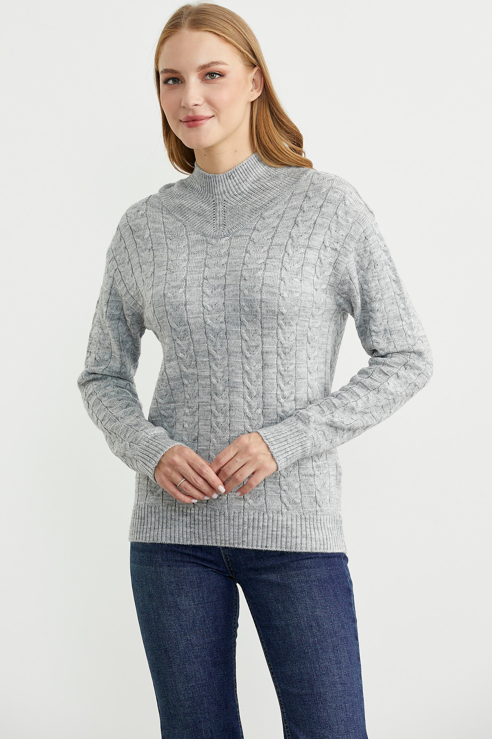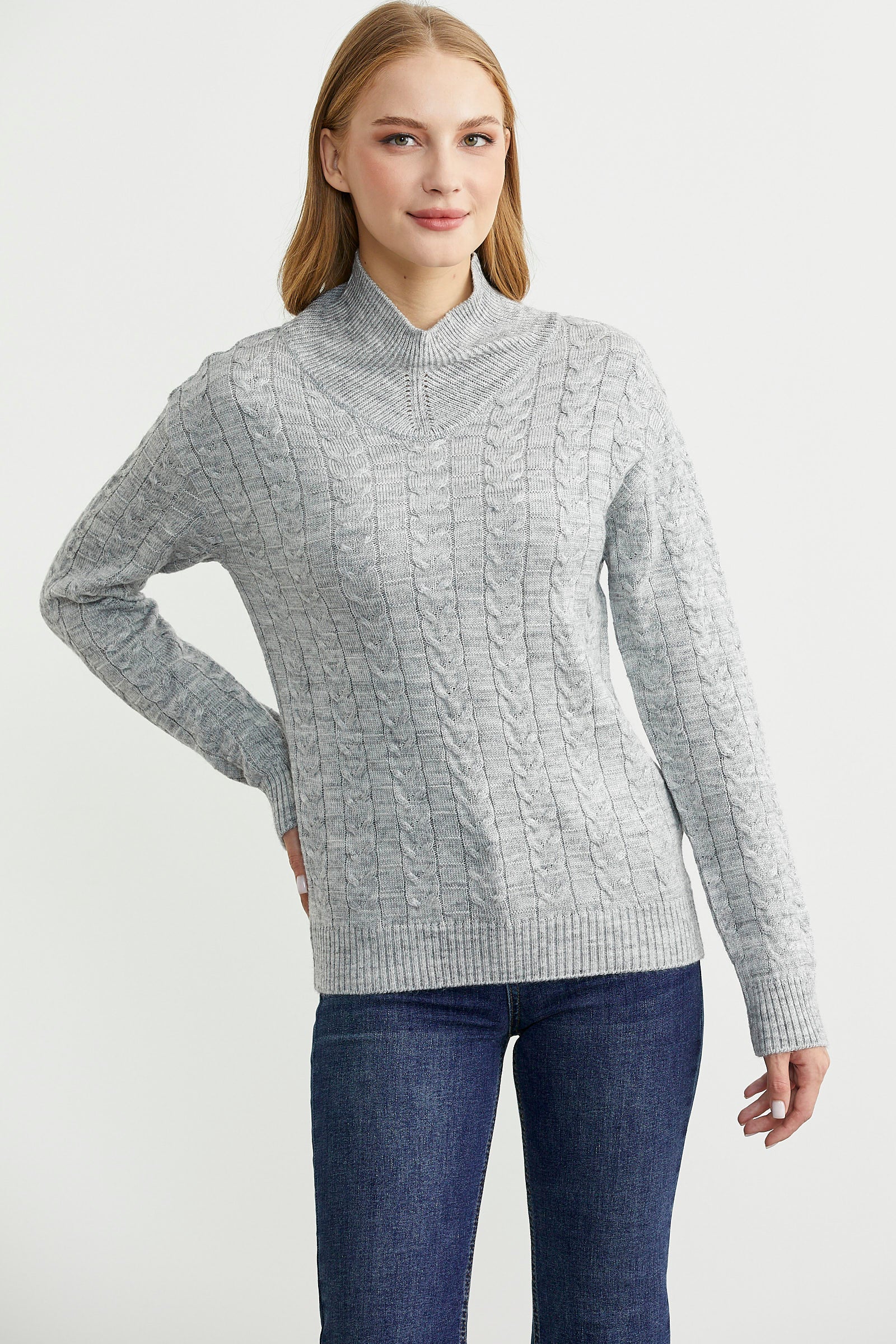 Dik Yaka Motifli Yünlü Triko Kazak - Açık Gri