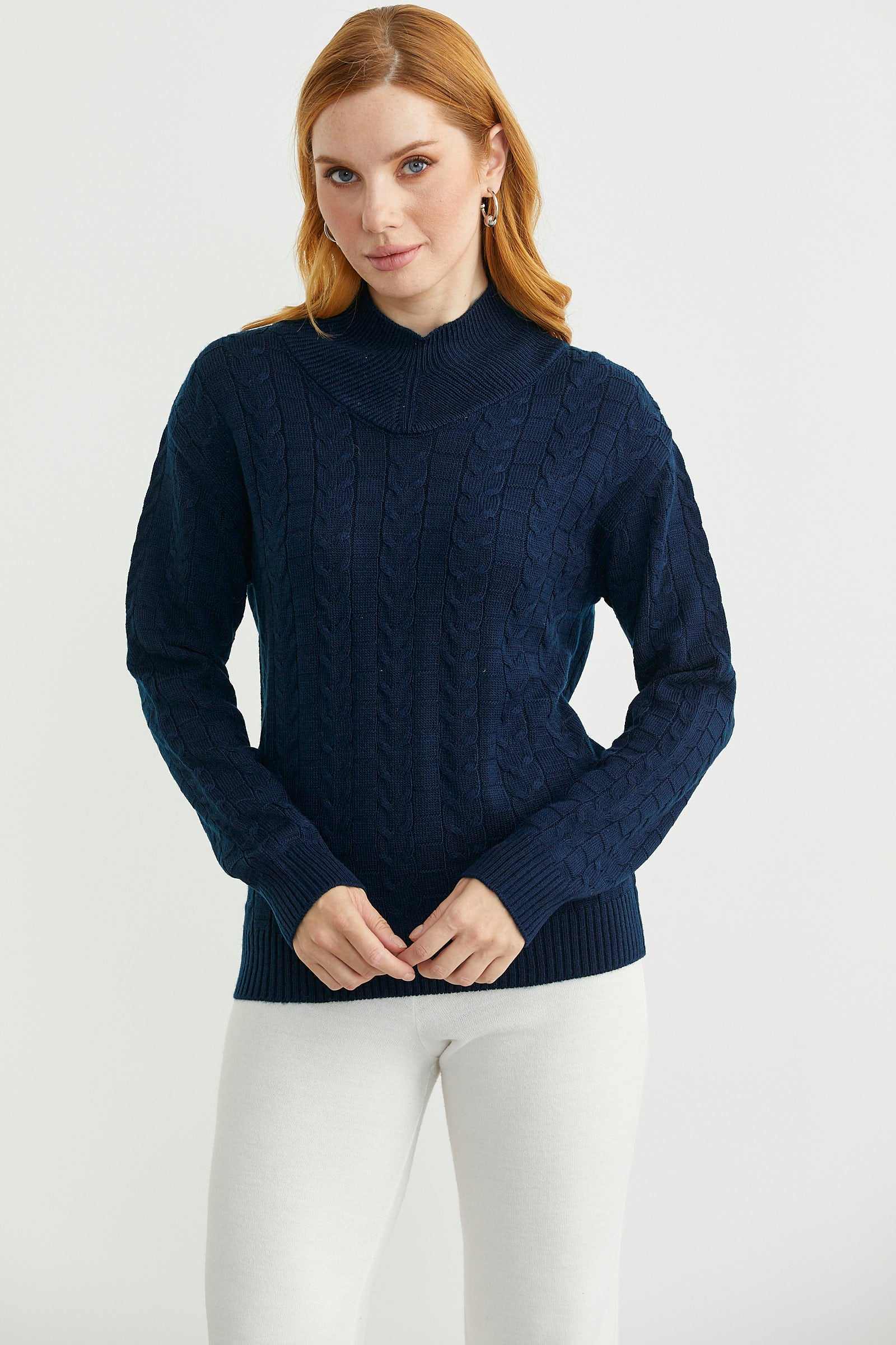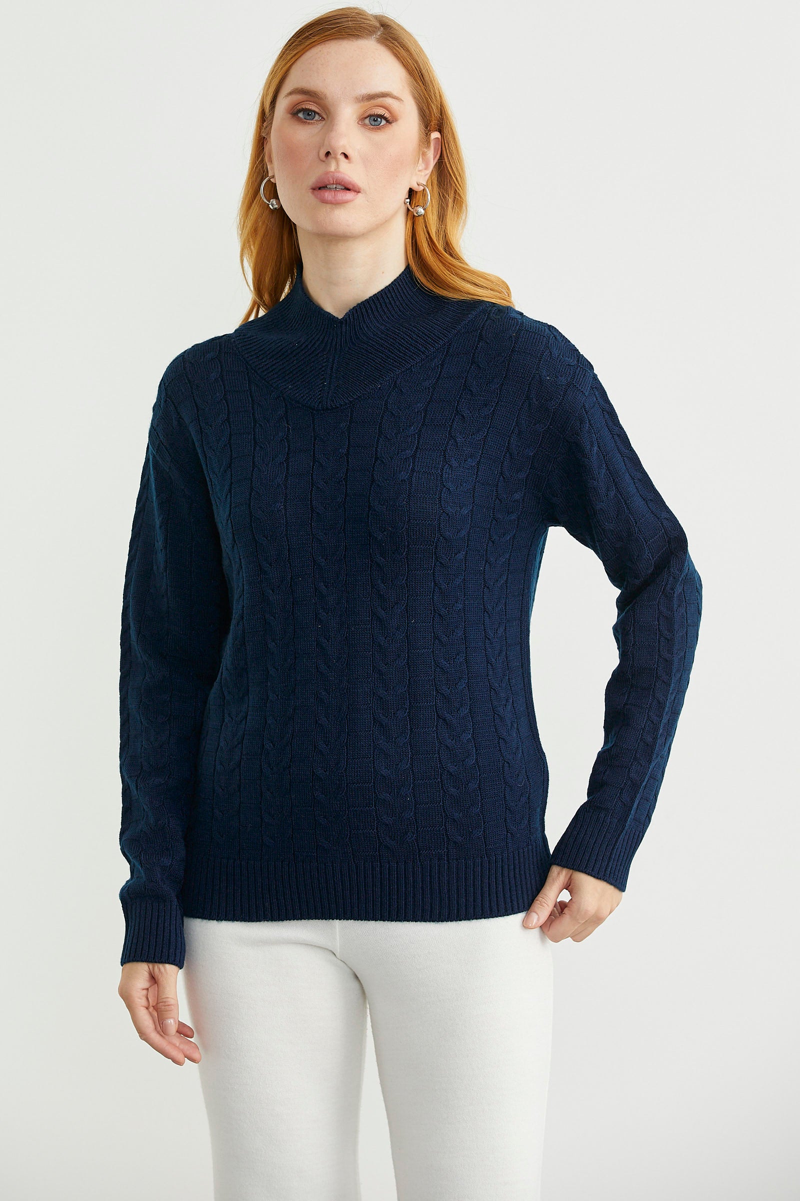 Dik Yaka Motifli Yünlü Triko Kazak - Lacivert