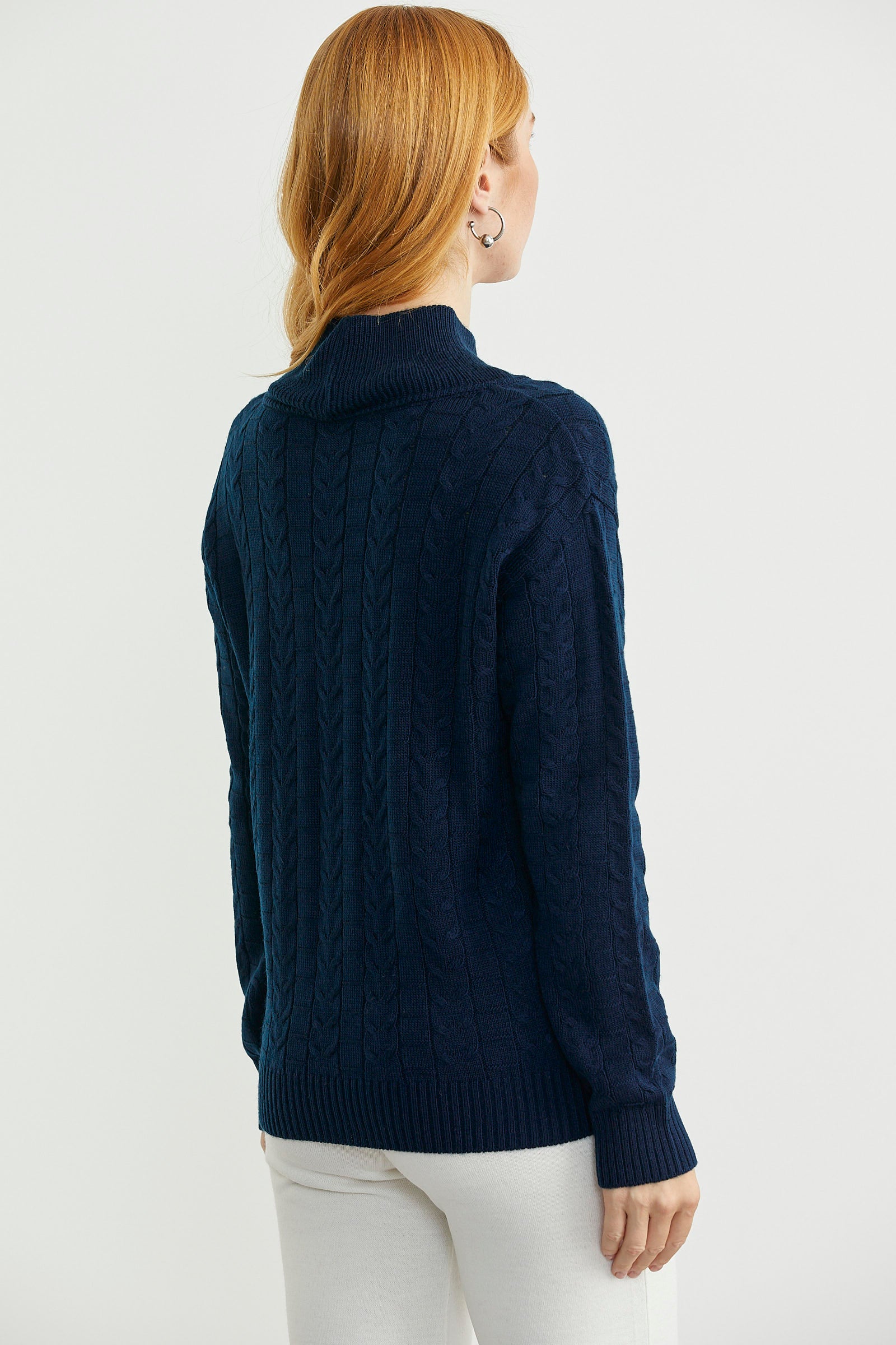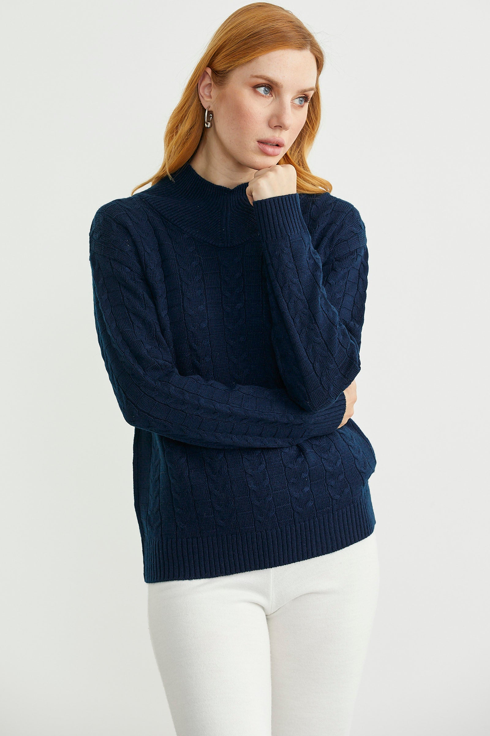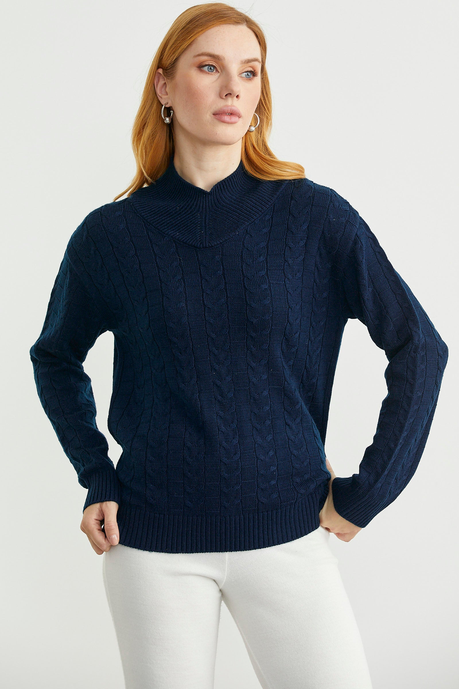 Verev dik yakalı, saç örgü desenli triko kazak. Etek ucu ve kol manşetleri düz bitişlidir.