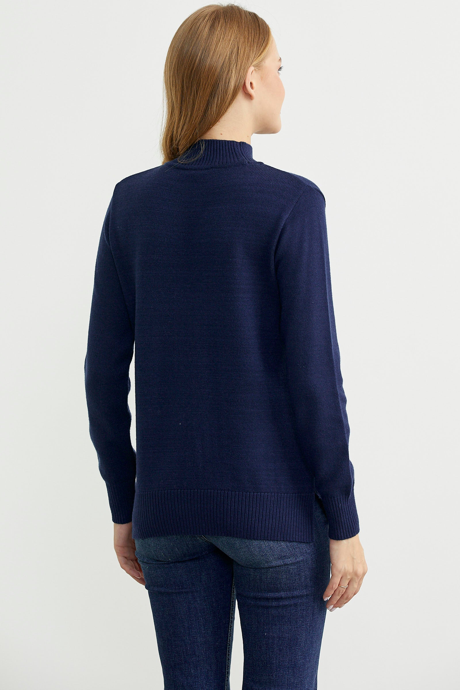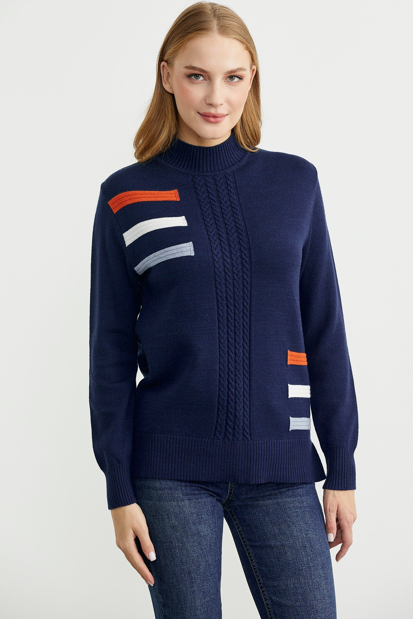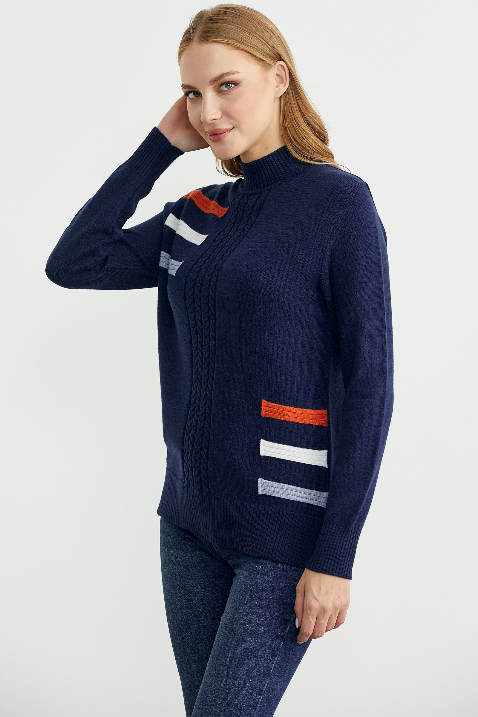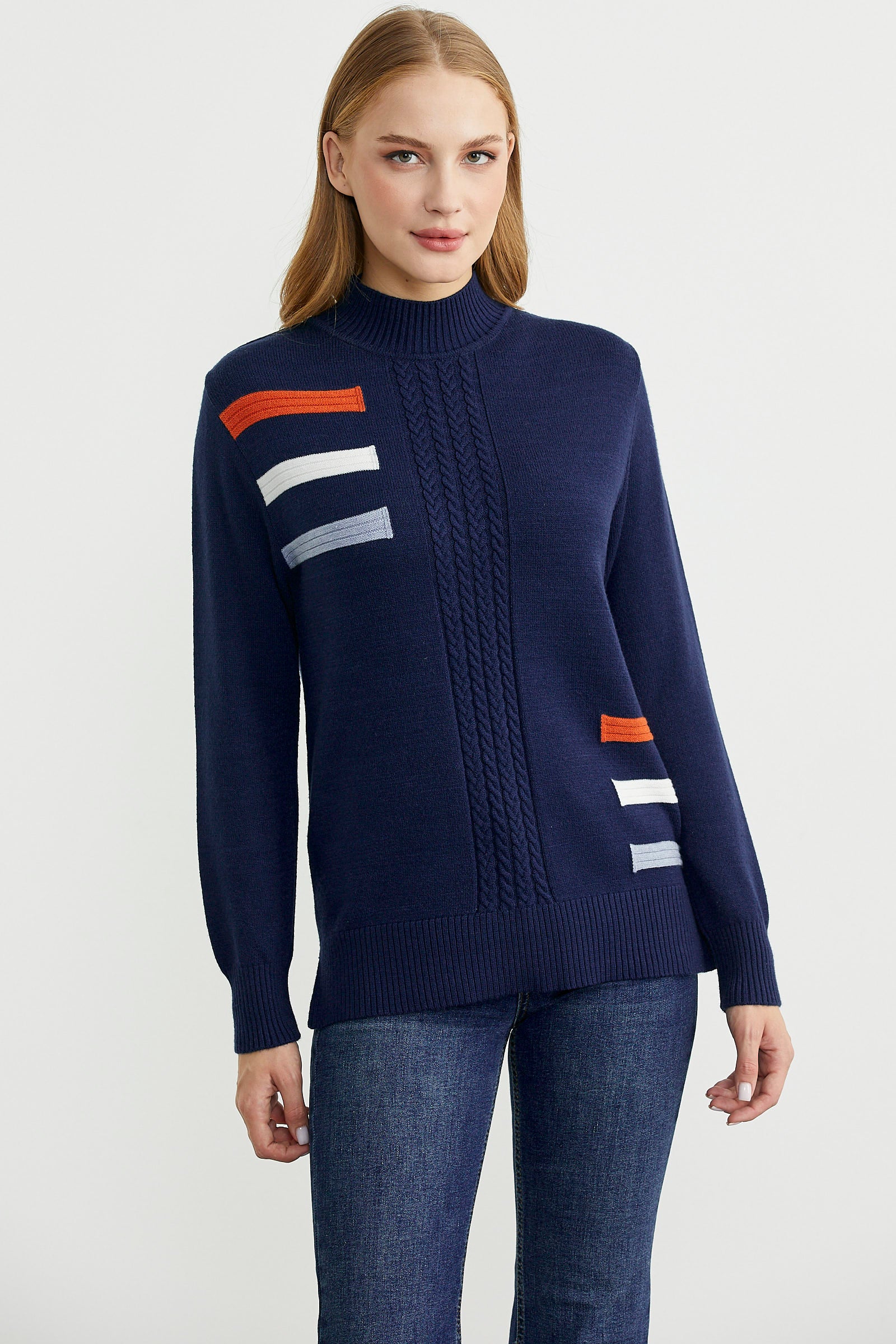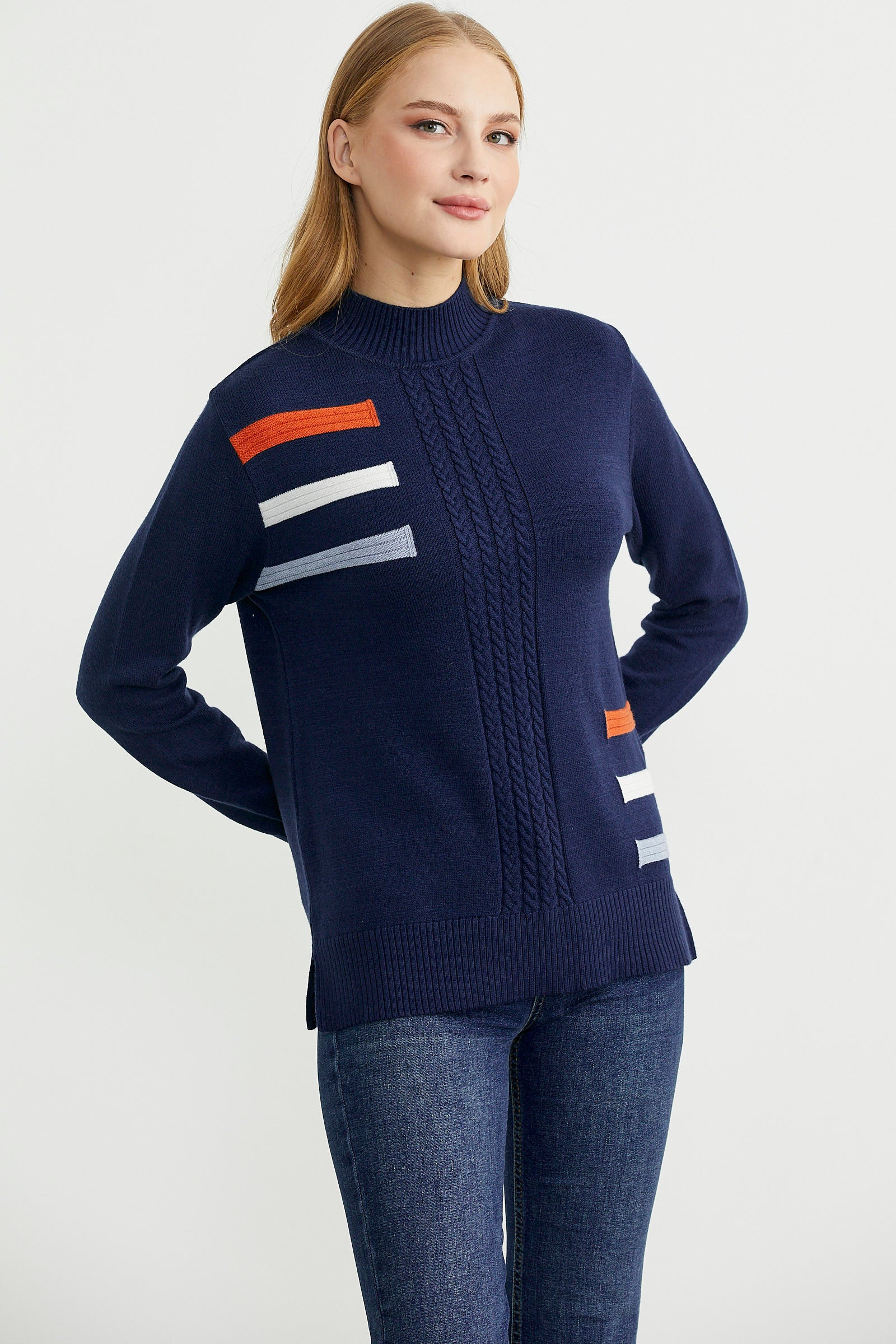 Dik Yaka Renk Detaylı Triko Kazak - Lacivert