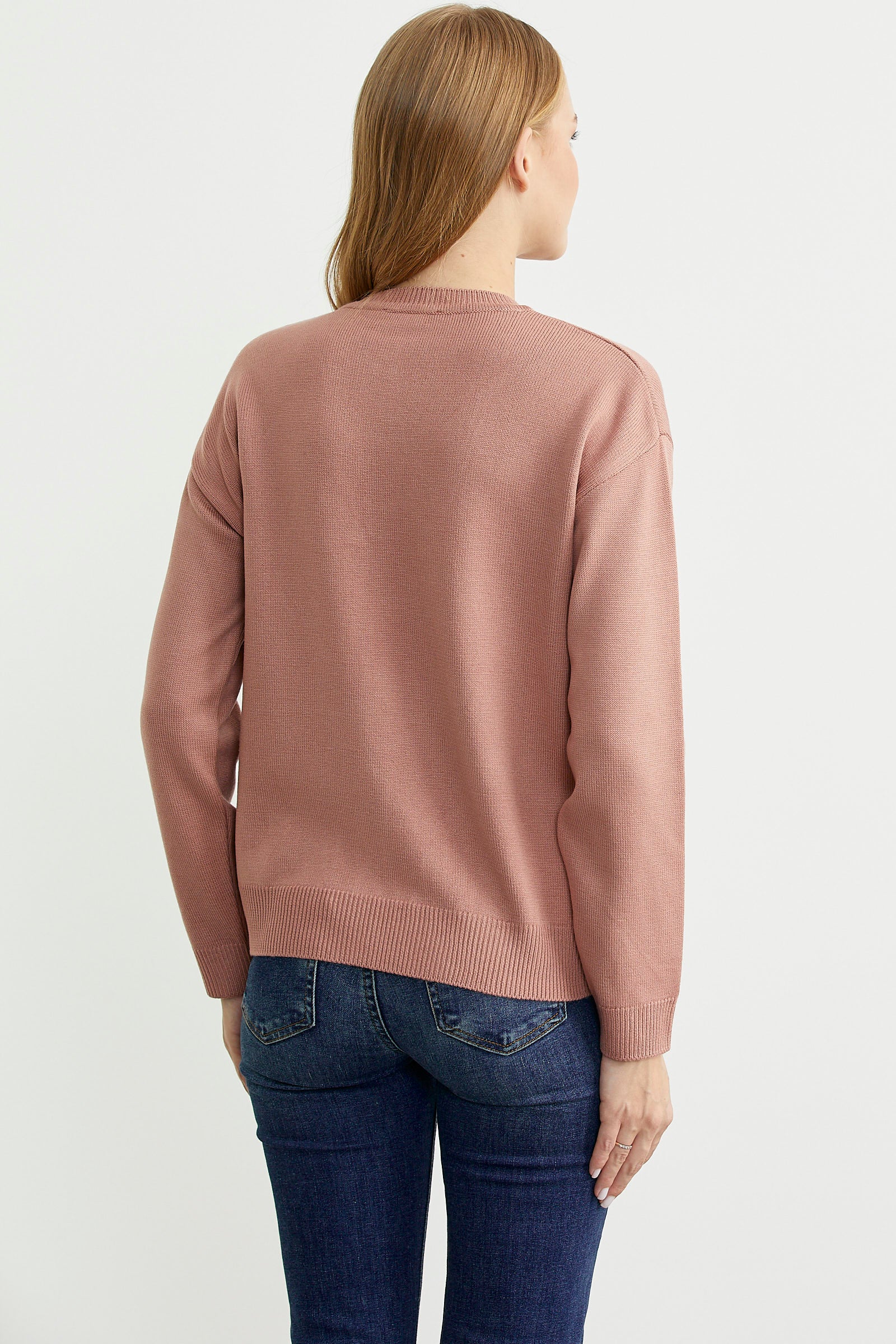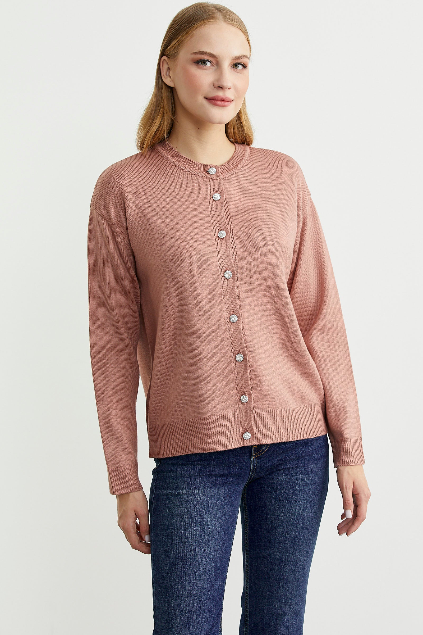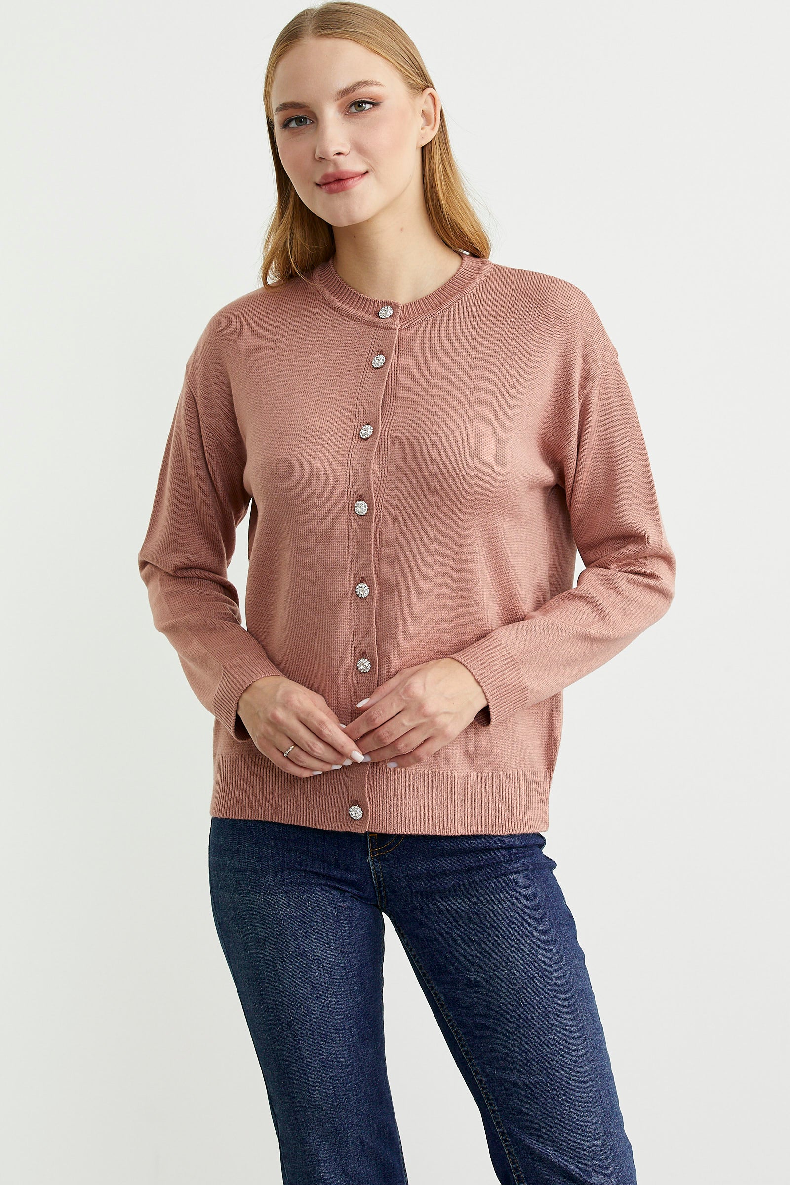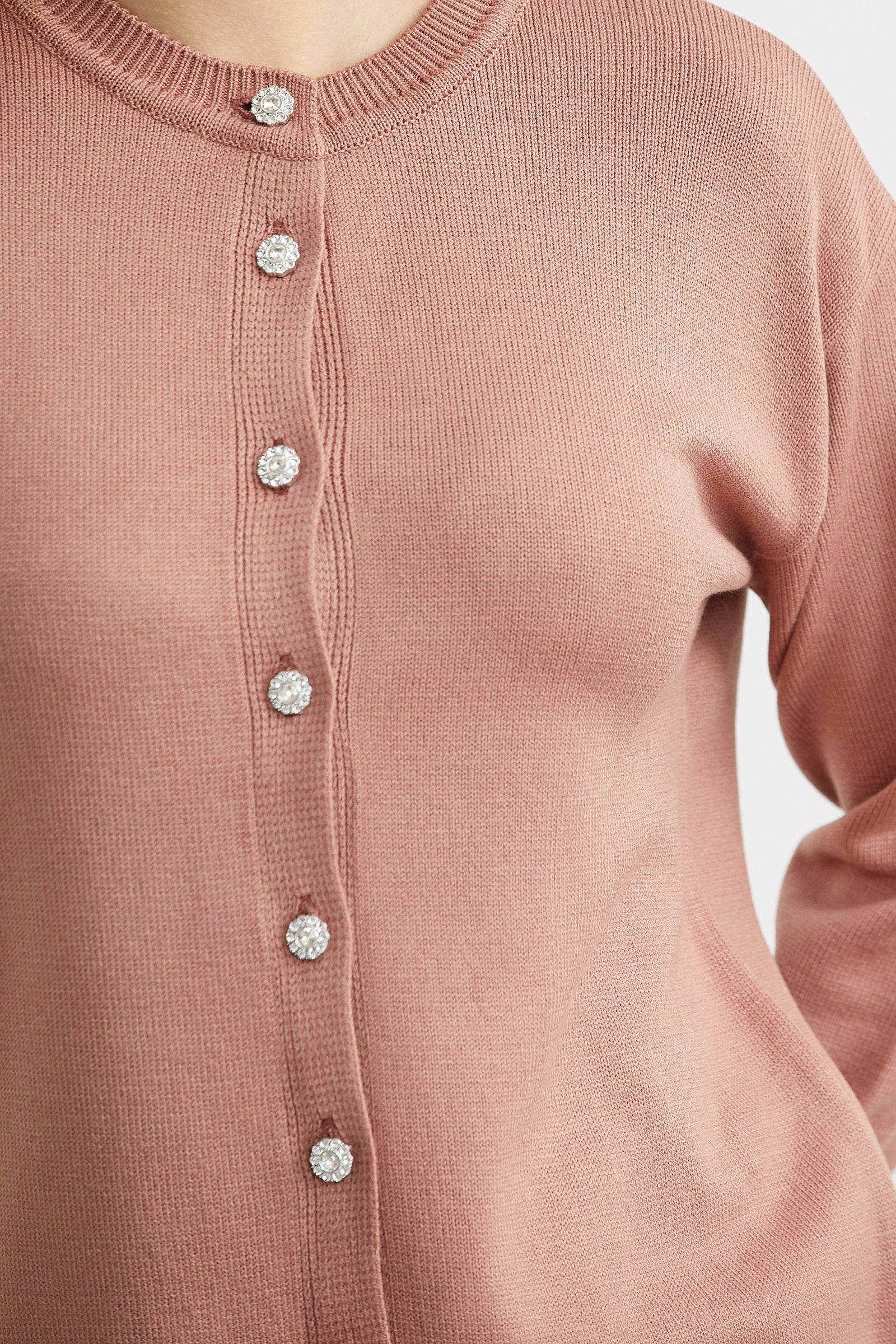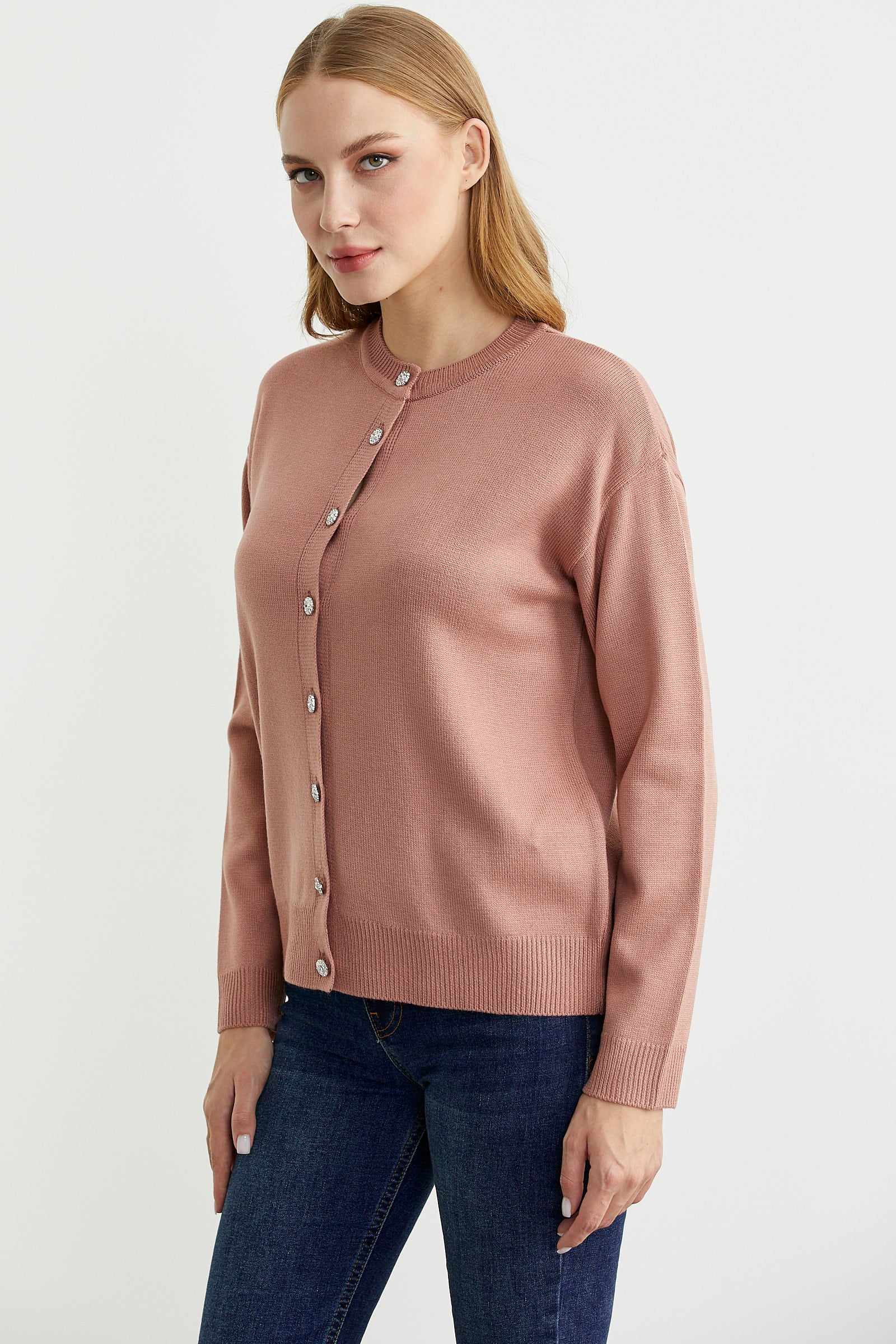 Düğme Detaylı Sıfır Yaka Triko Hırka - Koyu Gül