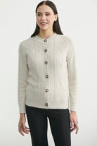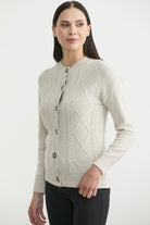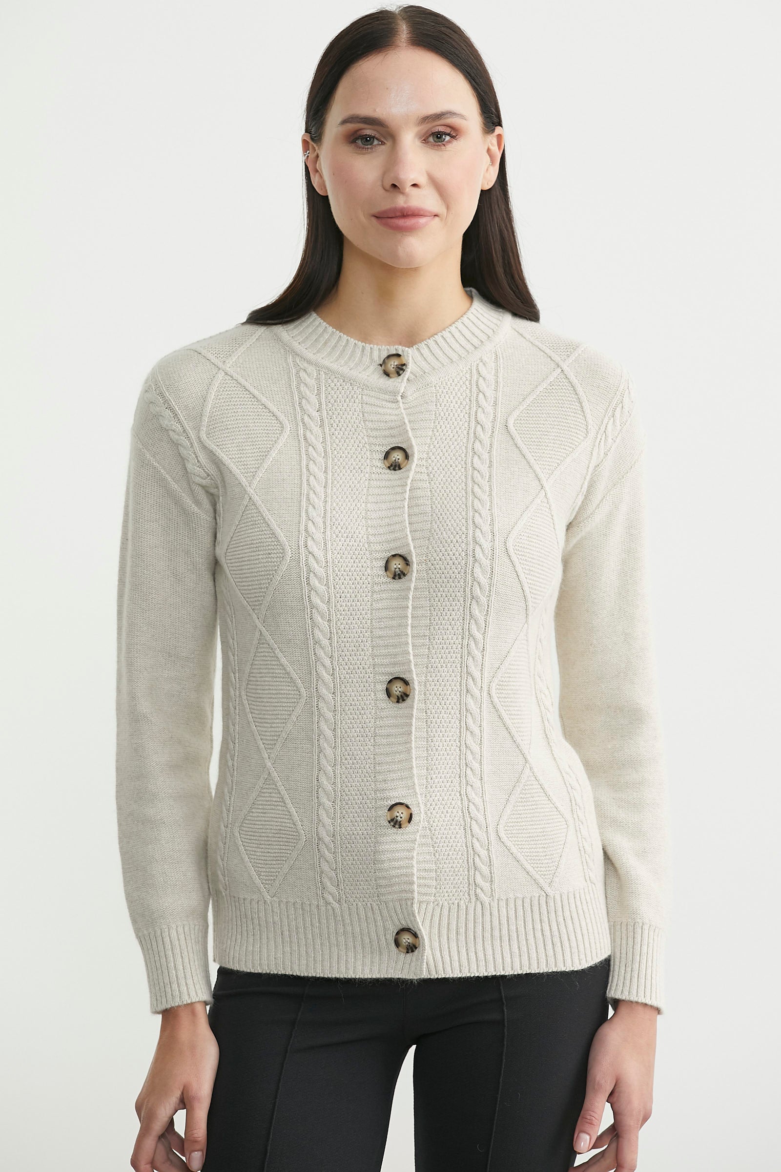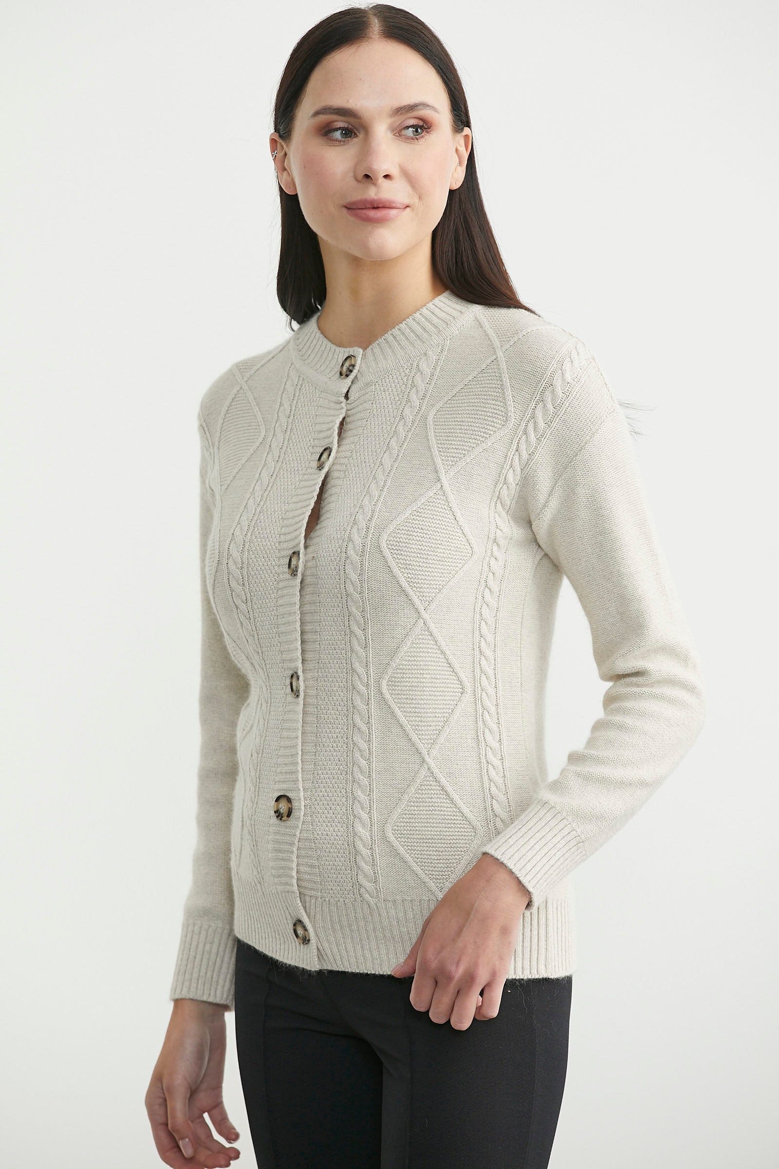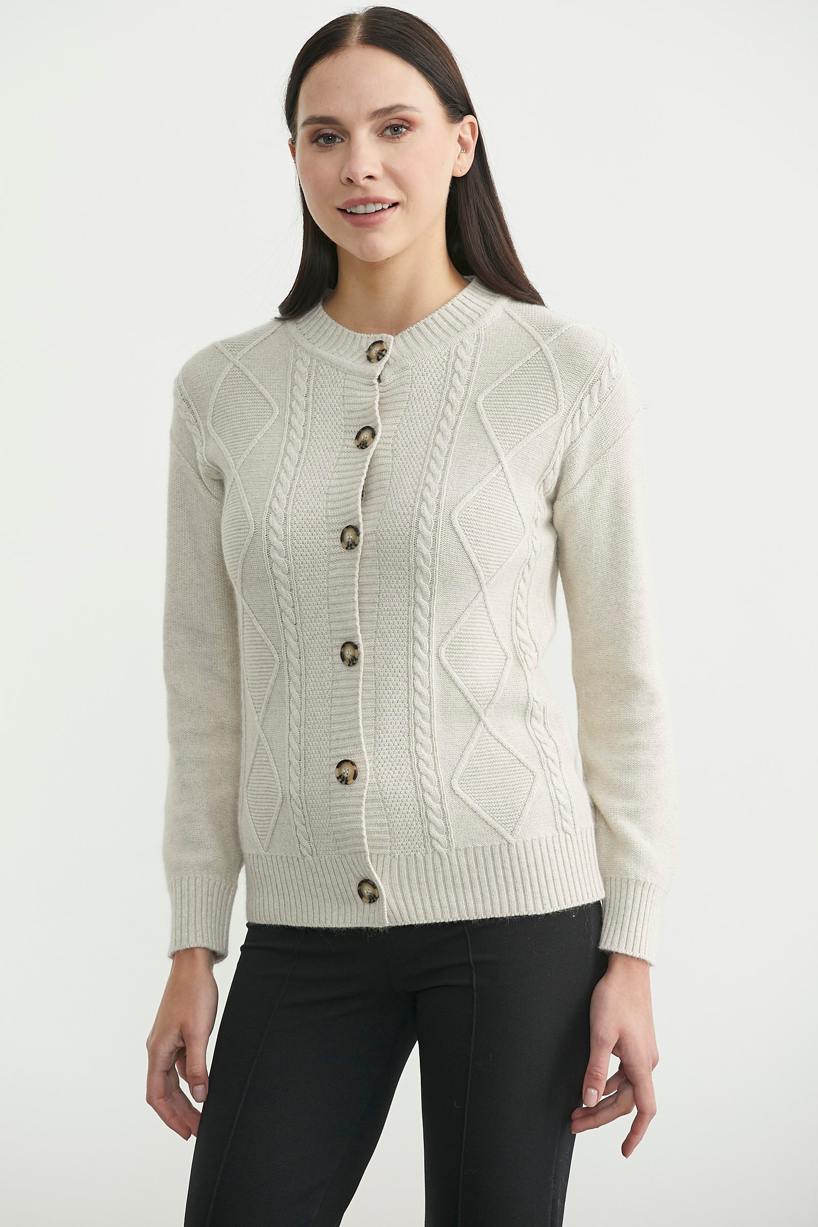 Yuvarlak yaka, vintage model klasik triko hırka. Desenli ve düğme kapamalı.
