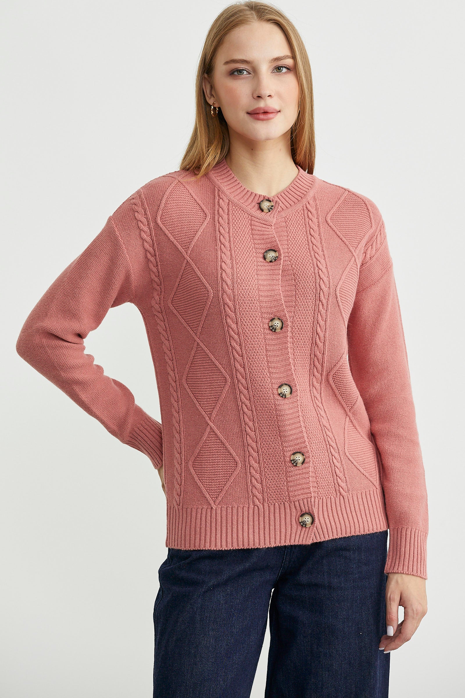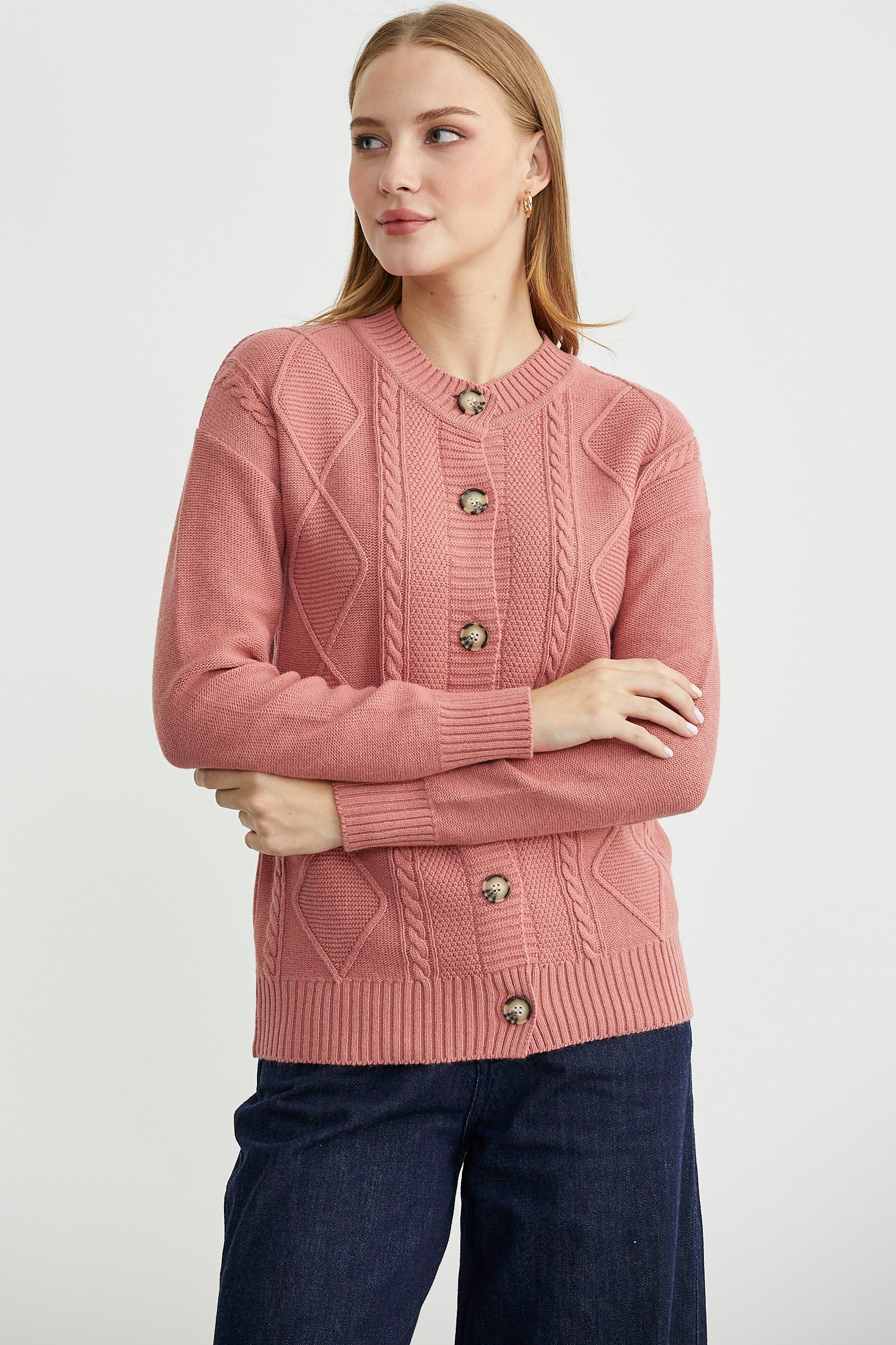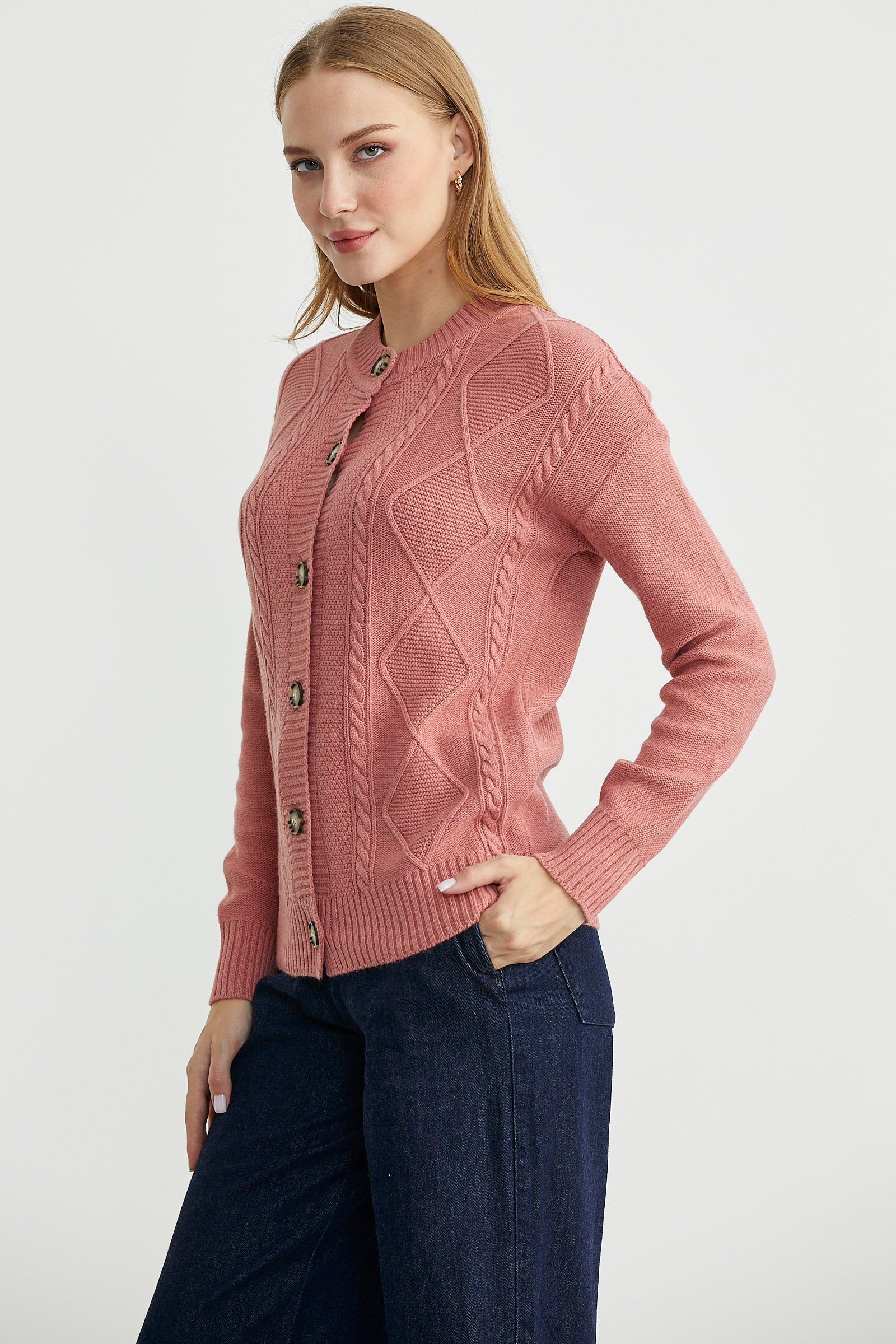 Yuvarlak yaka, vintage model klasik triko hırka. Desenli ve düğme kapamalı.