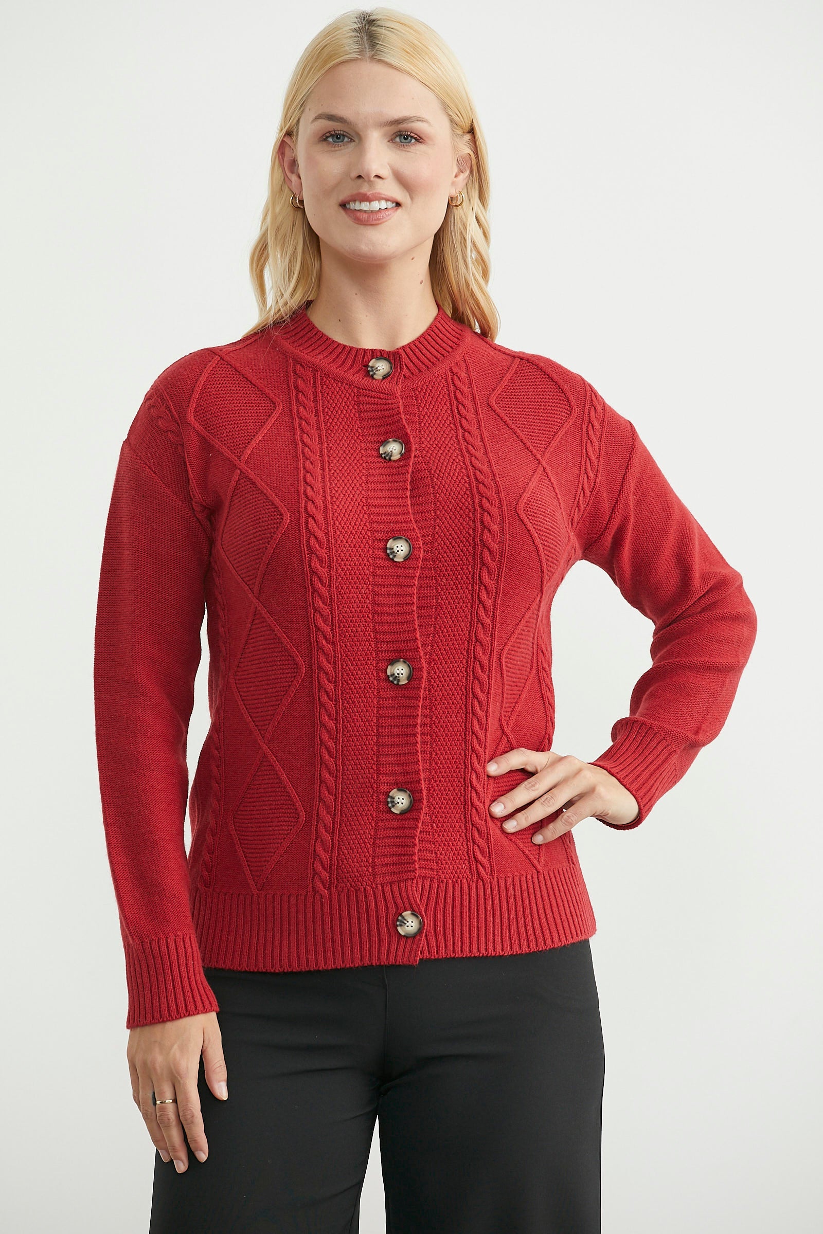 Yuvarlak yaka, vintage model klasik triko hırka. Desenli ve düğme kapamalı.
