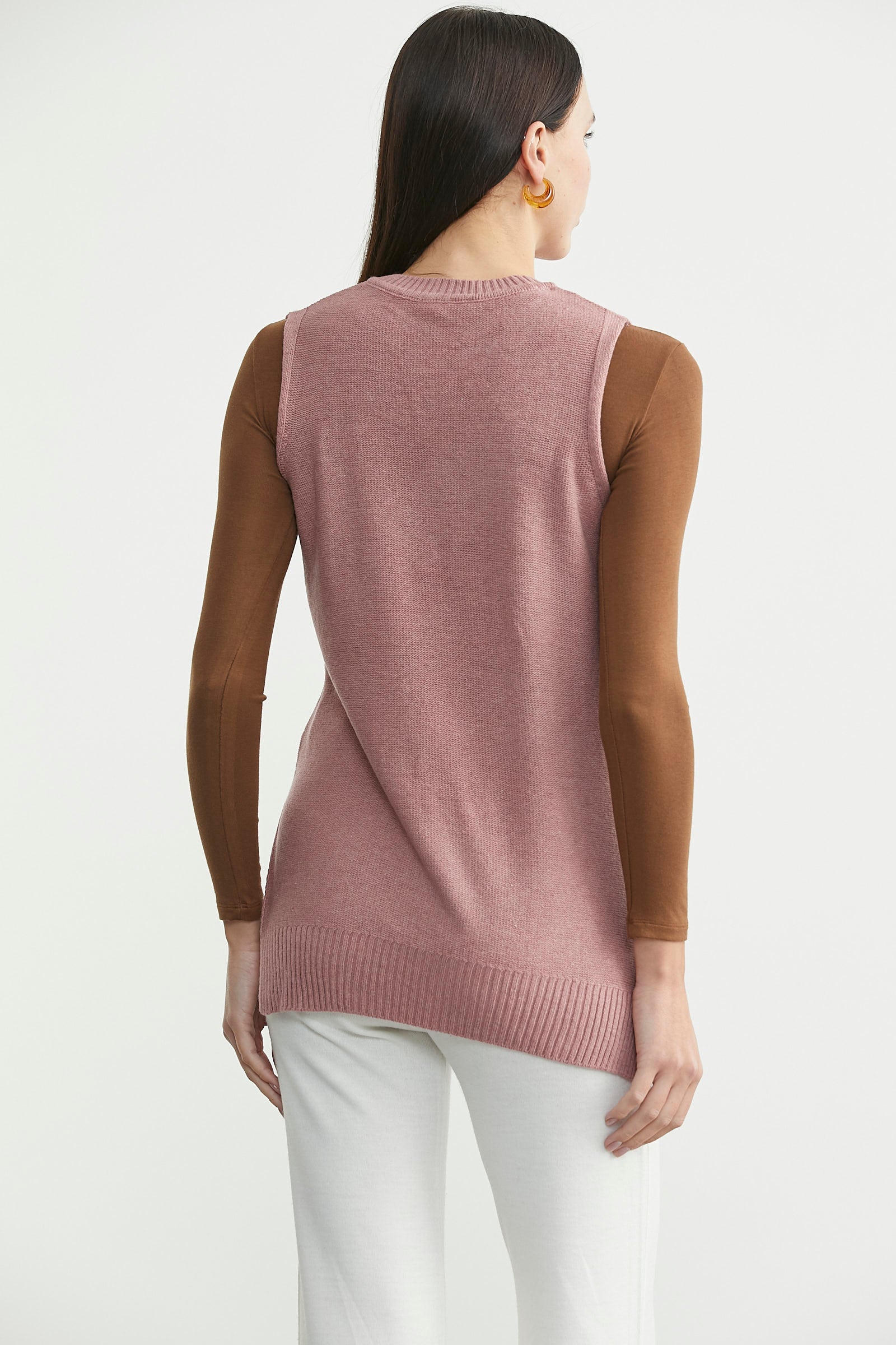 Yanı yırtmaç detaylı, saç örgüsü yuvarlak yaka süveter. Yaka, kol ağızları ve etek ucu lastik örgülü.