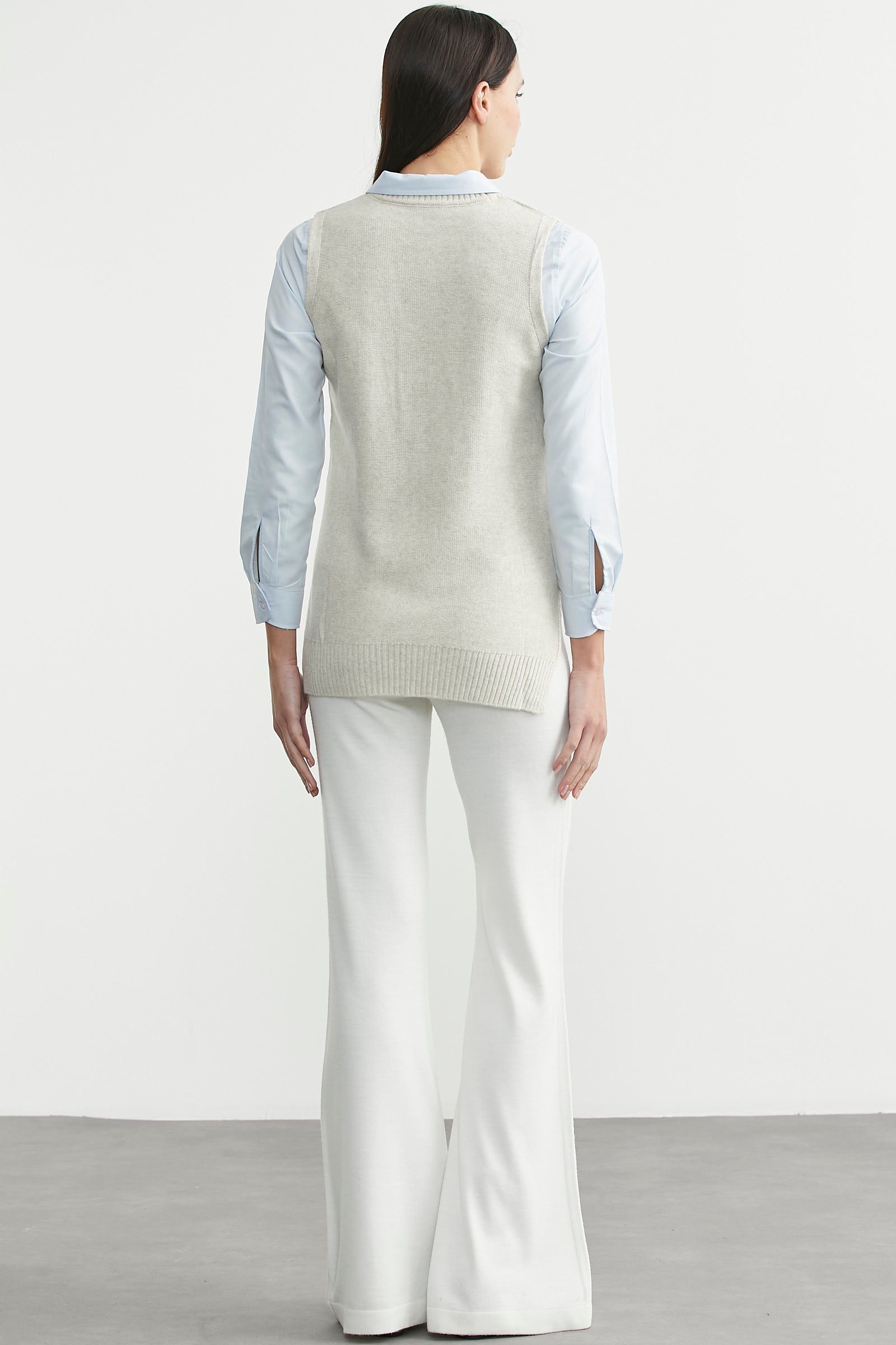 Yanı yırtmaç detaylı, saç örgüsü yuvarlak yaka süveter. Yaka, kol ağızları ve etek ucu lastik örgülü.