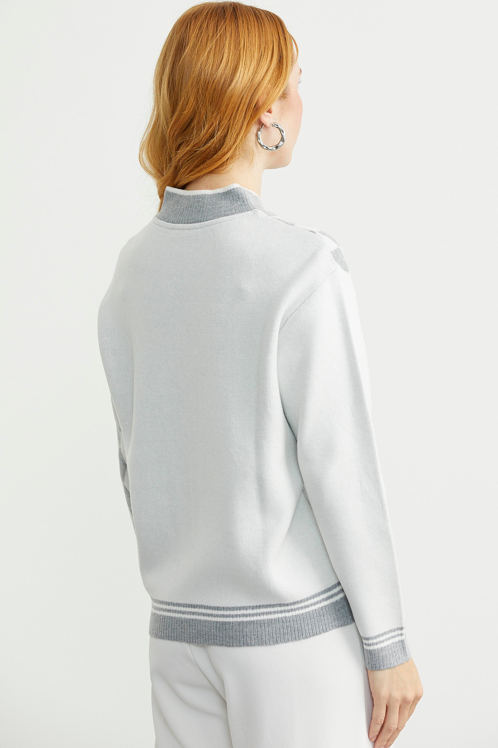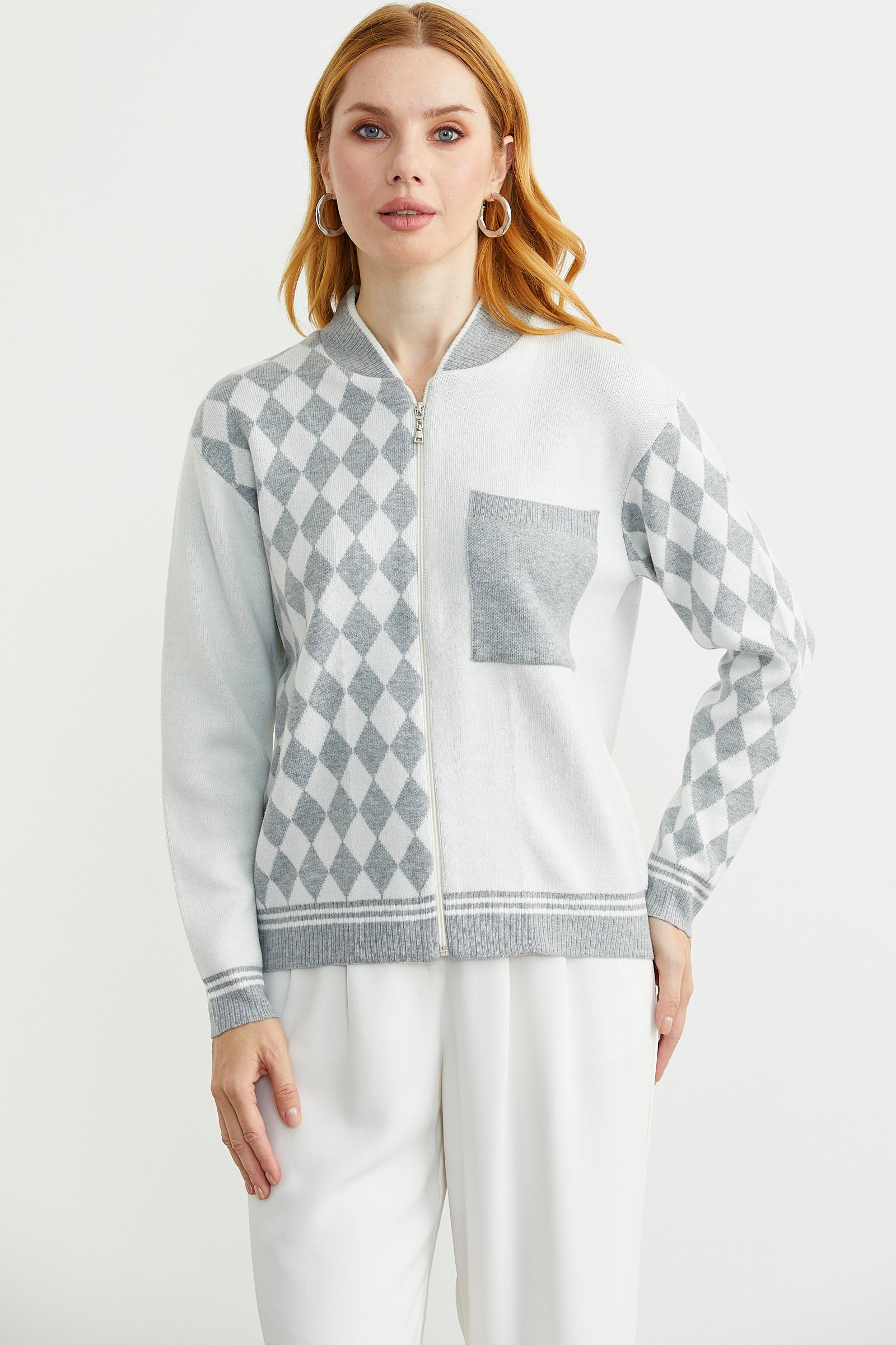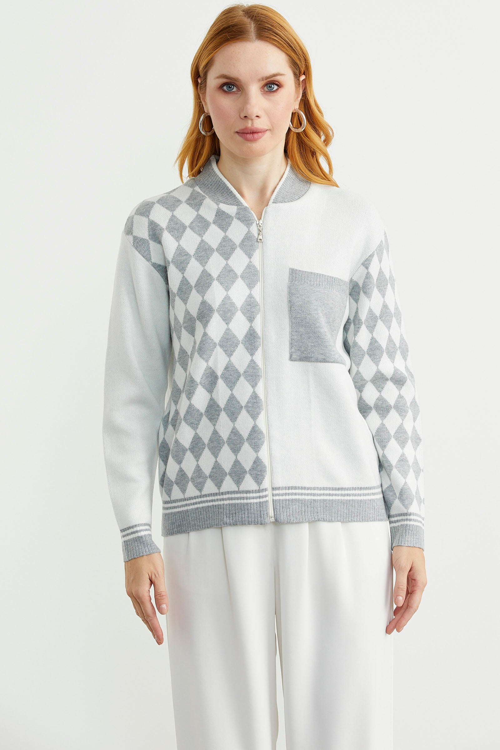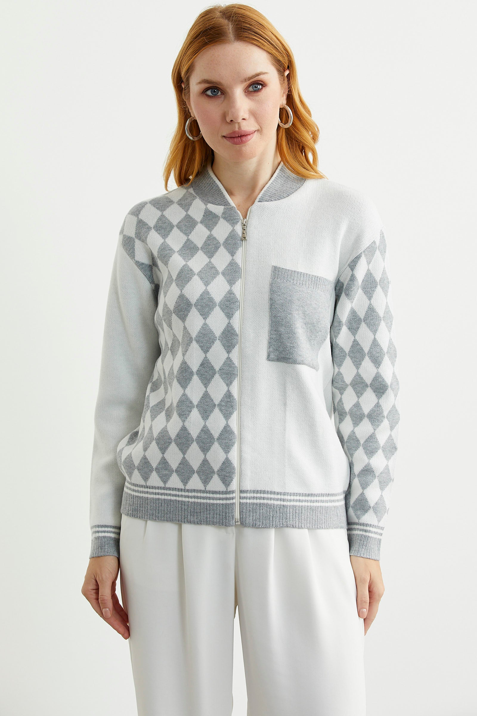Fermuarlı Baklava Motifli Triko Hırka - Gri