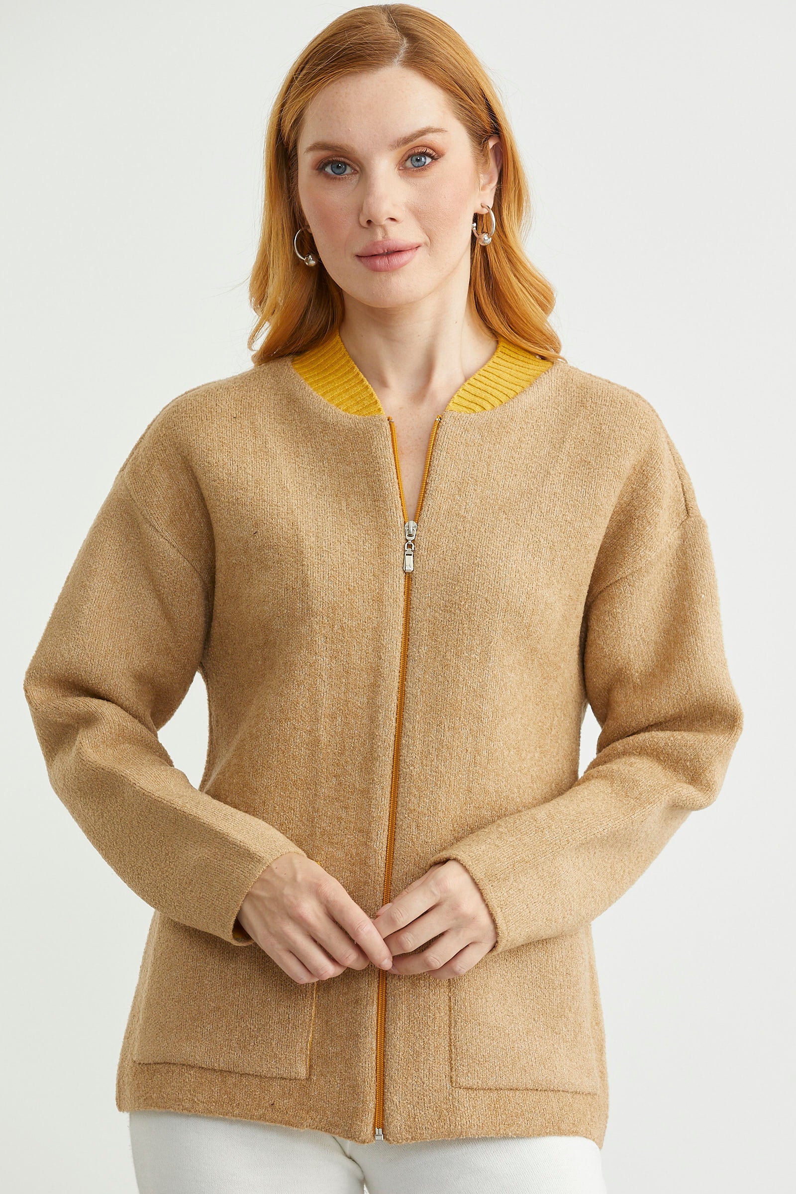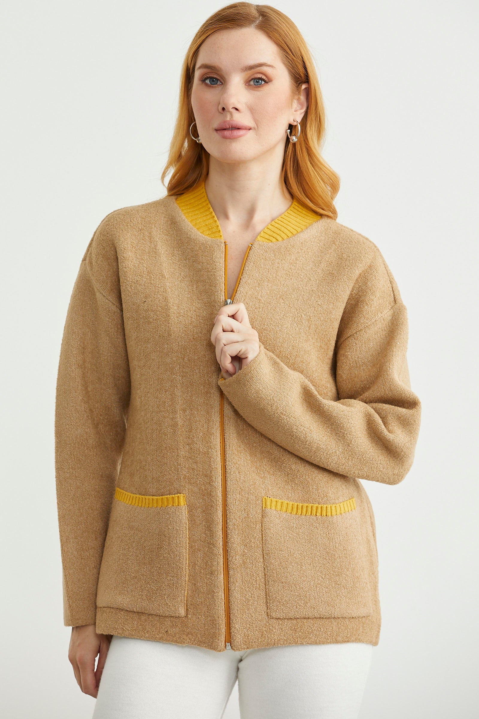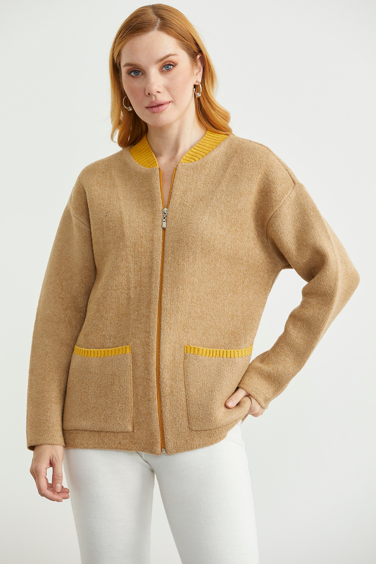 Fermuarlı Cep Detaylı Yünlü Triko Ceket - Bej