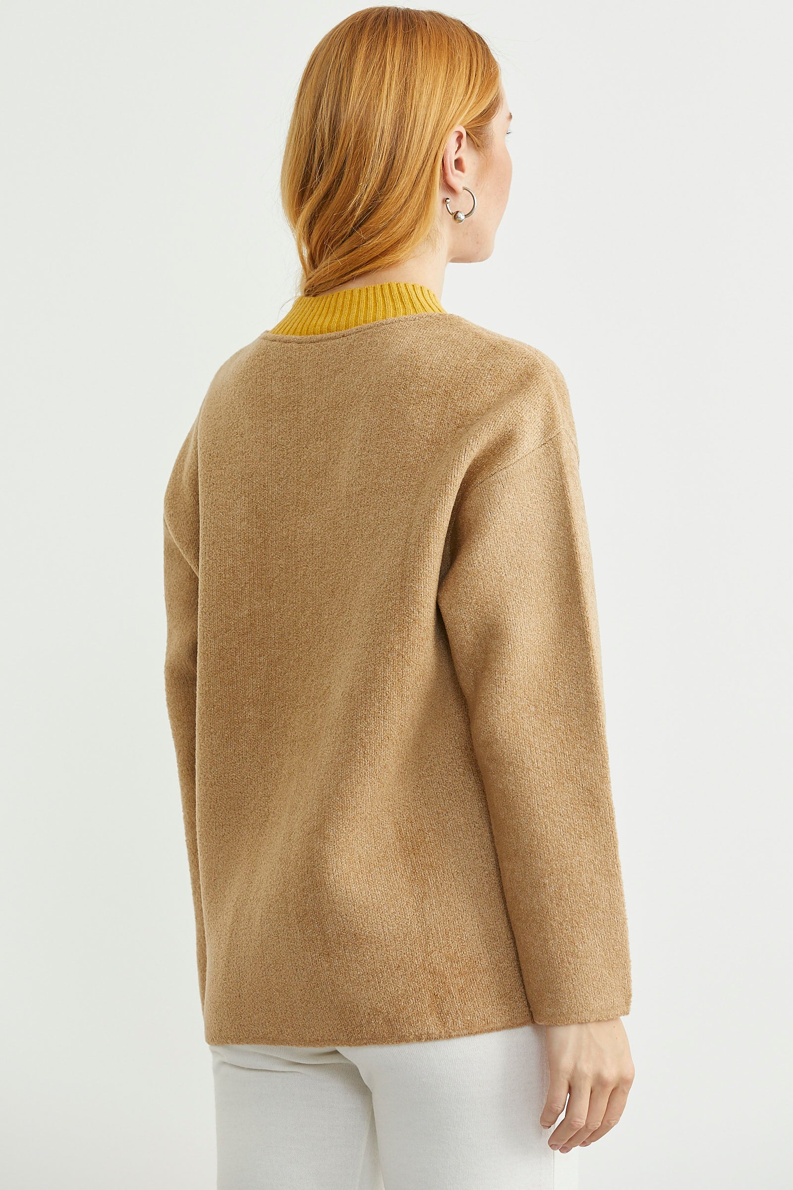 Yüksek oranda yün içerir. Kalın dokuludur. Fitilli yuvarlak yakalı, fermuar kapamalı, cepli triko ceket.