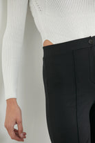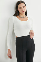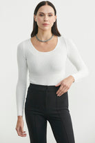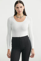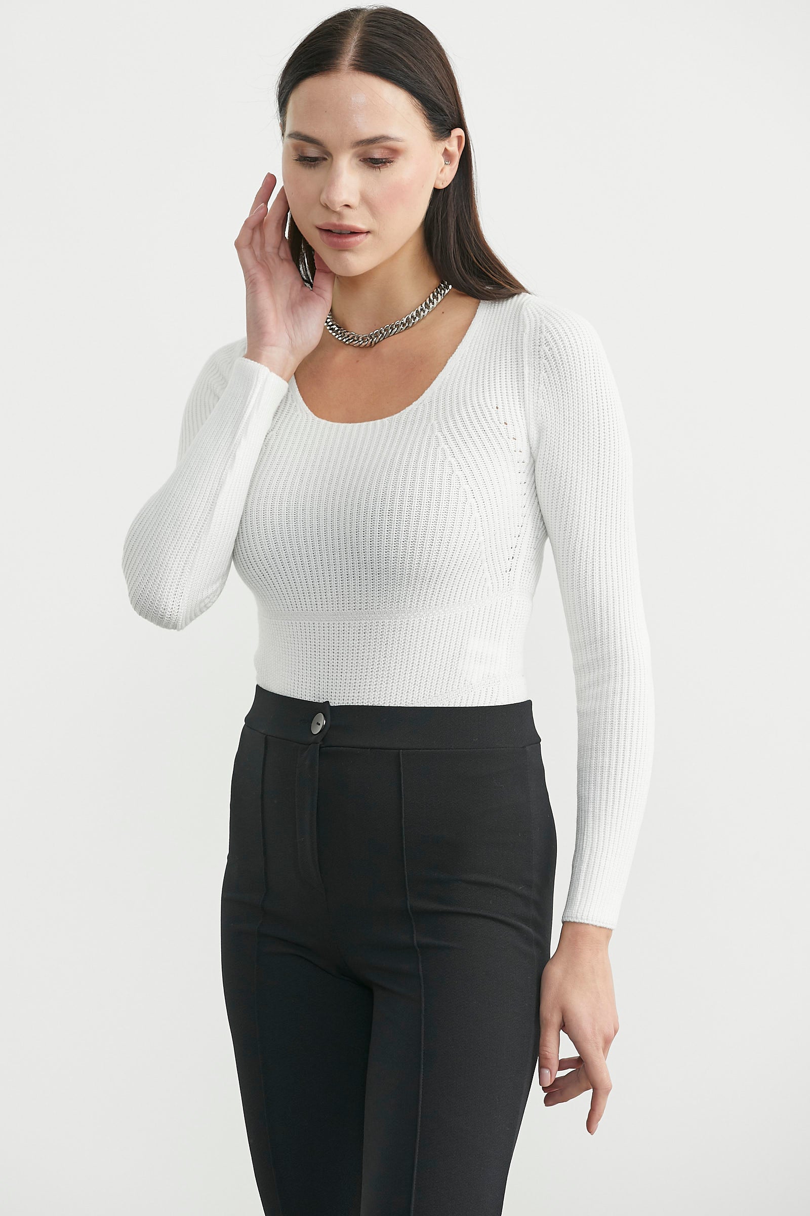 Oval yakalı, uzun kol, vücudu saran body. Alt kısmı çıtçıtlıdır.