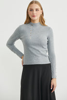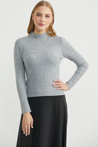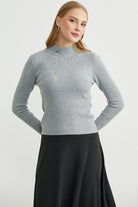 Fitilli Dik Yaka Basic Triko Kazak - Gri