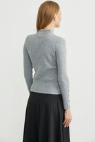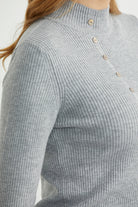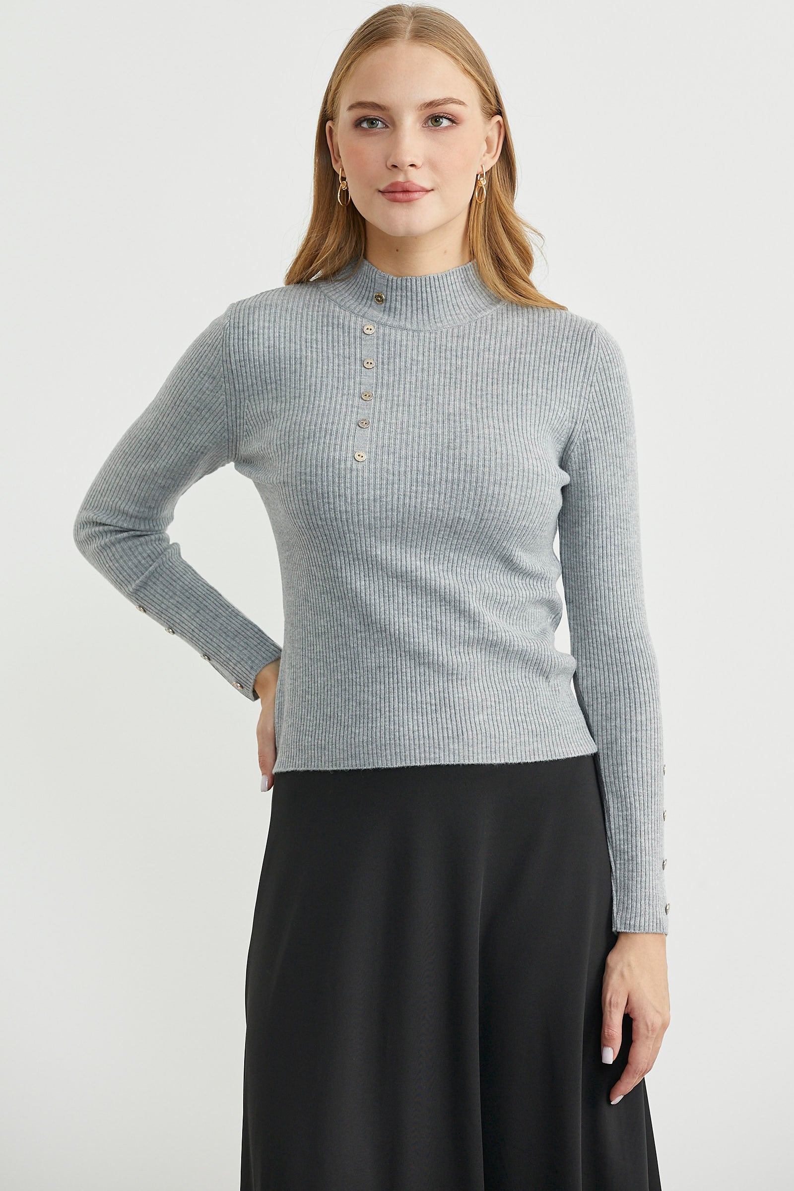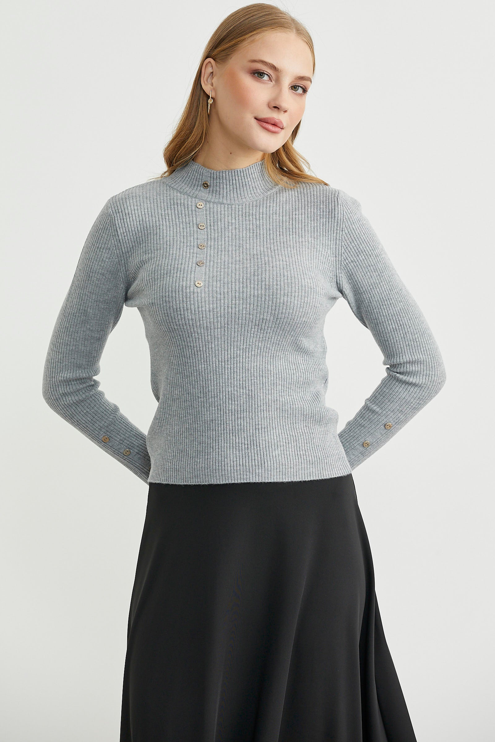 Dik yaka, ekstra rahatlık için esnek, bedene oturan triko kazak. Düğme detaylarıyla hareketlendirilmiş.