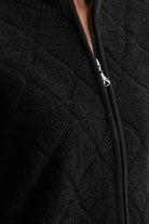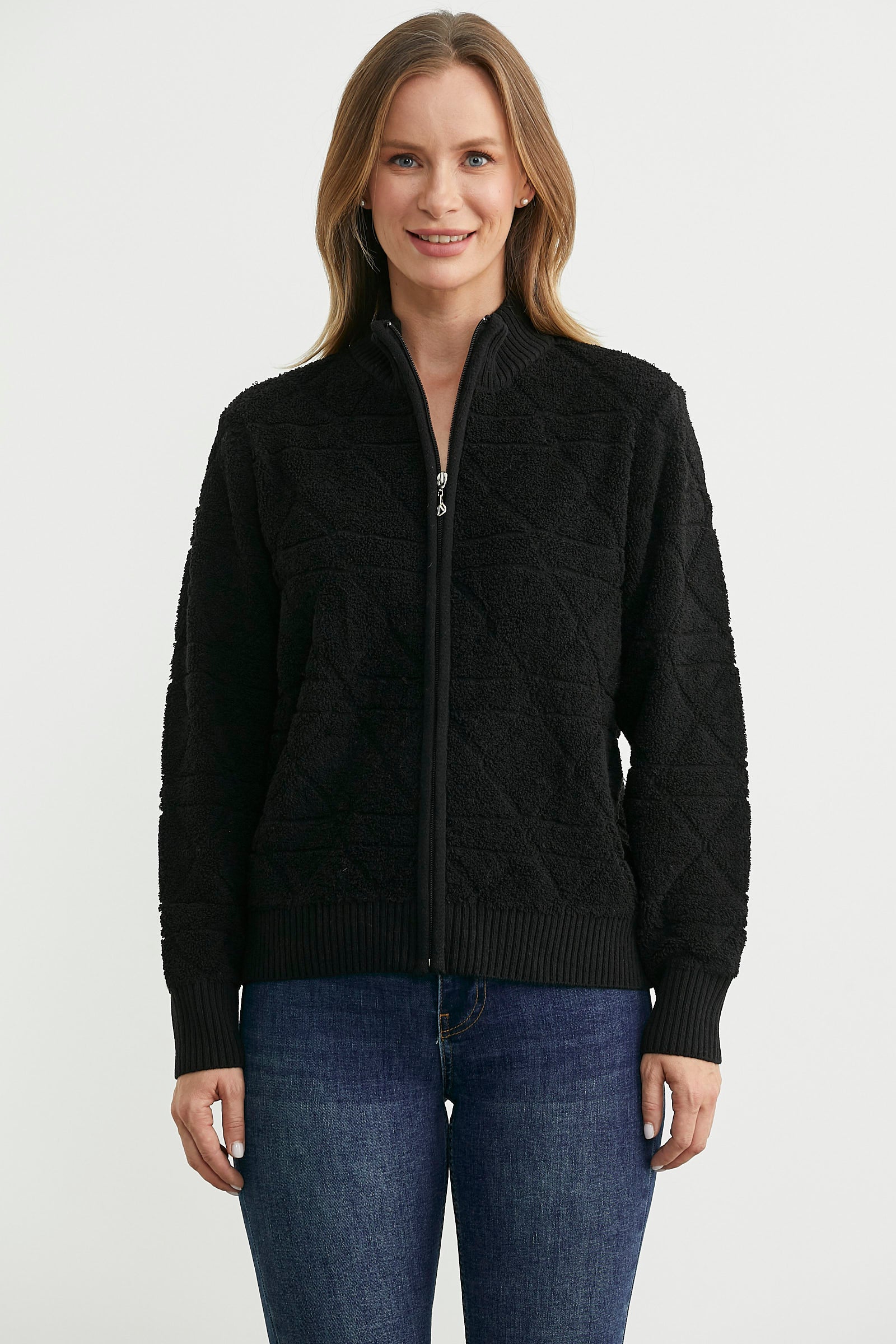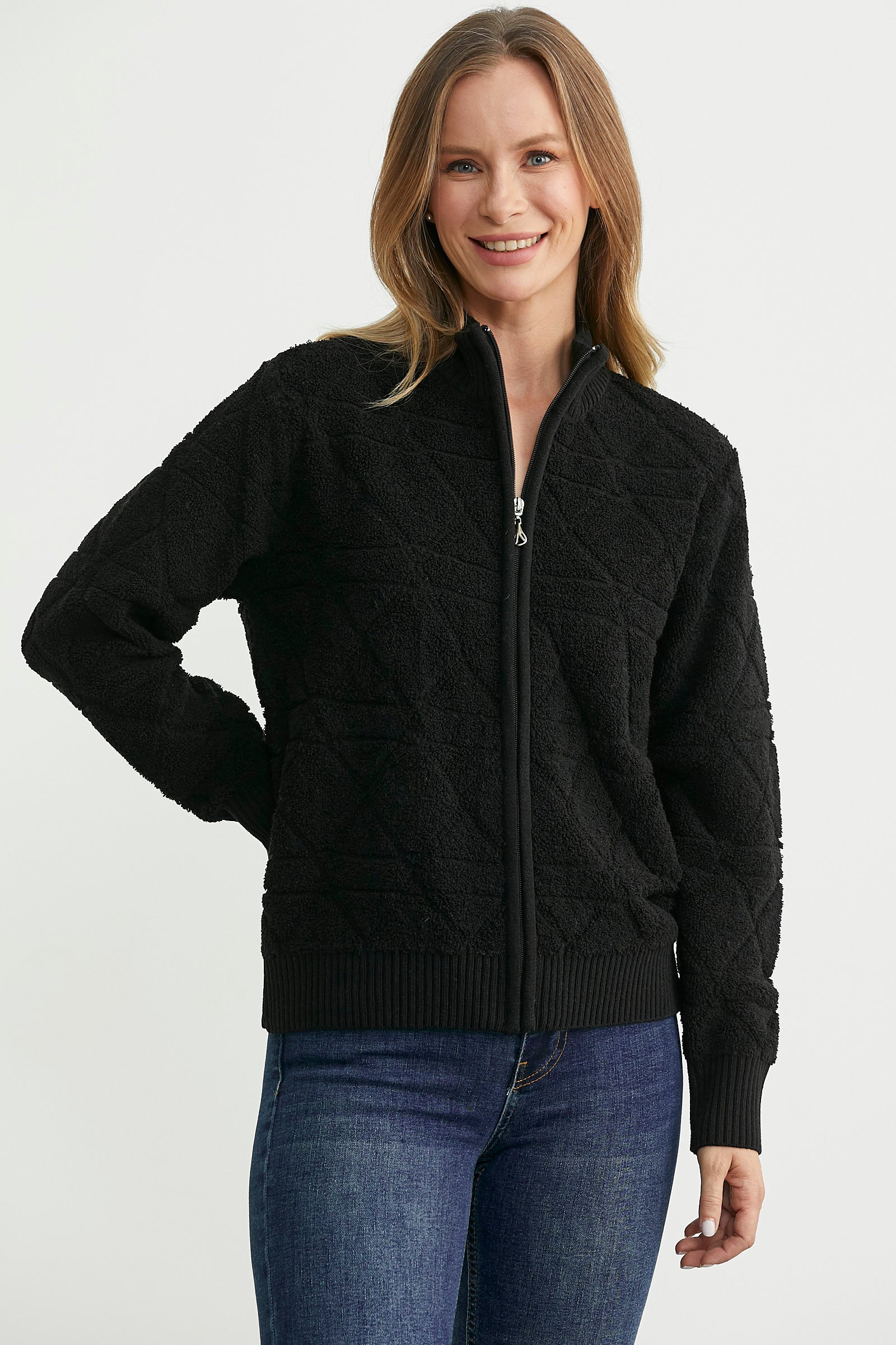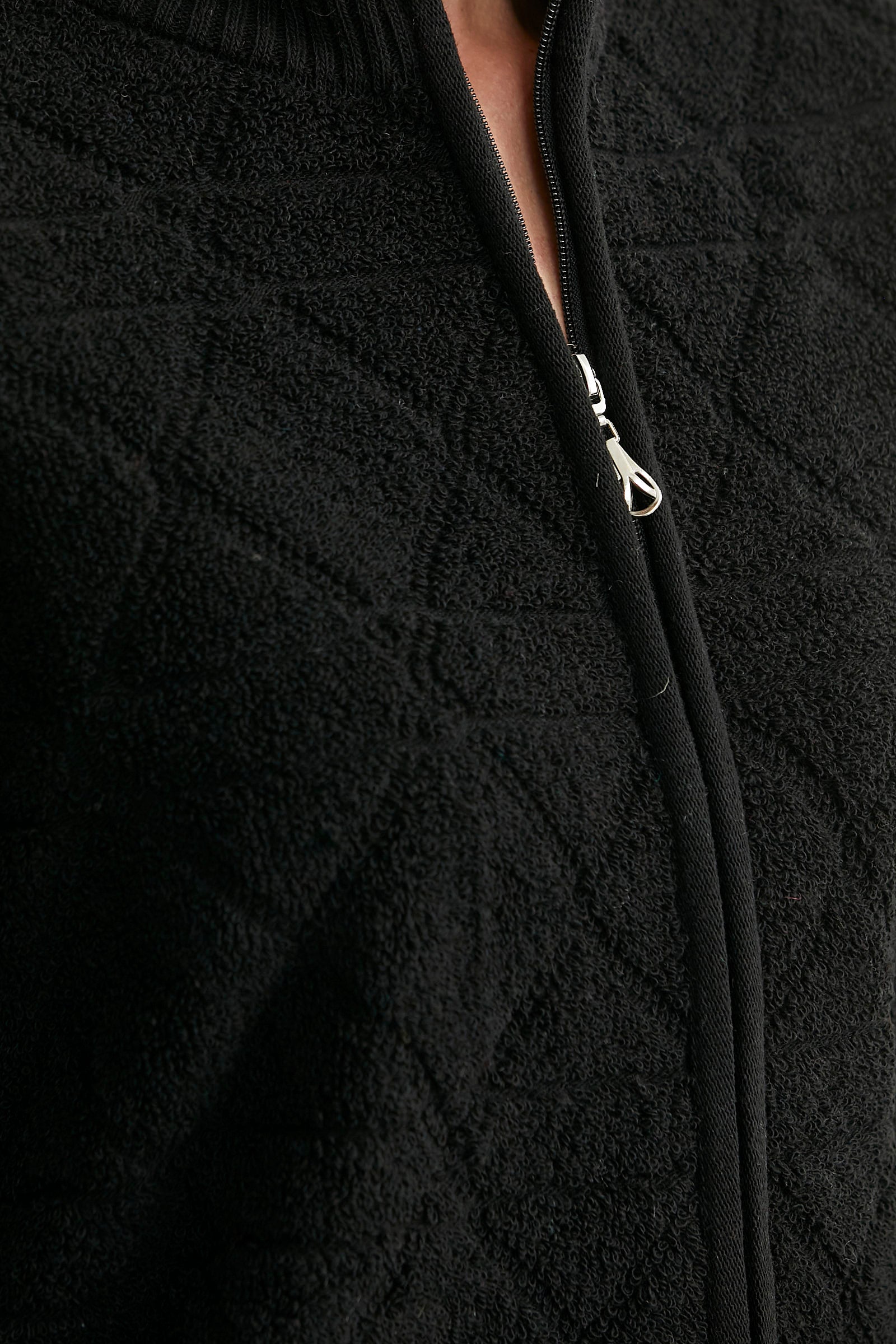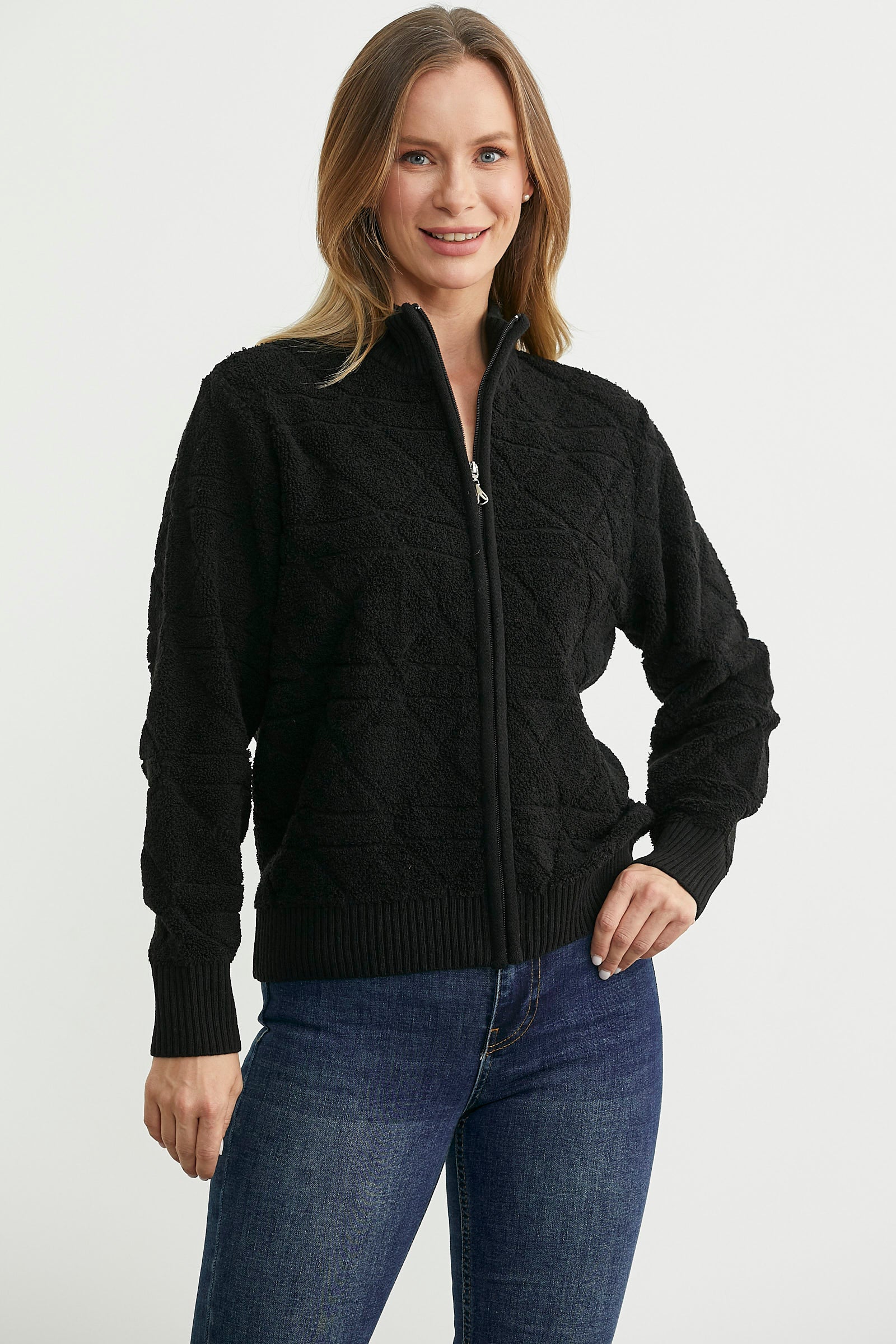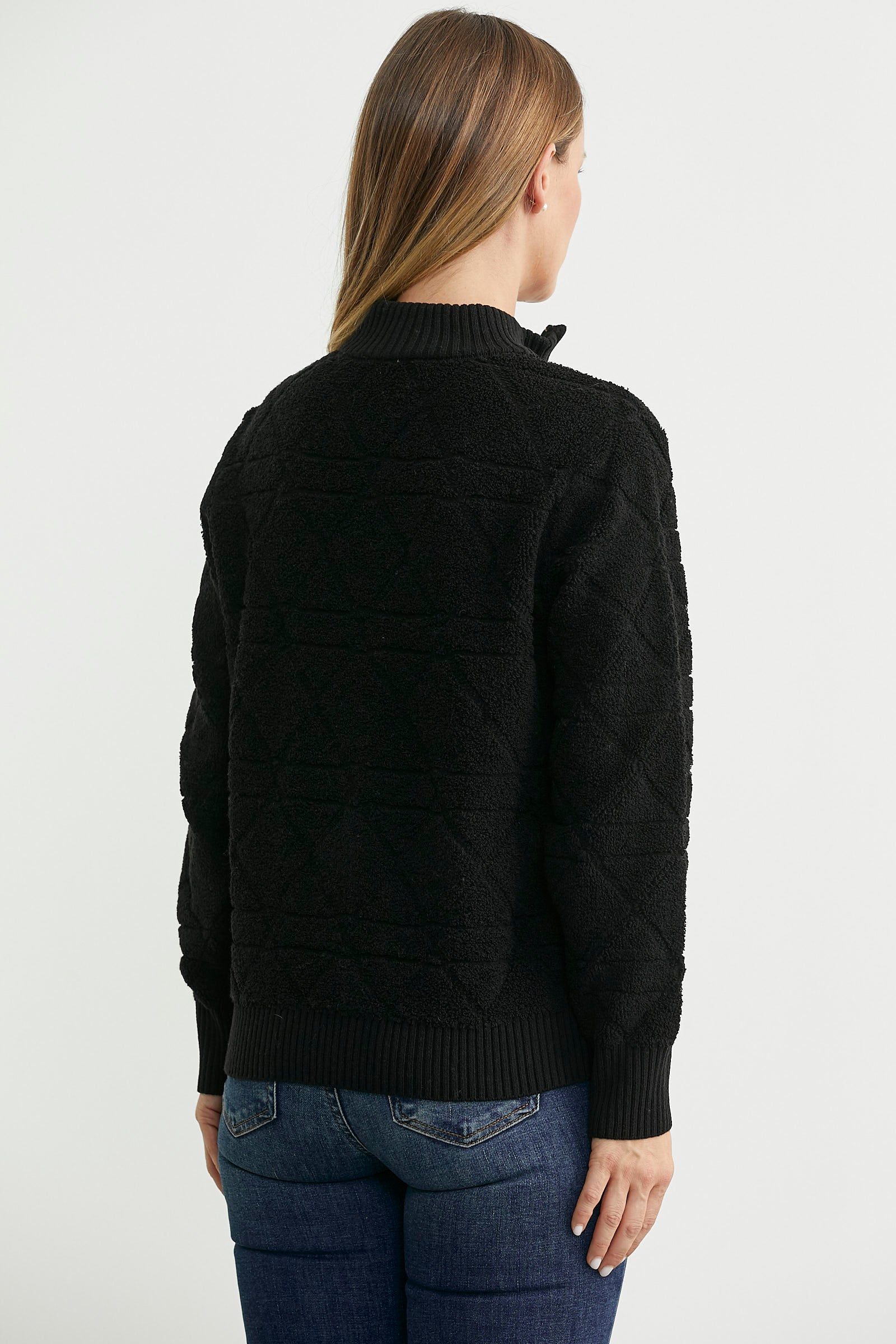 Geometrik Motifli Fermuarlı Yünlü Triko Hırka - Siyah