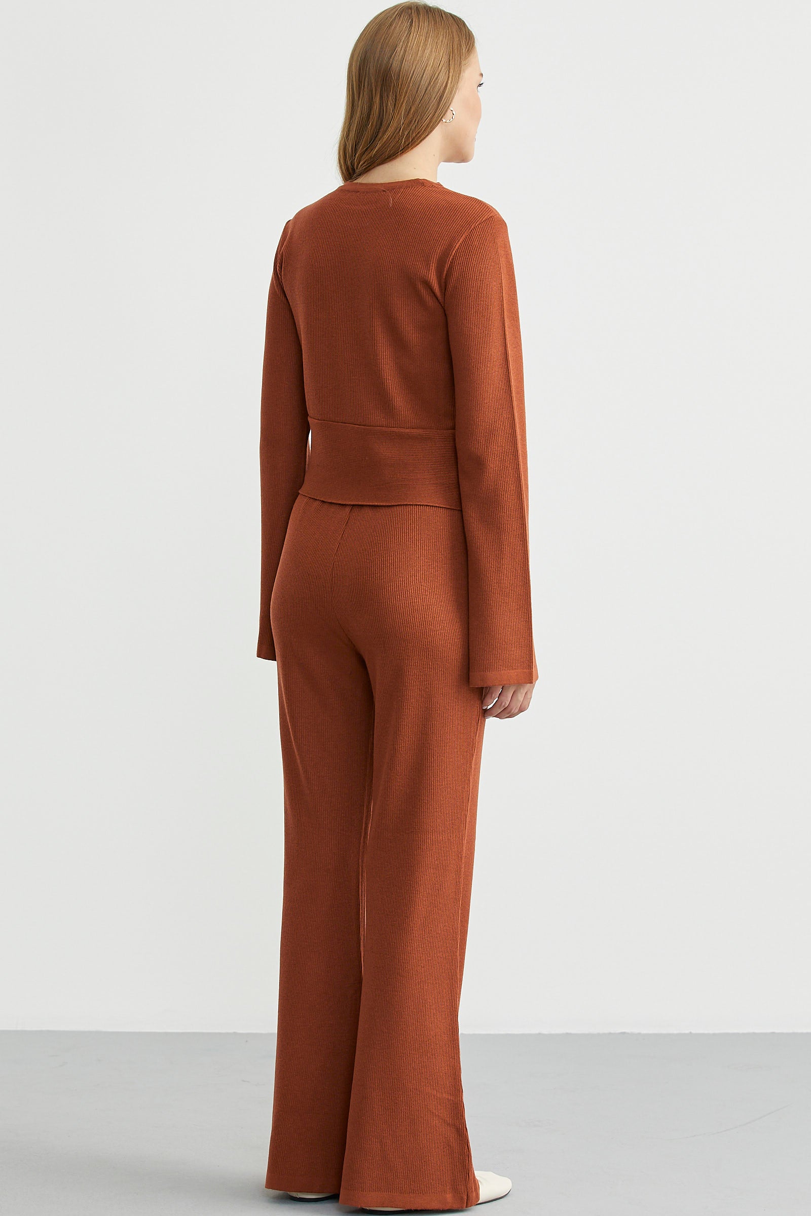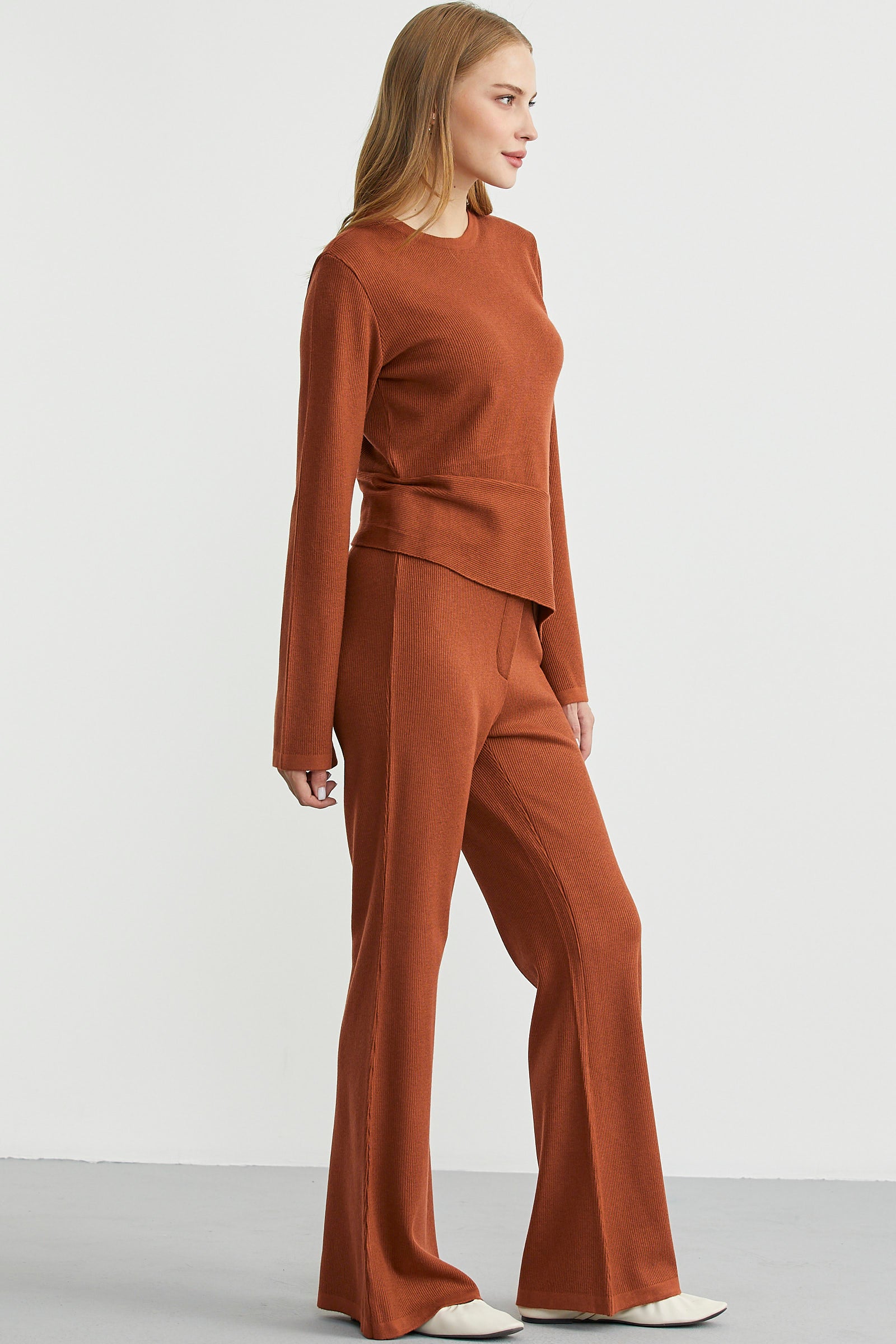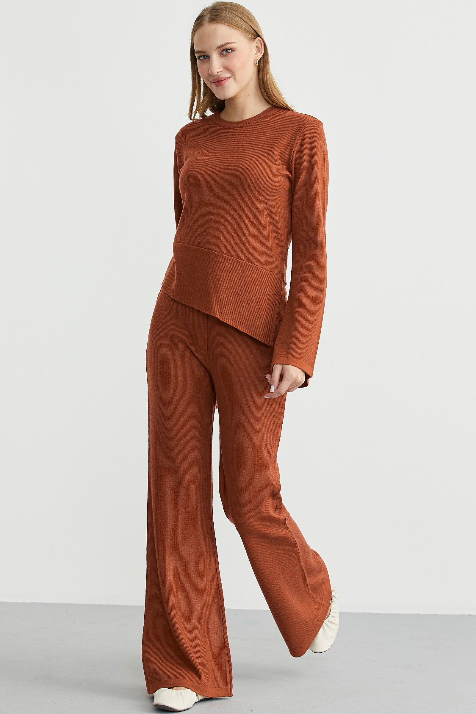 İkili triko set. Verev üst, triko pantolondan oluşmaktadır. Mevsimlik, fitilli modeldir.