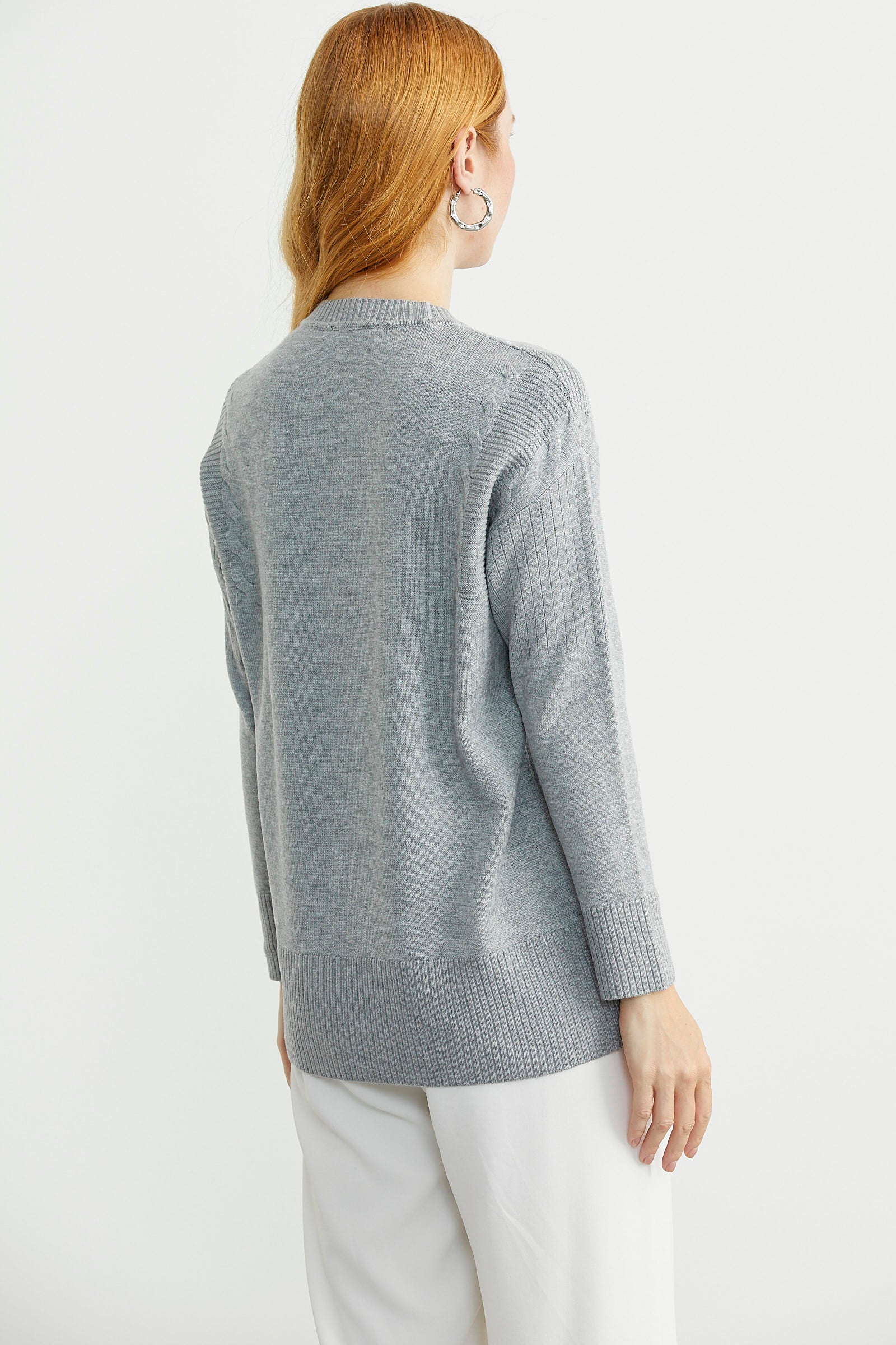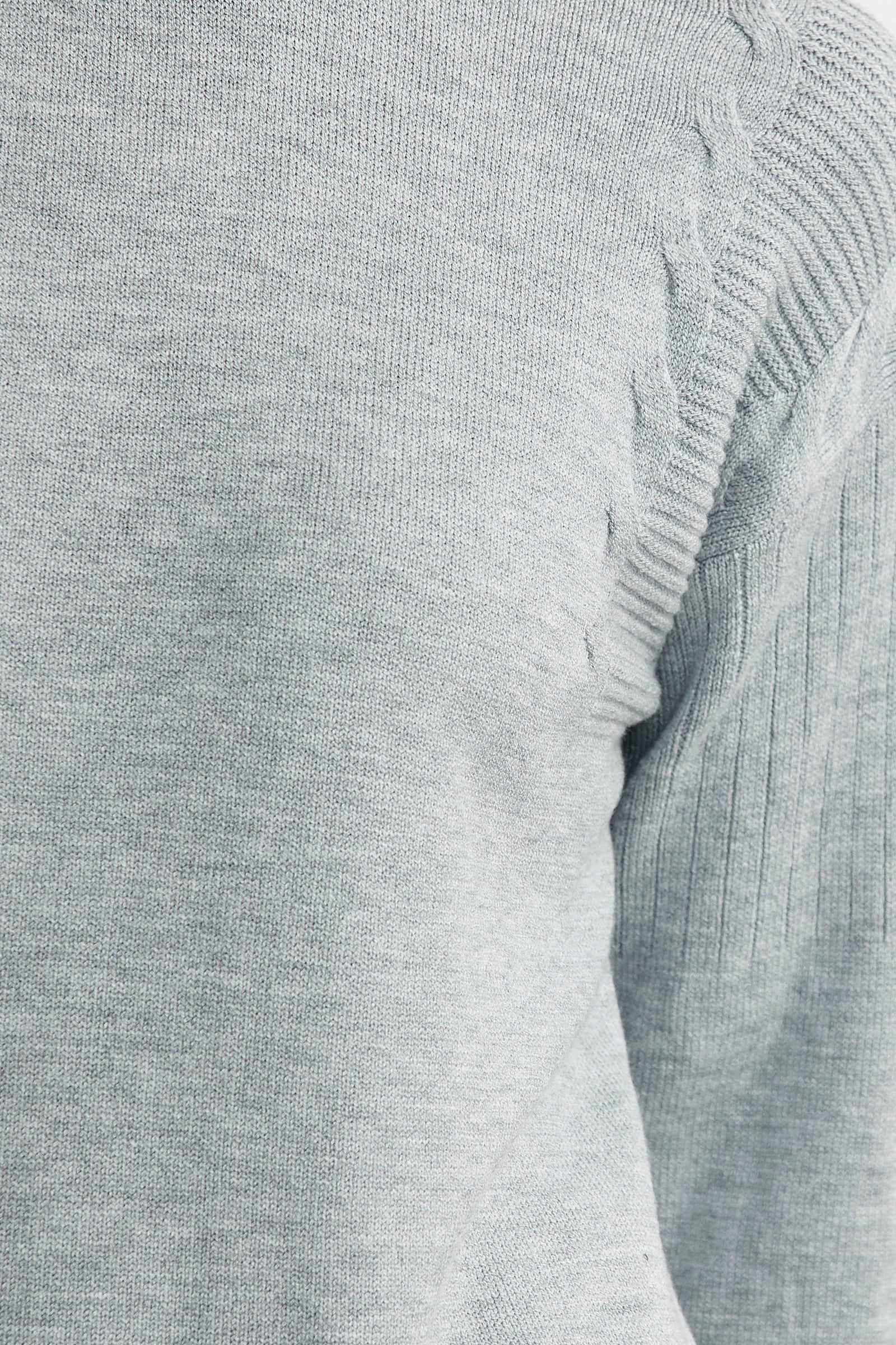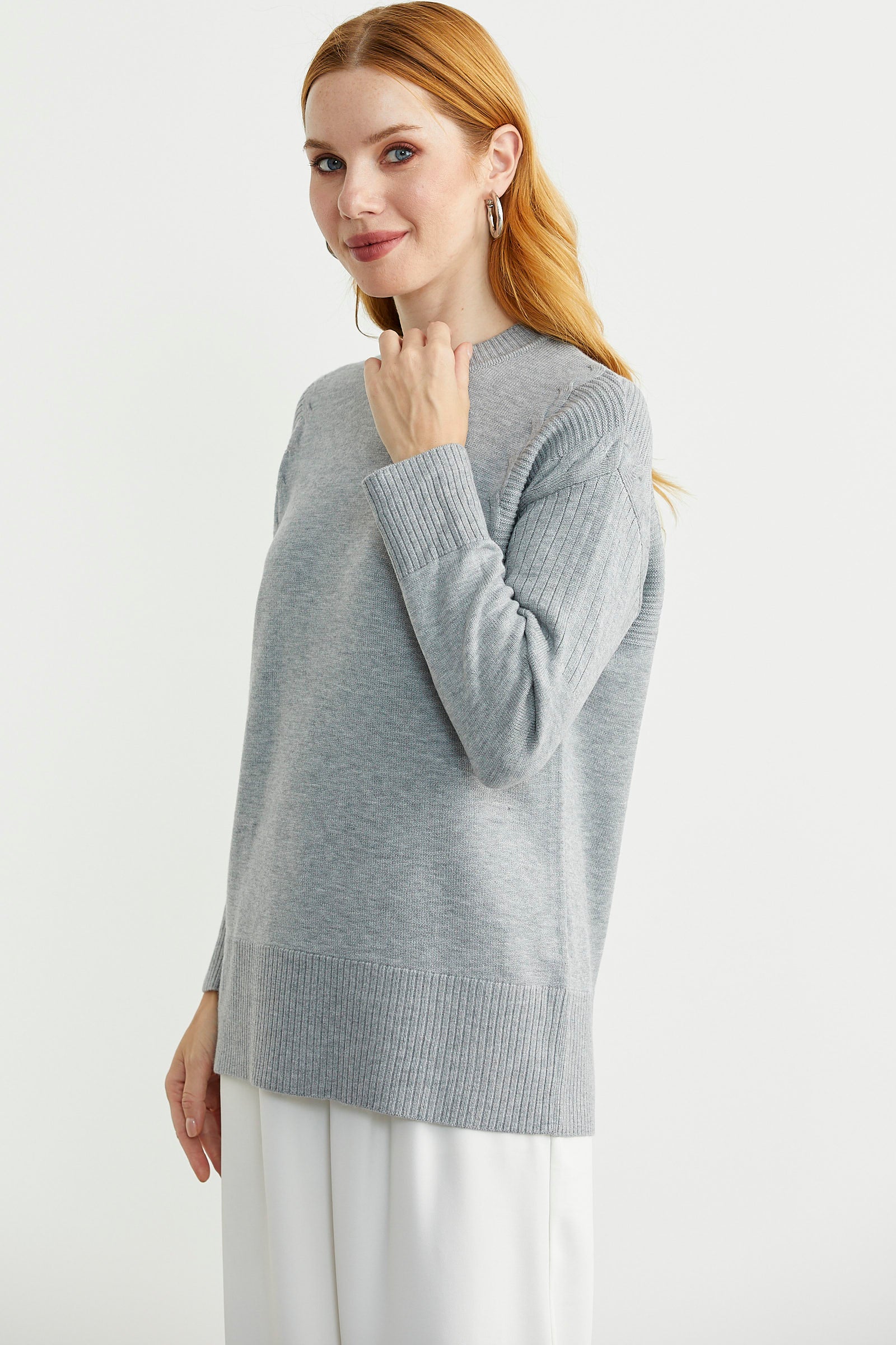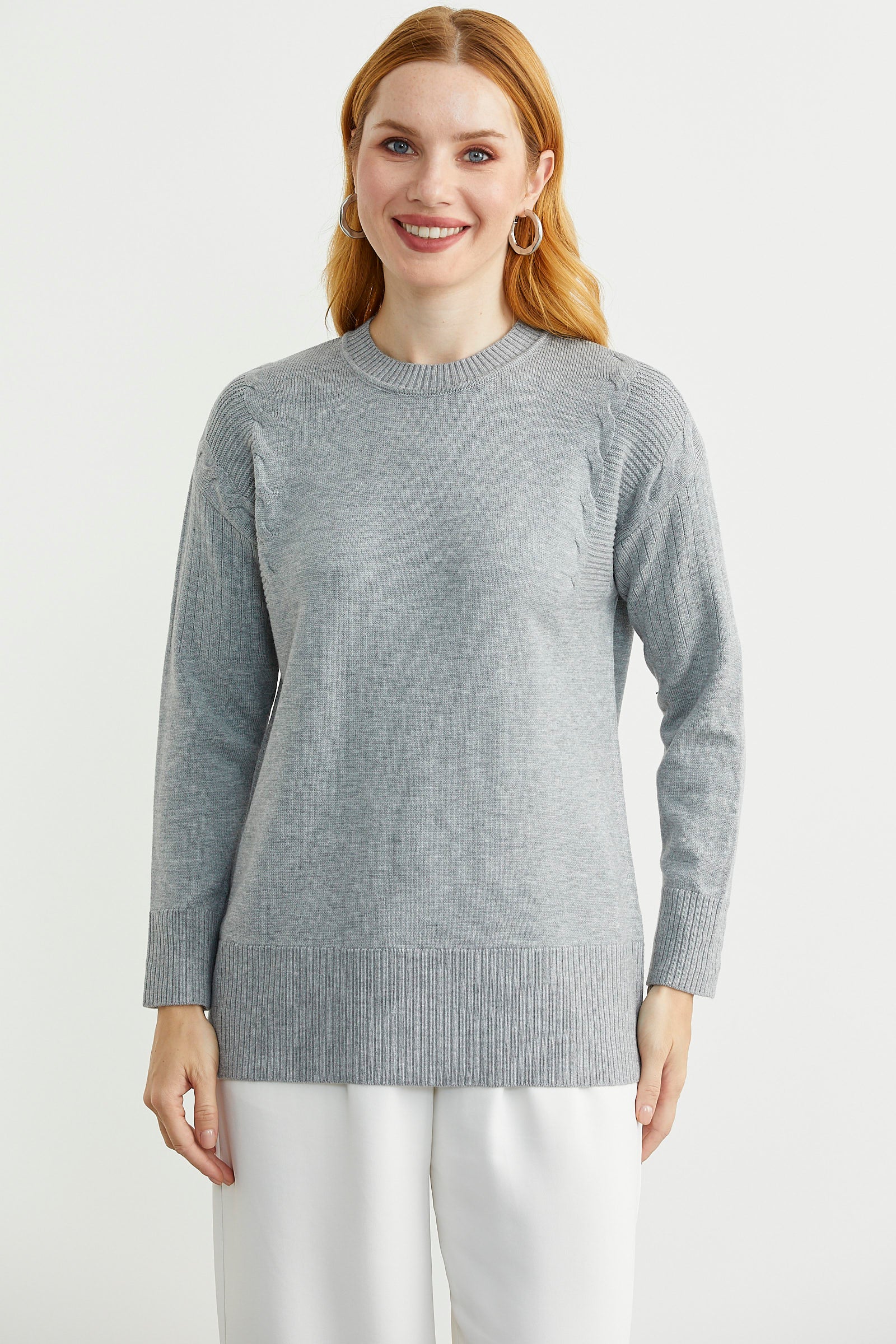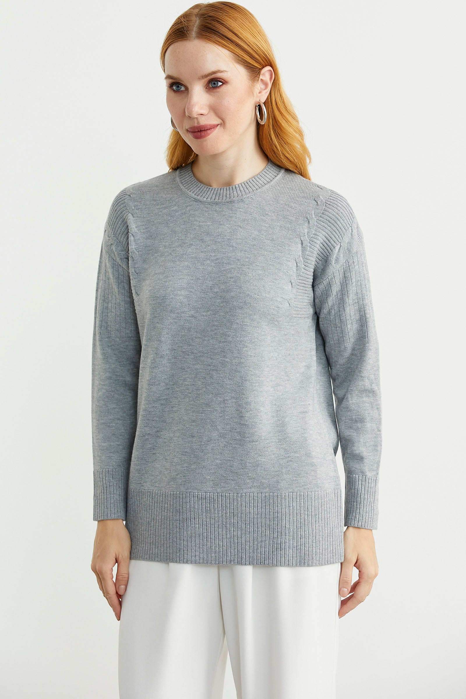 Kol Detaylı Sıfır Yaka Tunik Triko Kazak - Gri