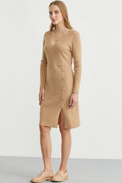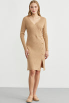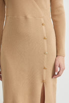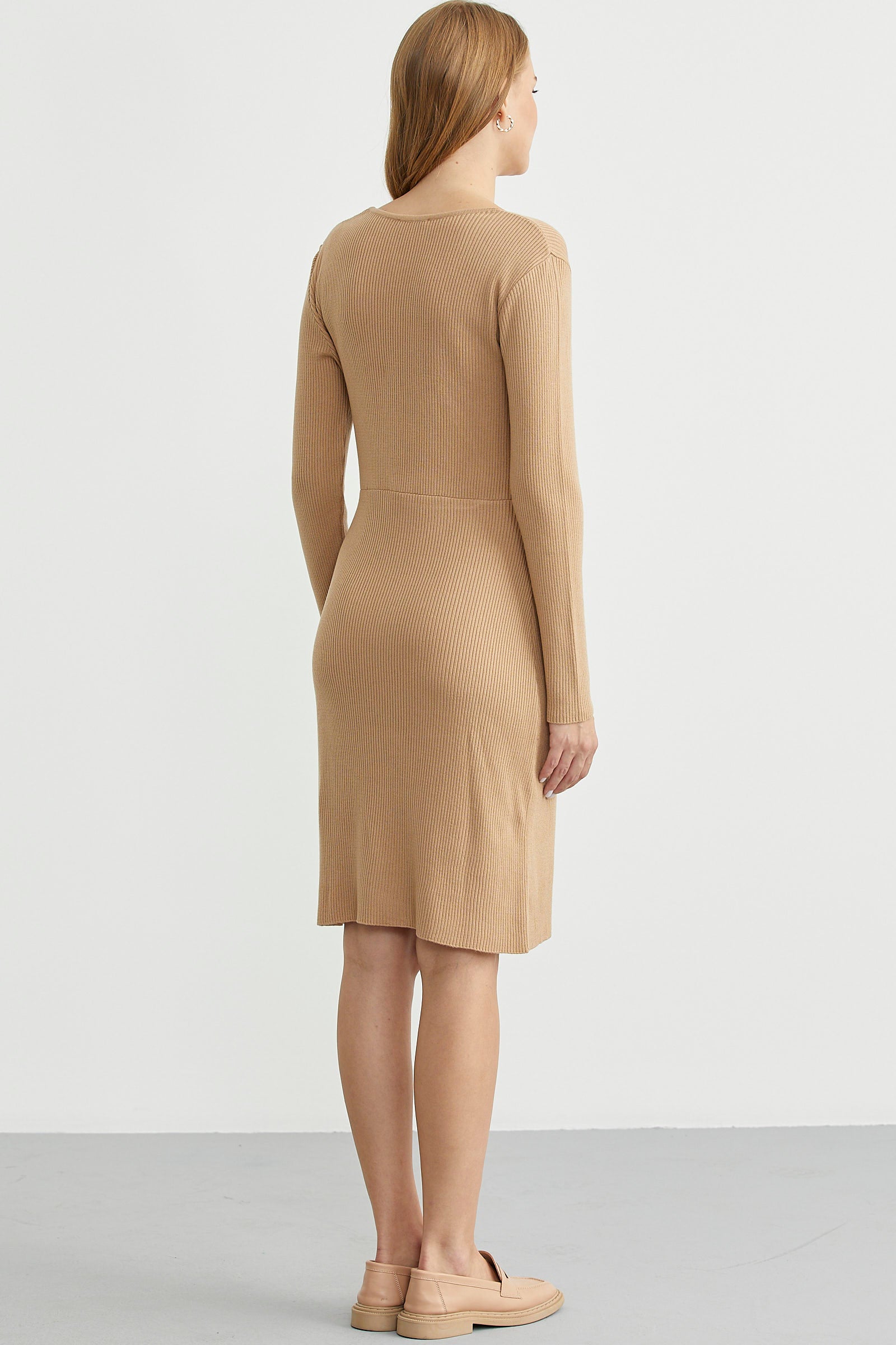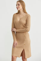 Kruvaze Düğme Detaylı Triko Elbise - Kamel