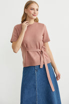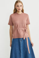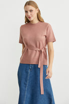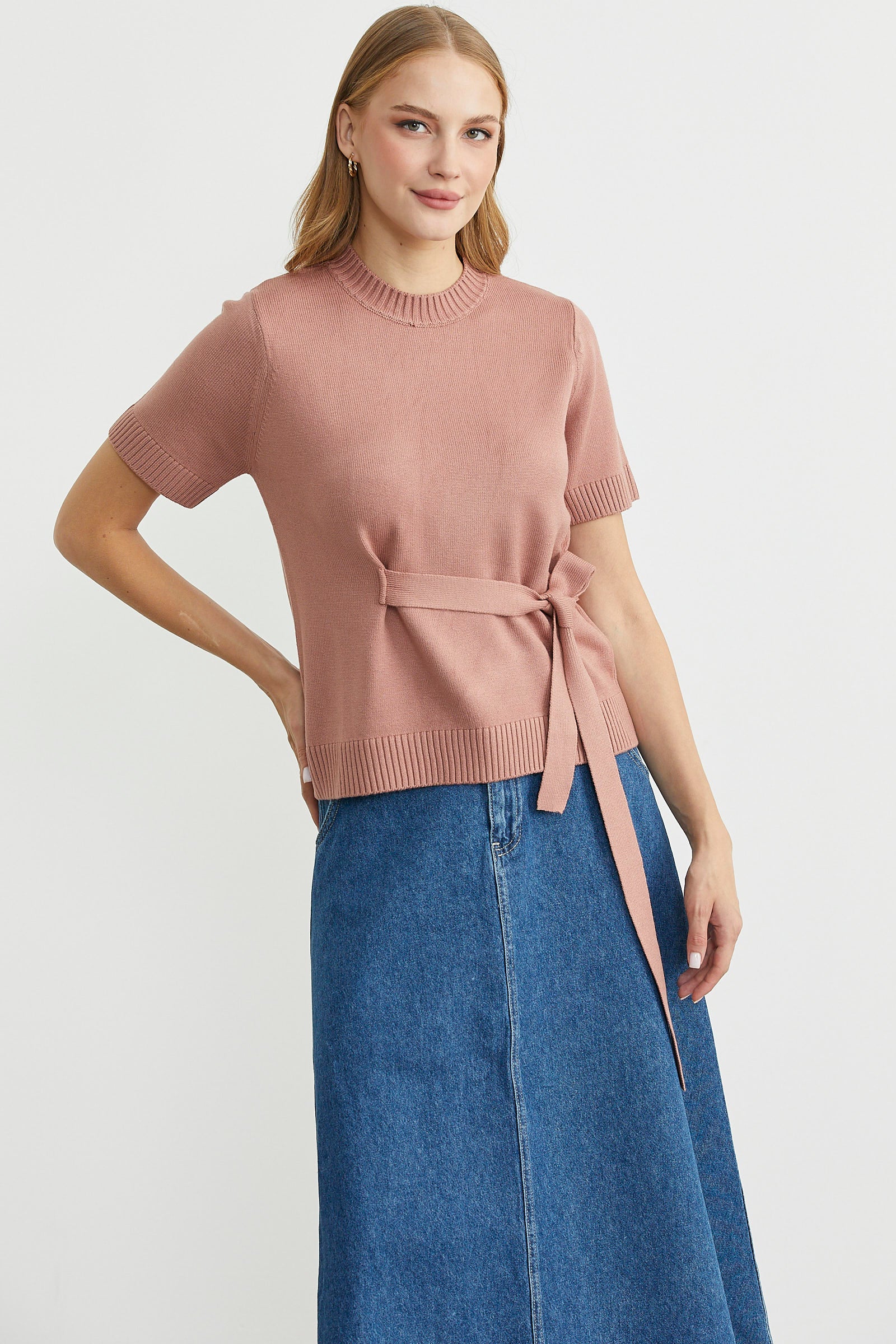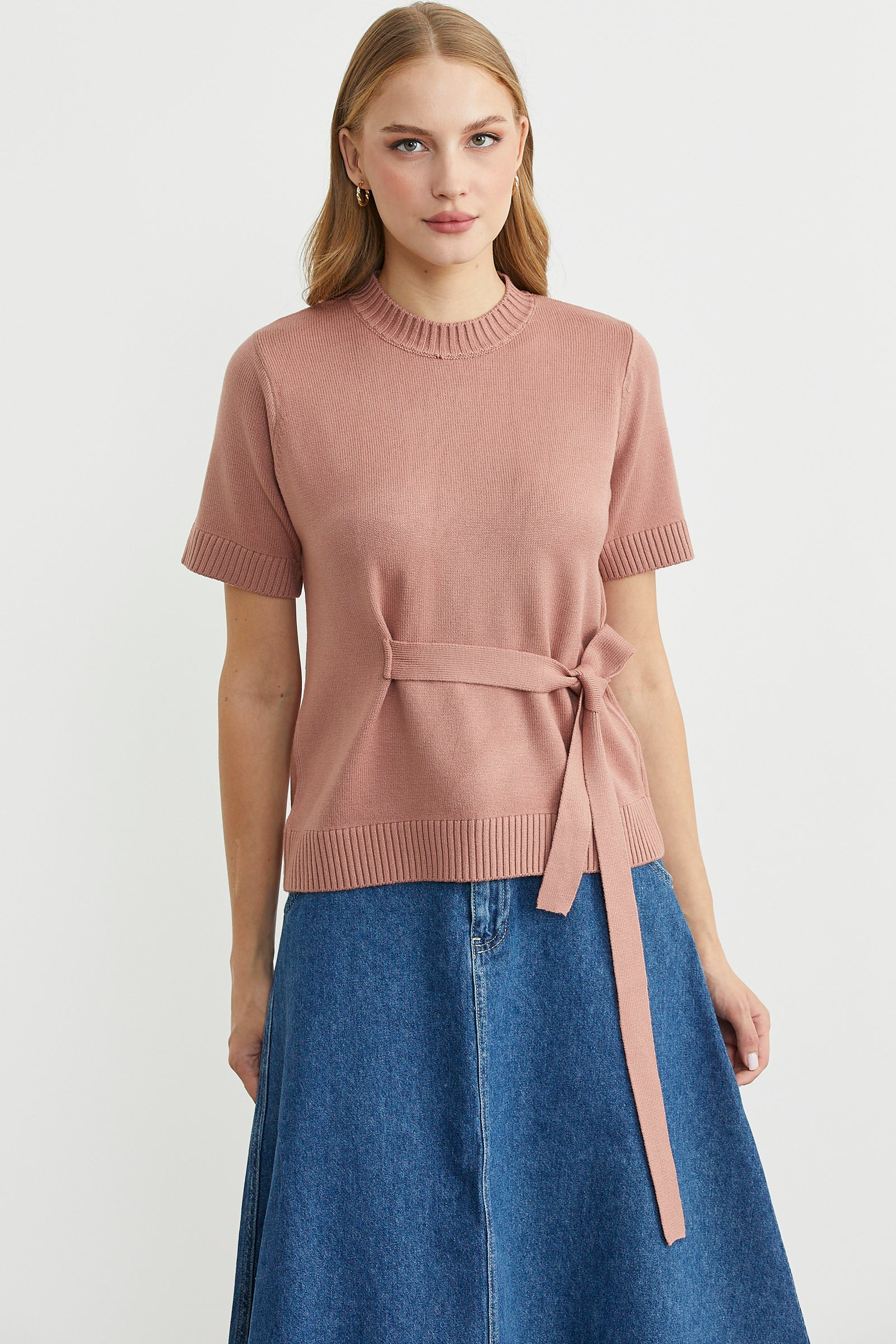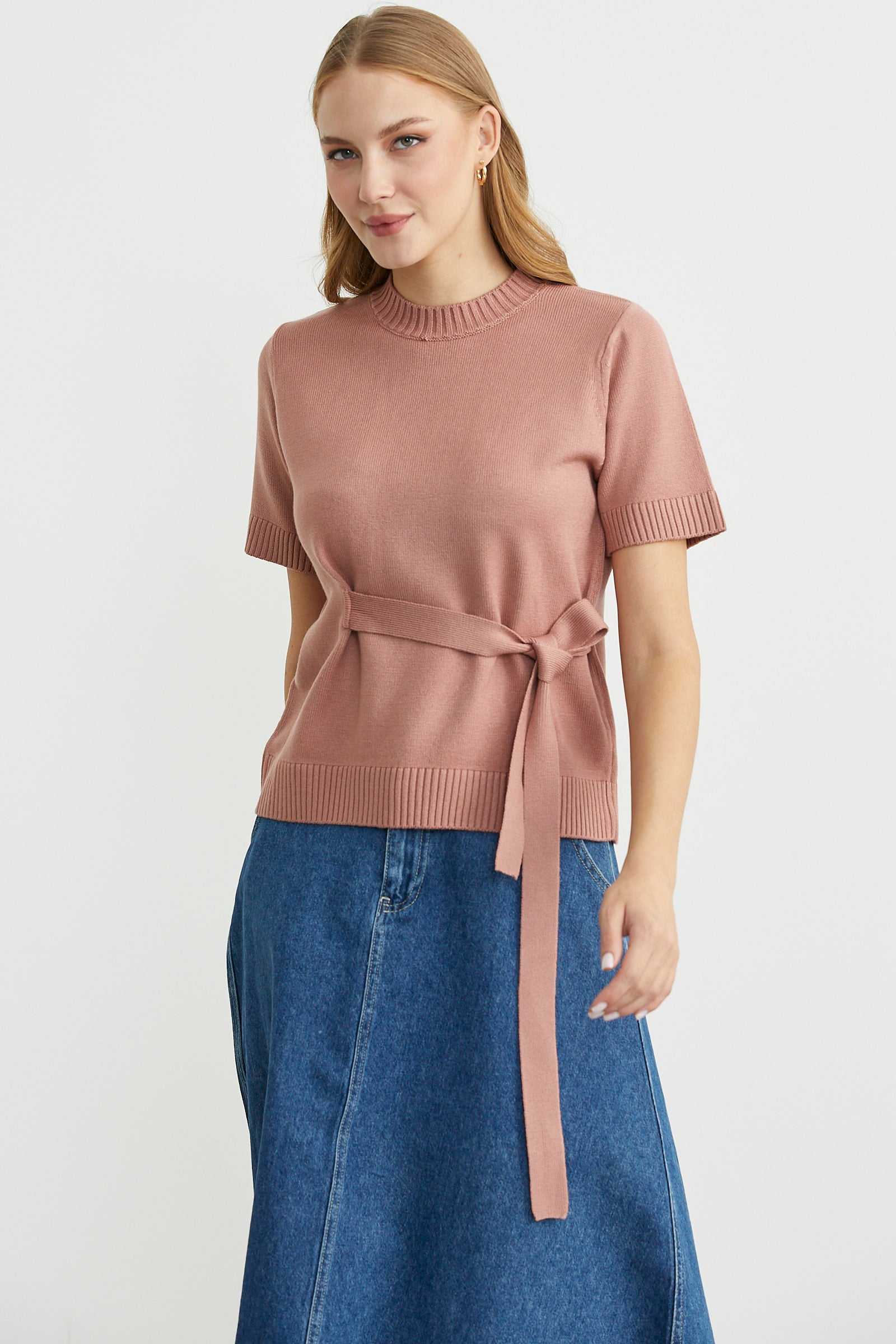 Kuşaklı Kısa Kol Triko Kazak - Gül