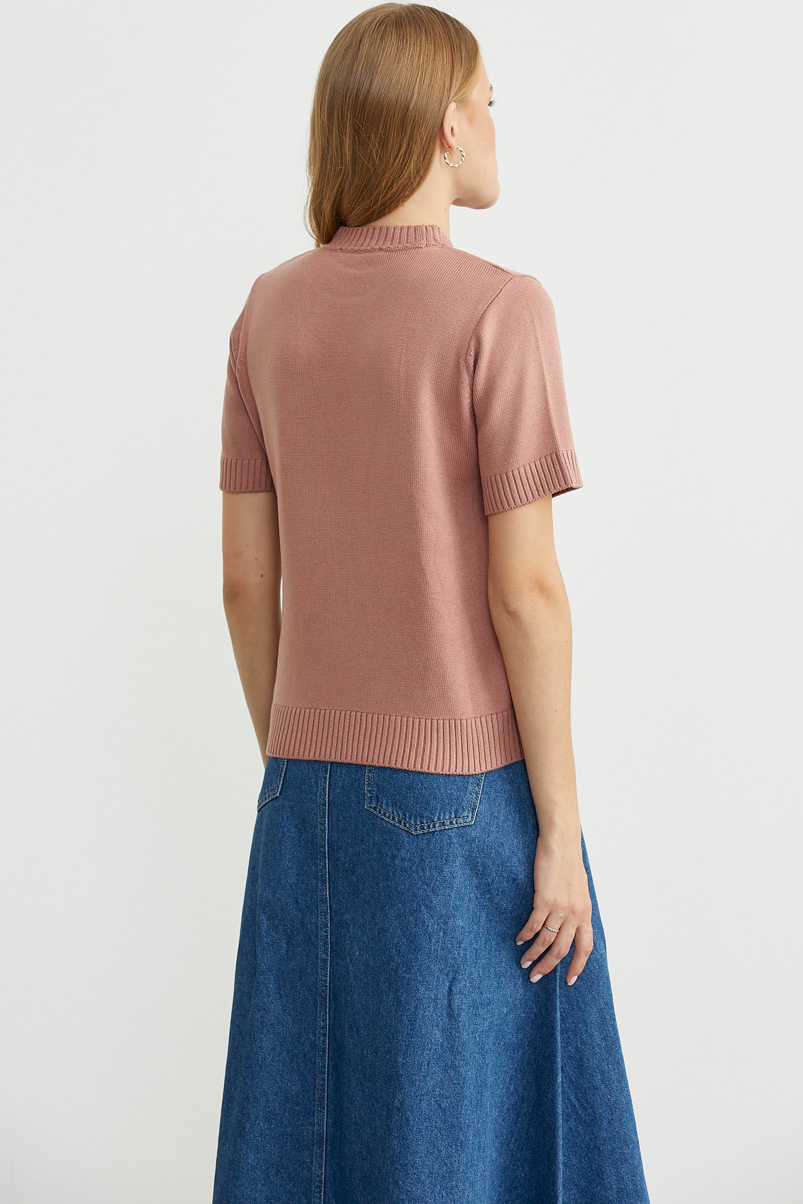 Yuvarlak yüksek yakalı triko kazak, kısa kollu. Belden bağlanan kuşak detayına sahip, yumuşak dokulu.